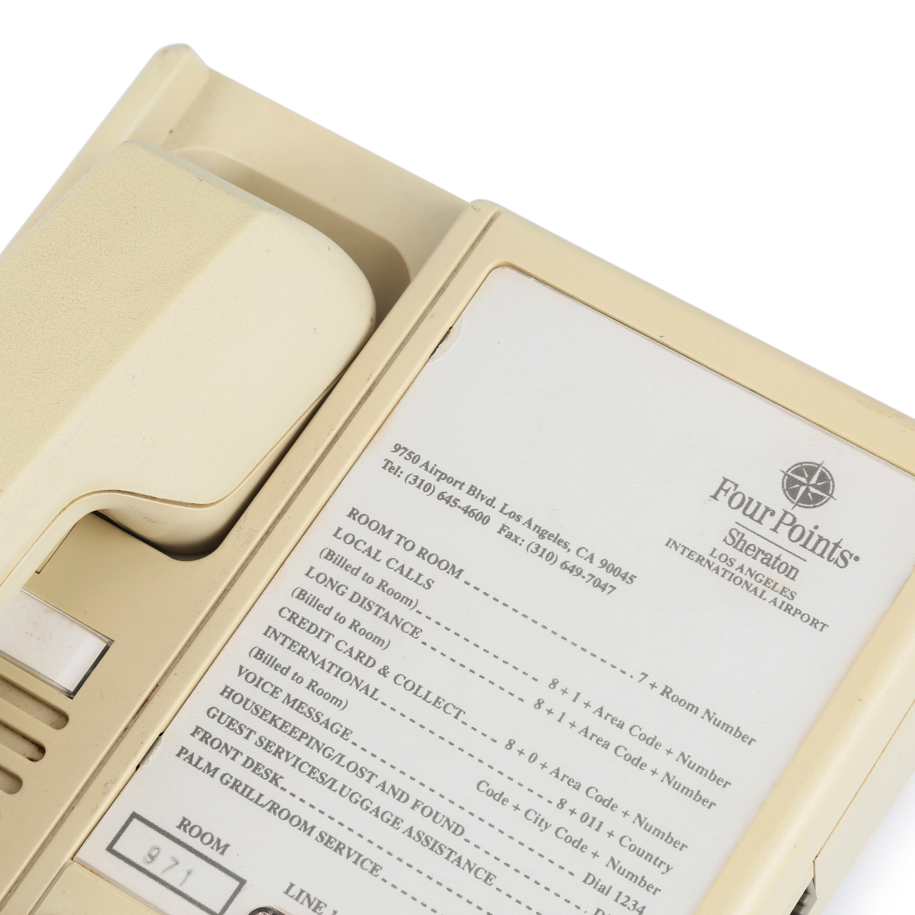 Details: Tan / cream hotel room telephone previously used by Sheraton. Dimensions: 3" H x 10" W x 7" D