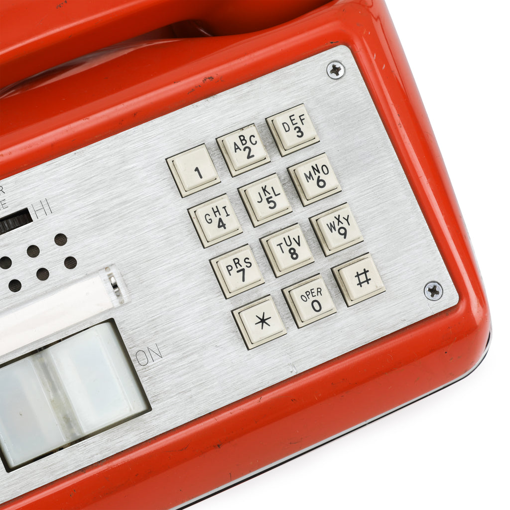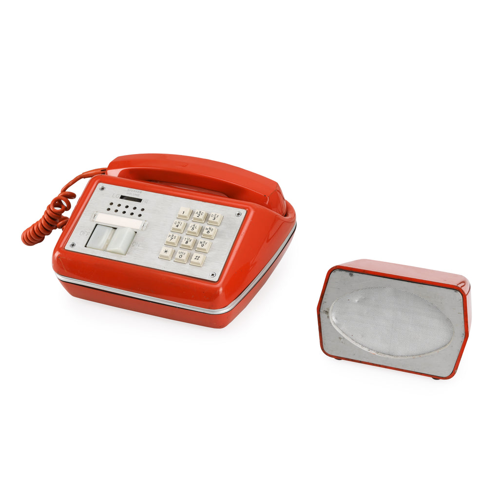 Details: Vintage orange phone with small intercom connected via cable. Dimensions: 5" H x 9.5" W x 8.5" D Speakers : 4" H x 6" W...