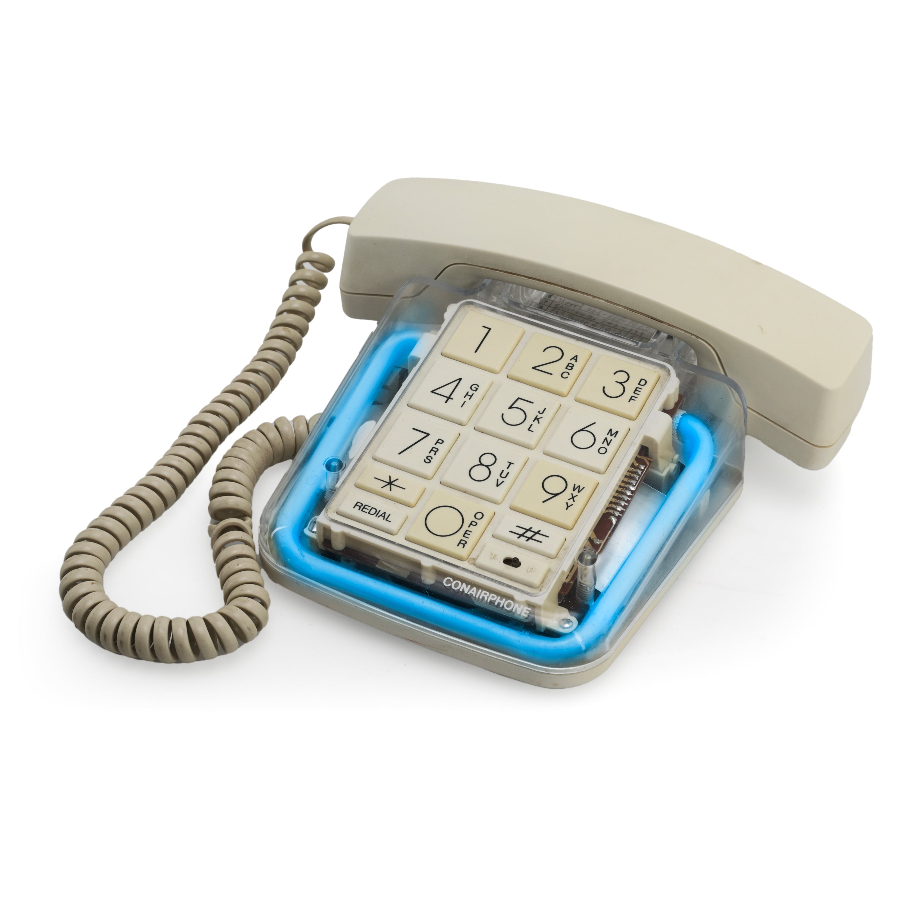 Details: Vintage phone with neon light (works). Cream and clear acrylic shell. Dimensions: 2.5" H x 8" W x 8" D