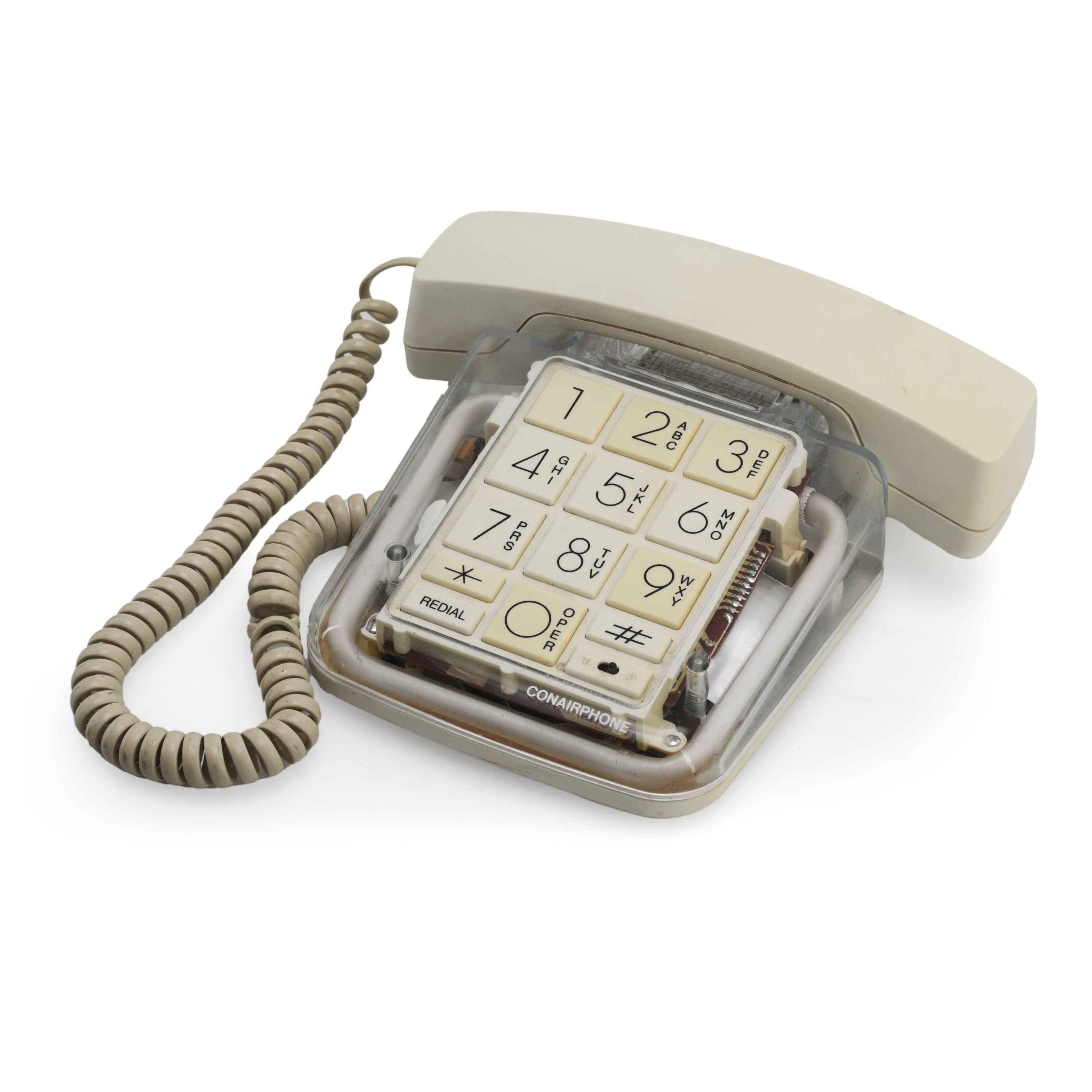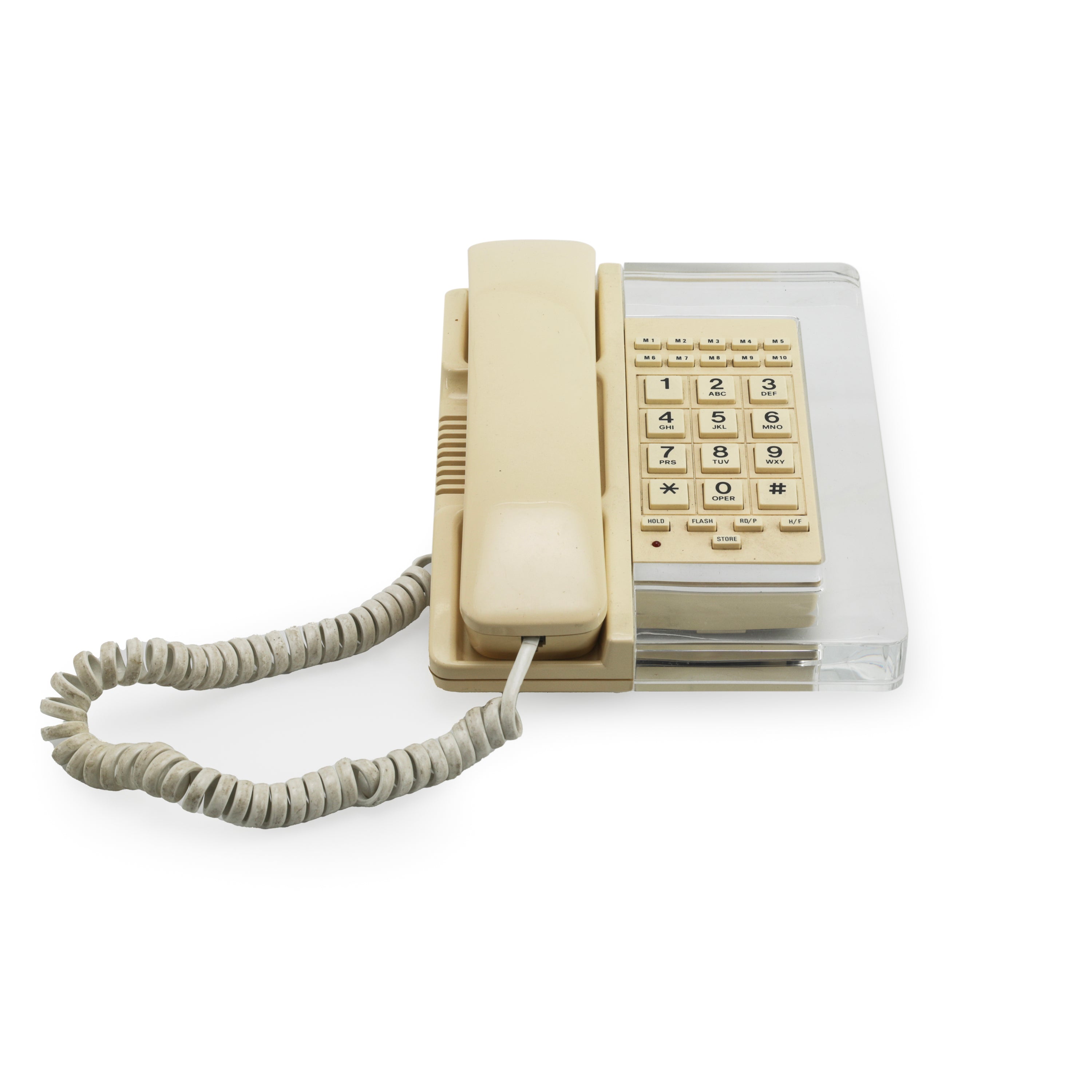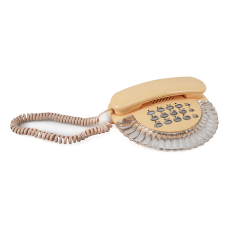 Details: Vintage phone with tan and clear acrylic shell. Dimensions: 3.5" H x 6" W x 8.25" D