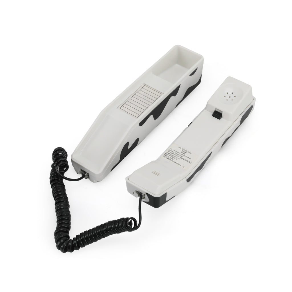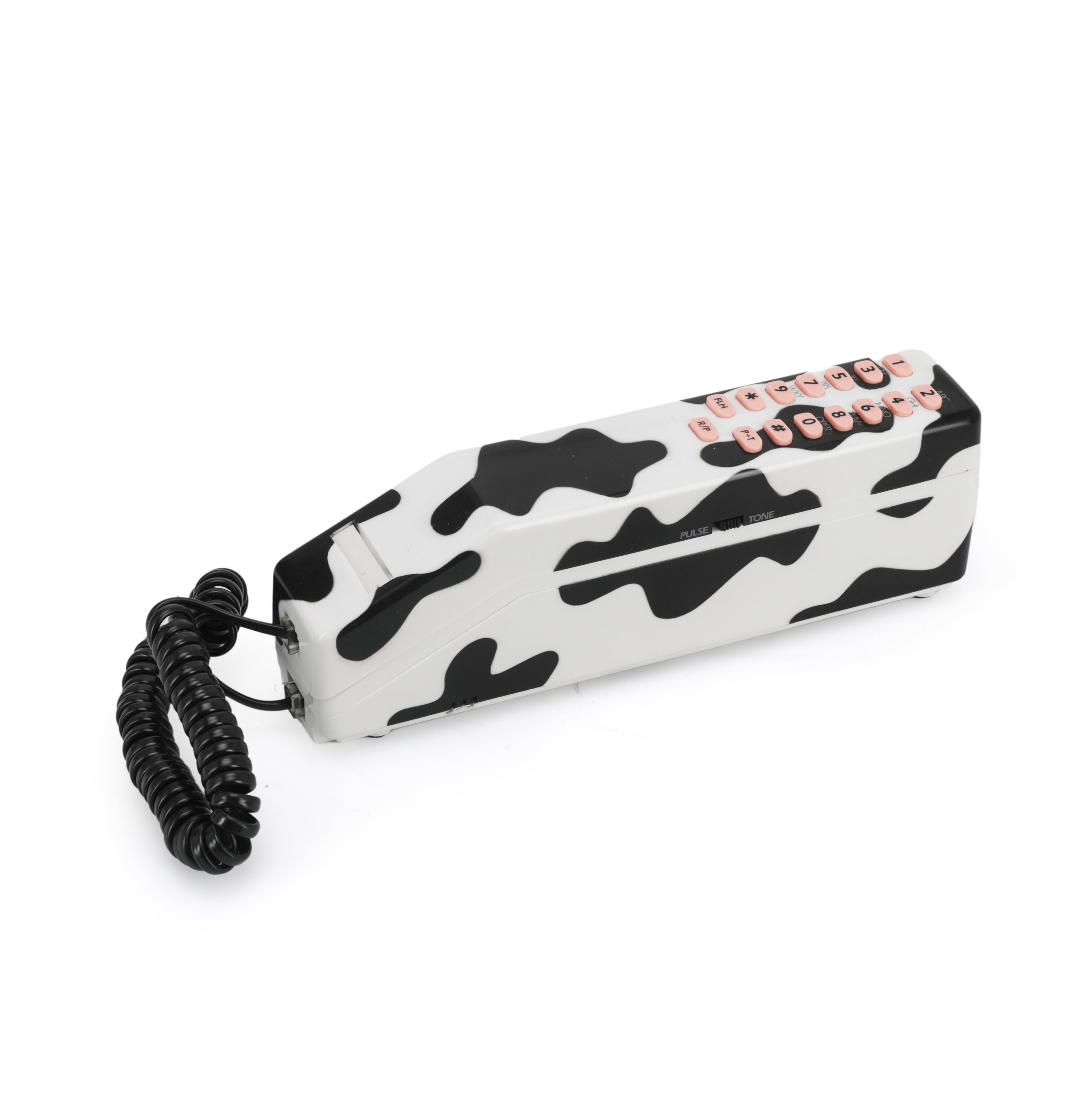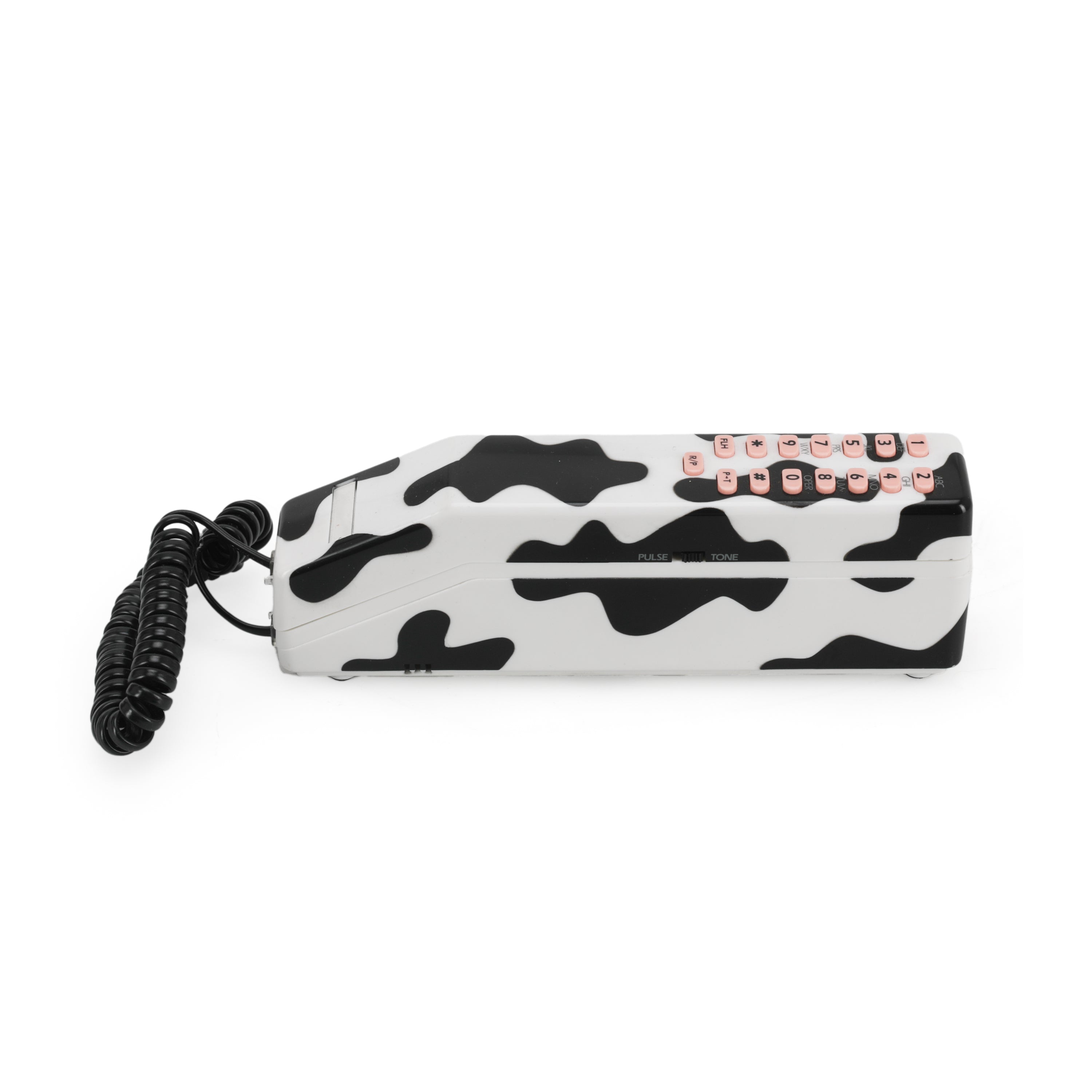 Details: Vintage cow print phone with pink buttons. Dimensions: 2.5" H x 8" W x 1.5" D
