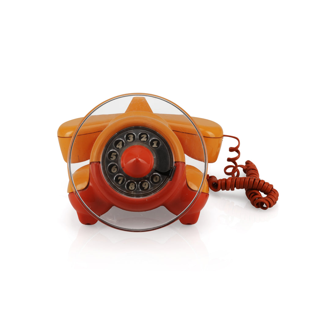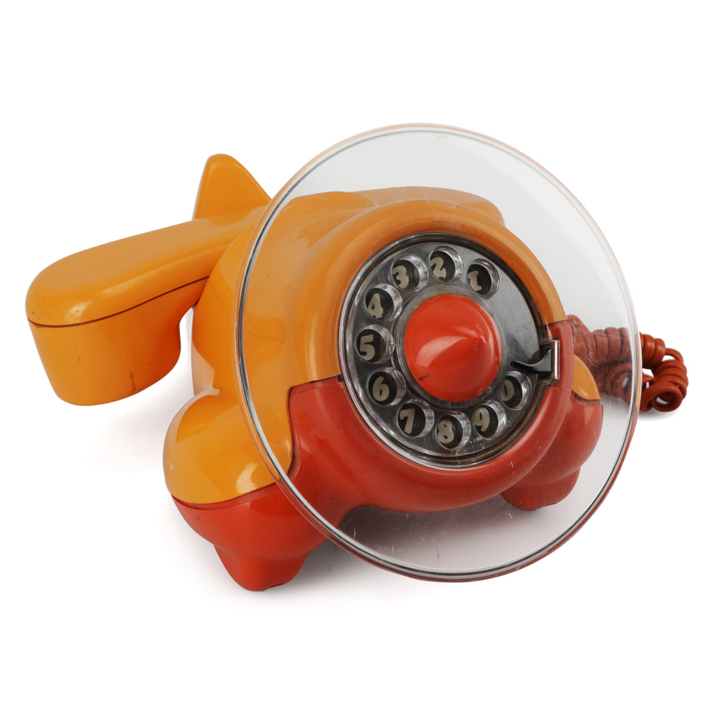 Details: Vintage orange phone with small intercom connected via cable. Dimensions: 5" H x 9.5" W x 8.5" D Speakers : 4" H x 6" W...