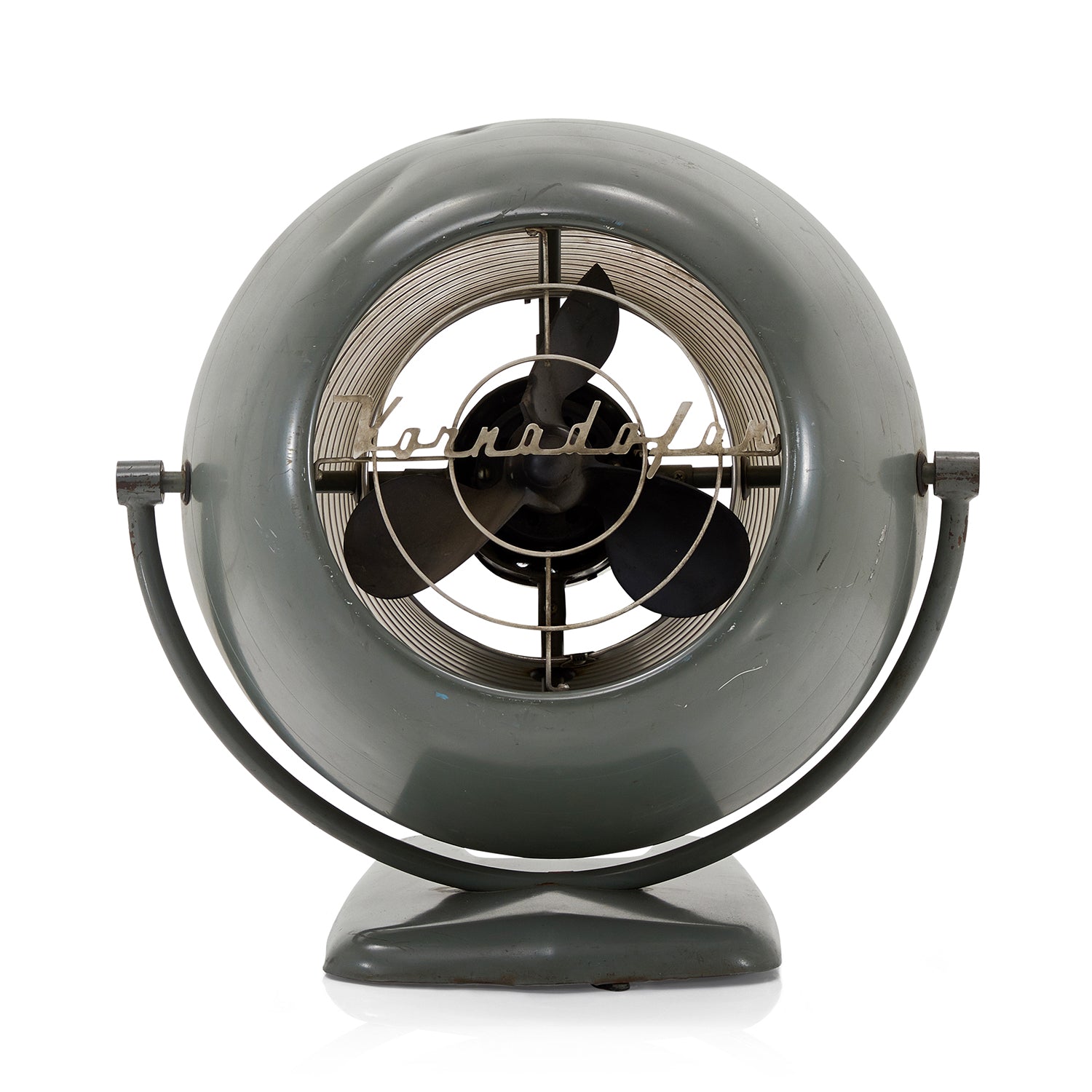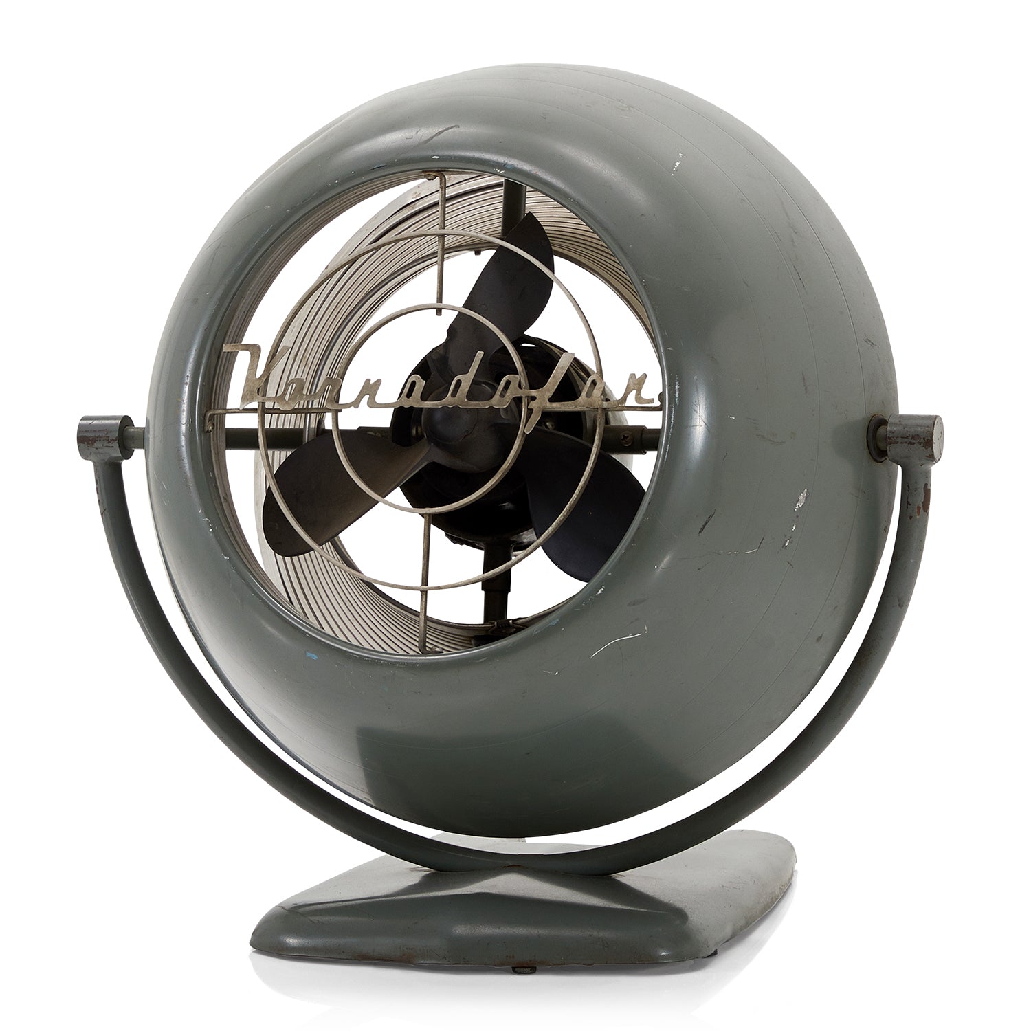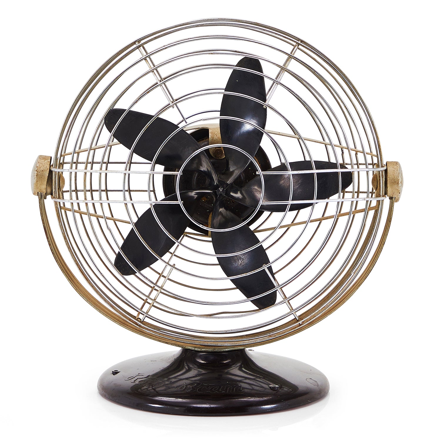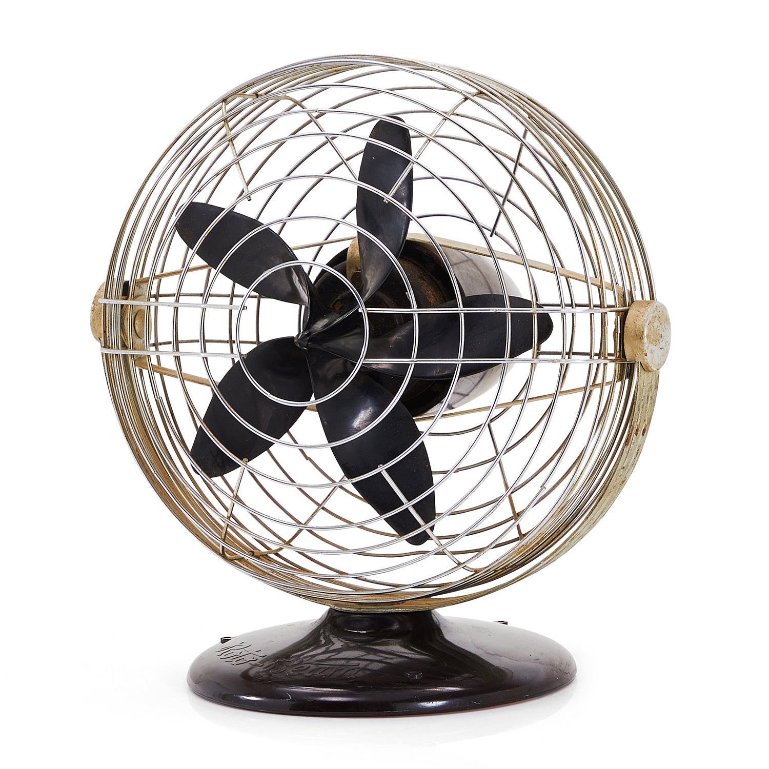 Details: Antique Roto-Beam brand table fan with black base and fan blades and a stout, globe-like shape (Vintage electronic prop with old motor & parts -...
