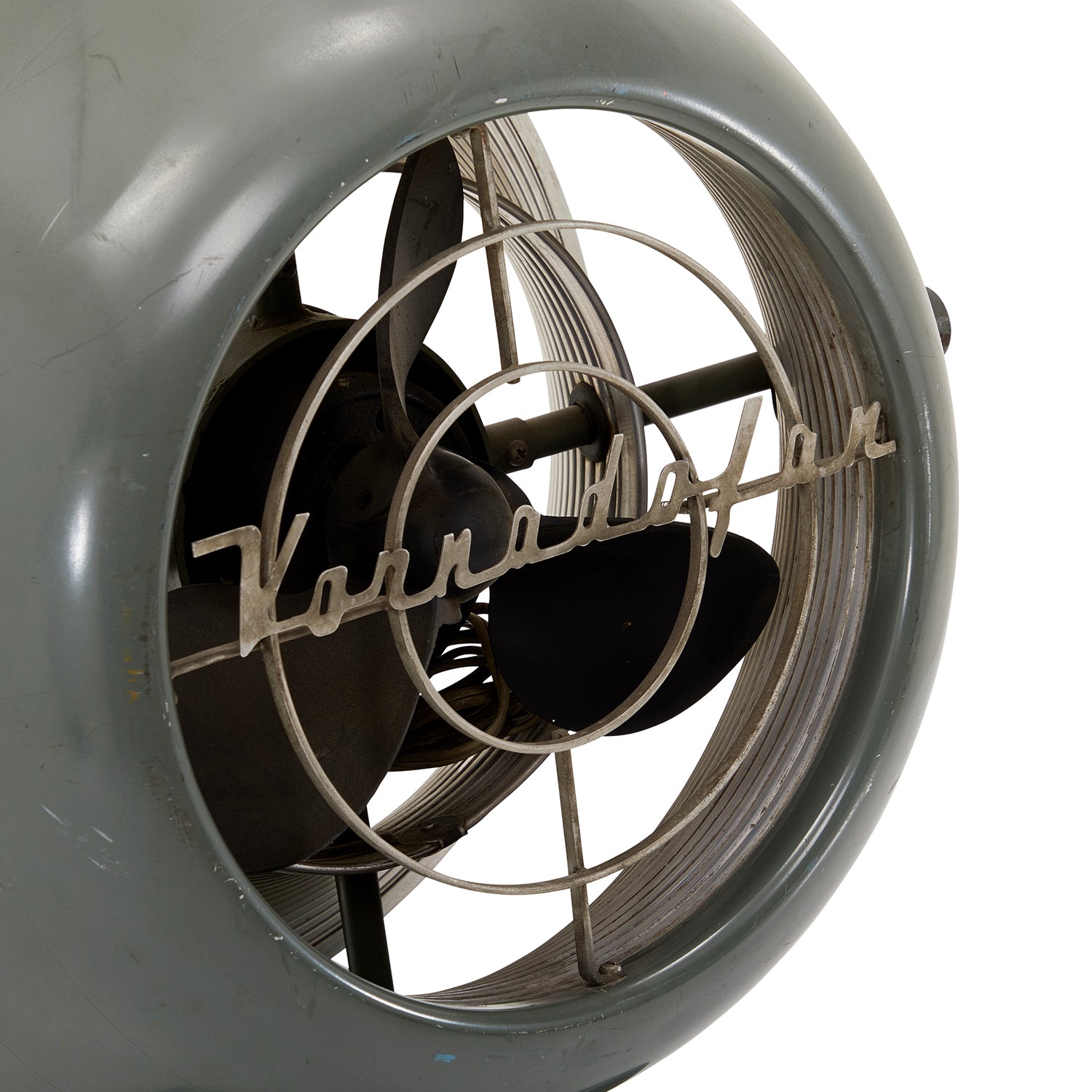 Details: Chrome and black antique standing floor fan with Wolfe logo on the base and "Fresh'nd Aire" logo on the grate (Vintage electronic prop with...