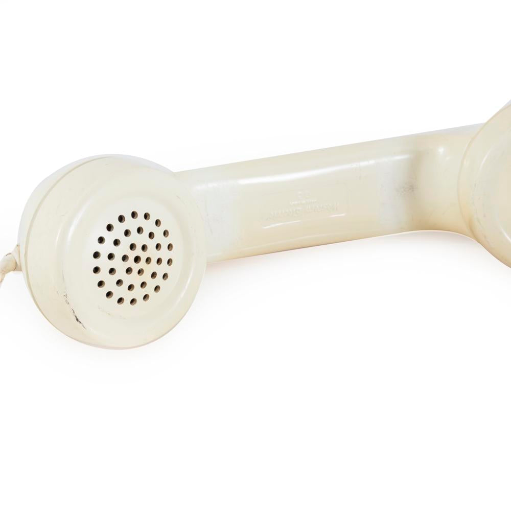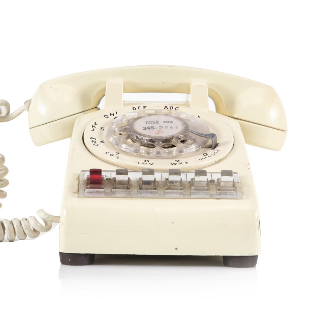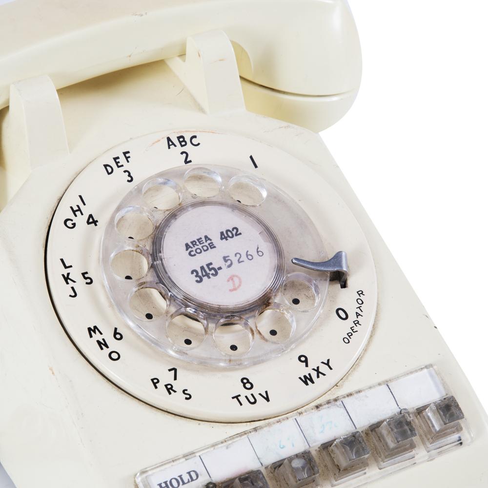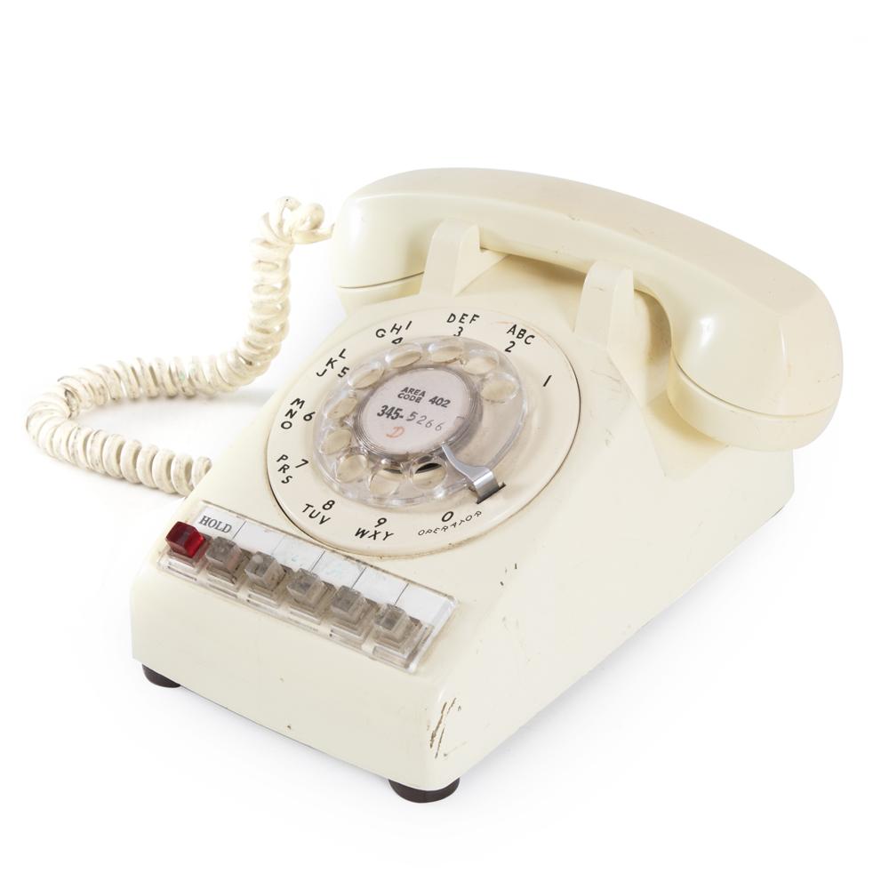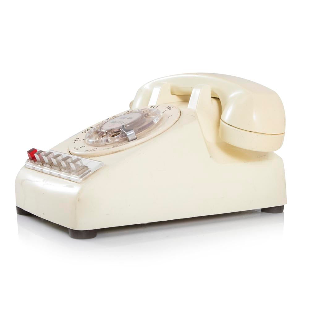 Details: Off-white vintage rotary office phone with transfer and hold buttons