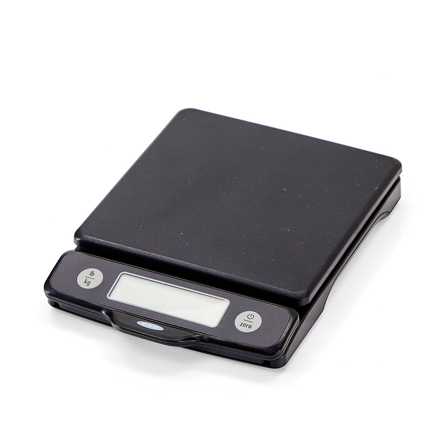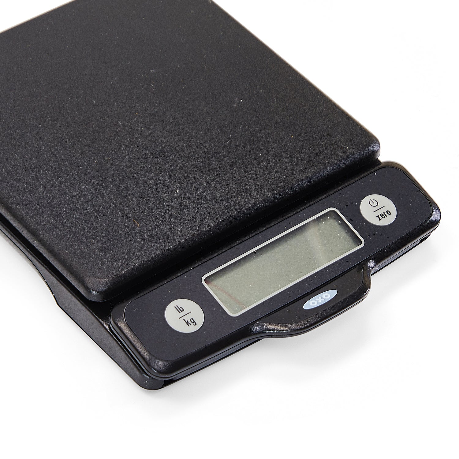 Details: Black electronic kitchen scale made by "OXO" Dimensions: 1" H X 5.5" W X 8" D