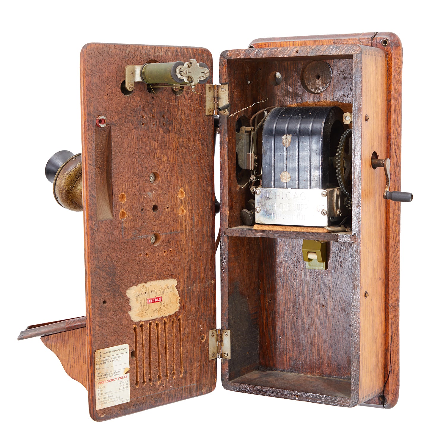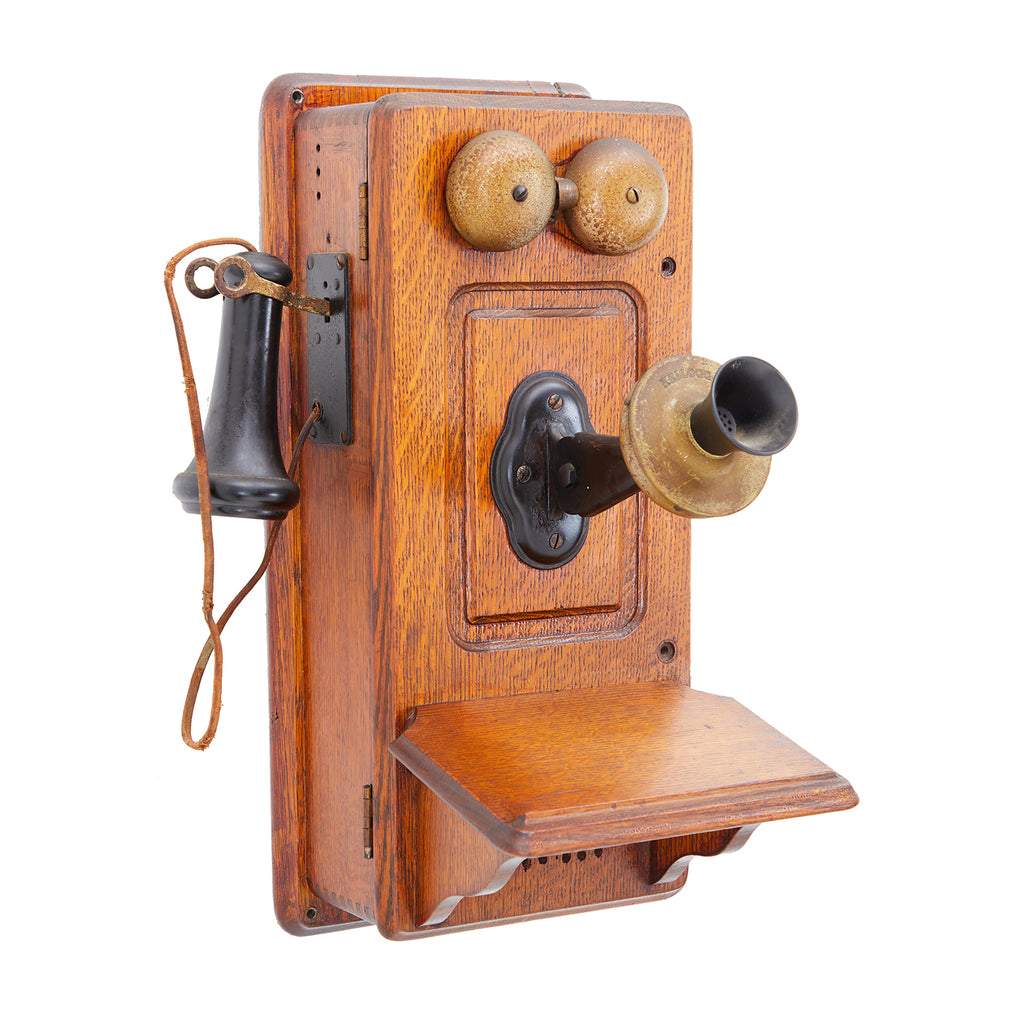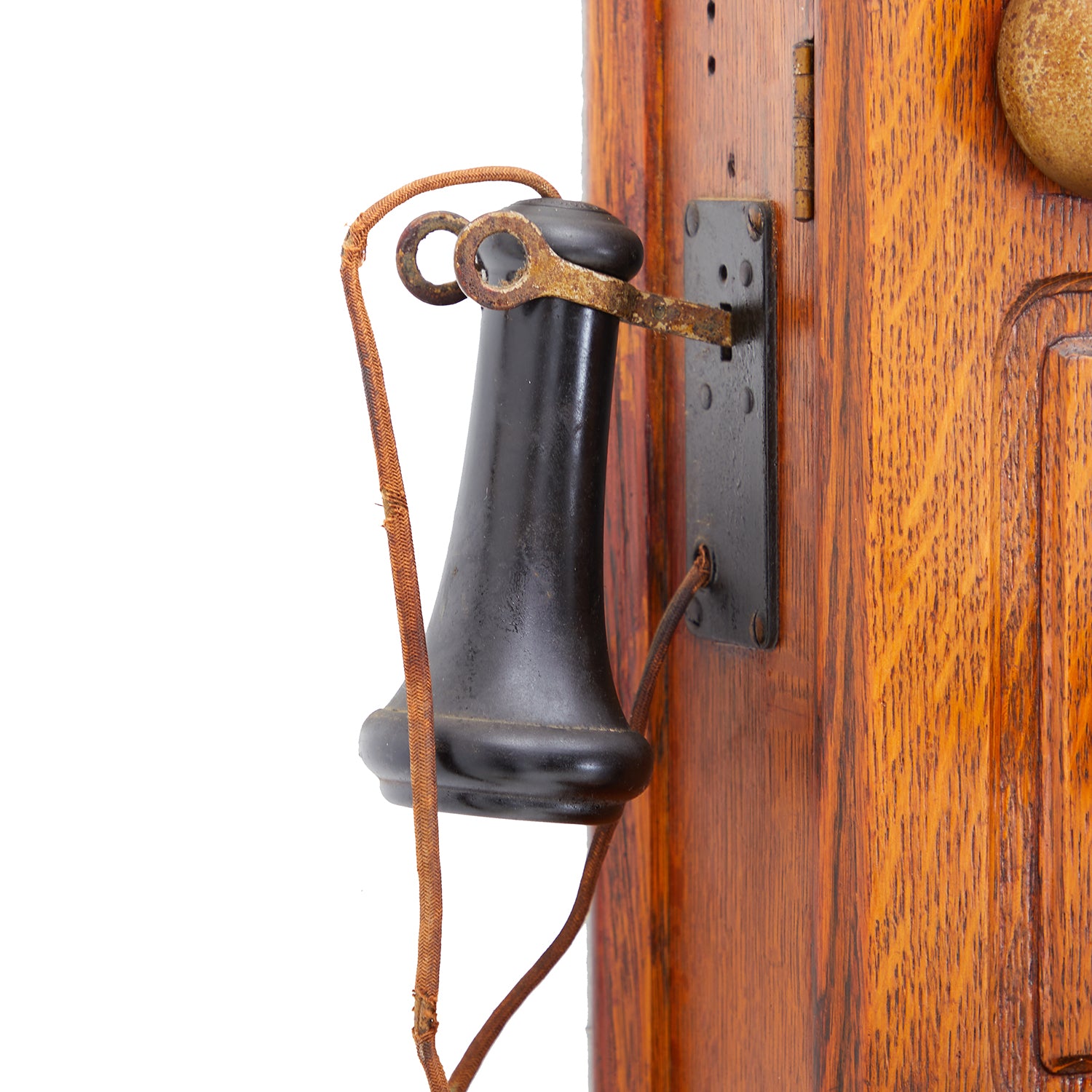 Details: Vintage 19th century telephone with wooden body, bronze bells and black lacquer receiver and mouthpiece