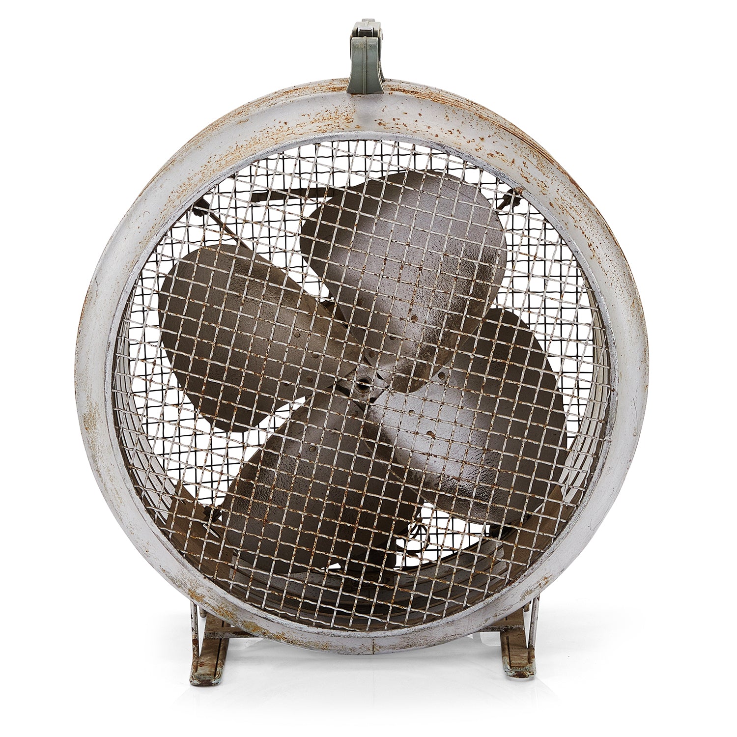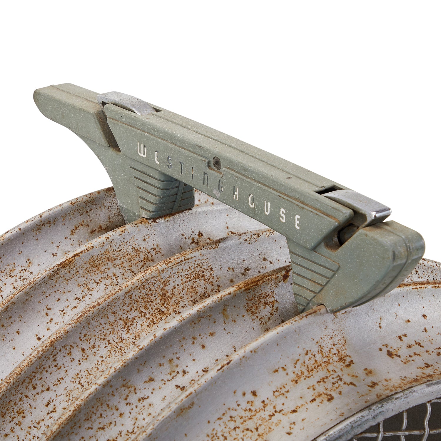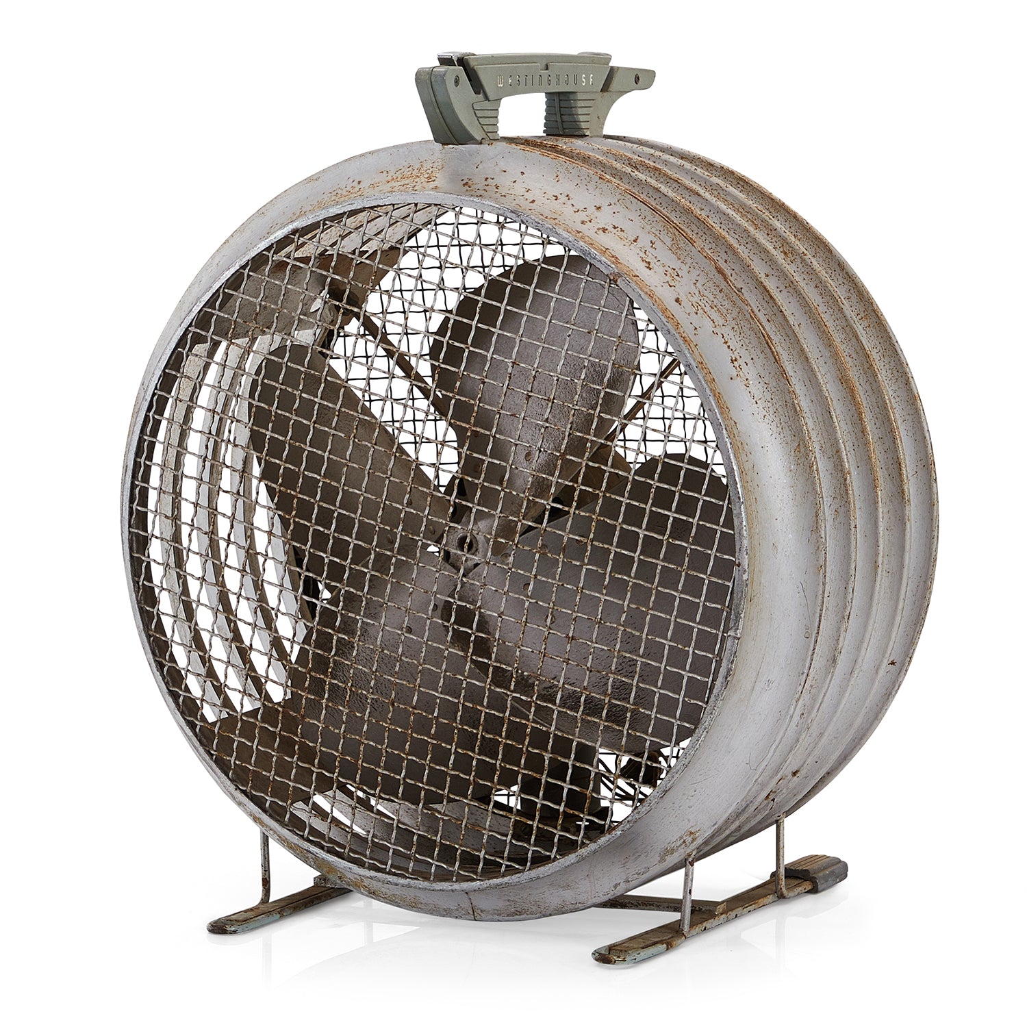 Details: Vintage two speed General Electric box fan with with white blades and grill and brown metal frame (Vintage electronic prop with old motor &...