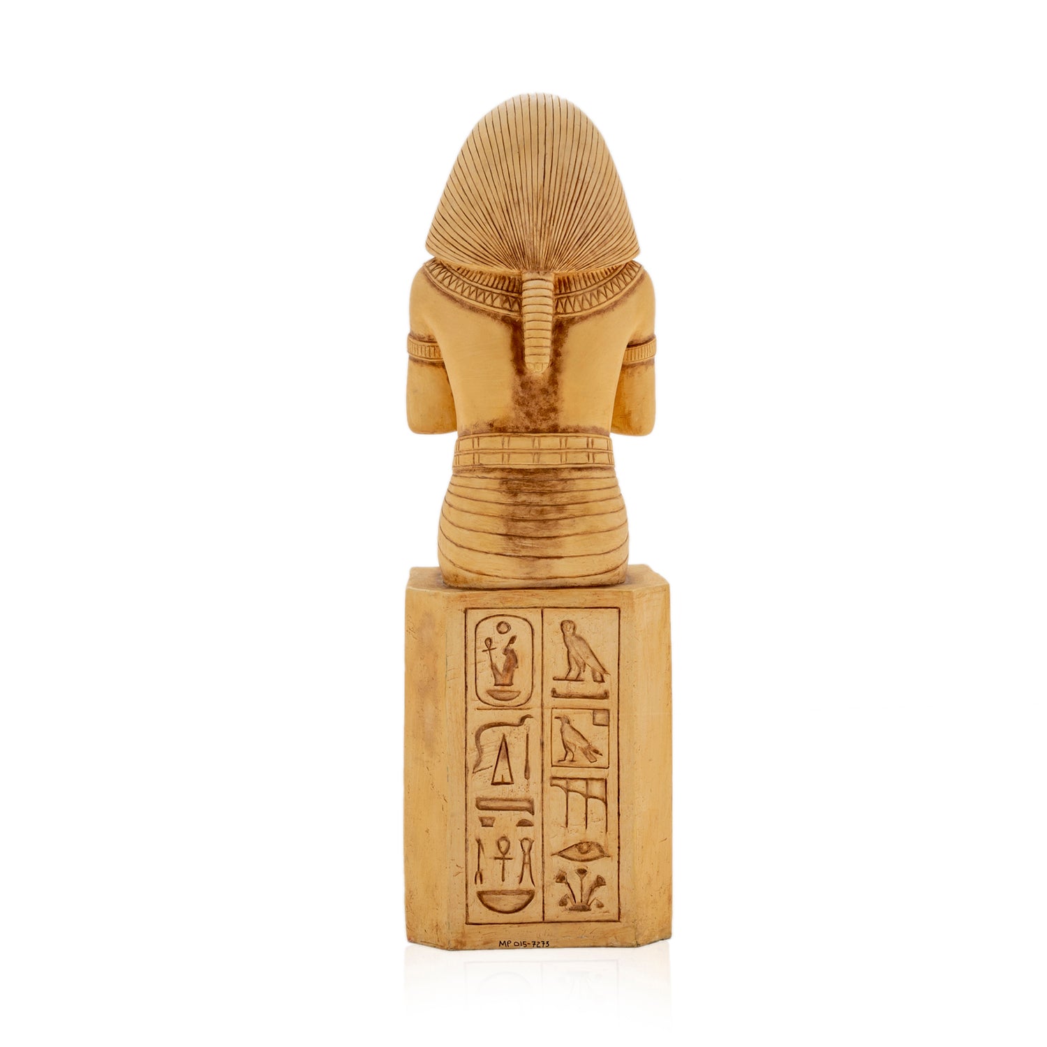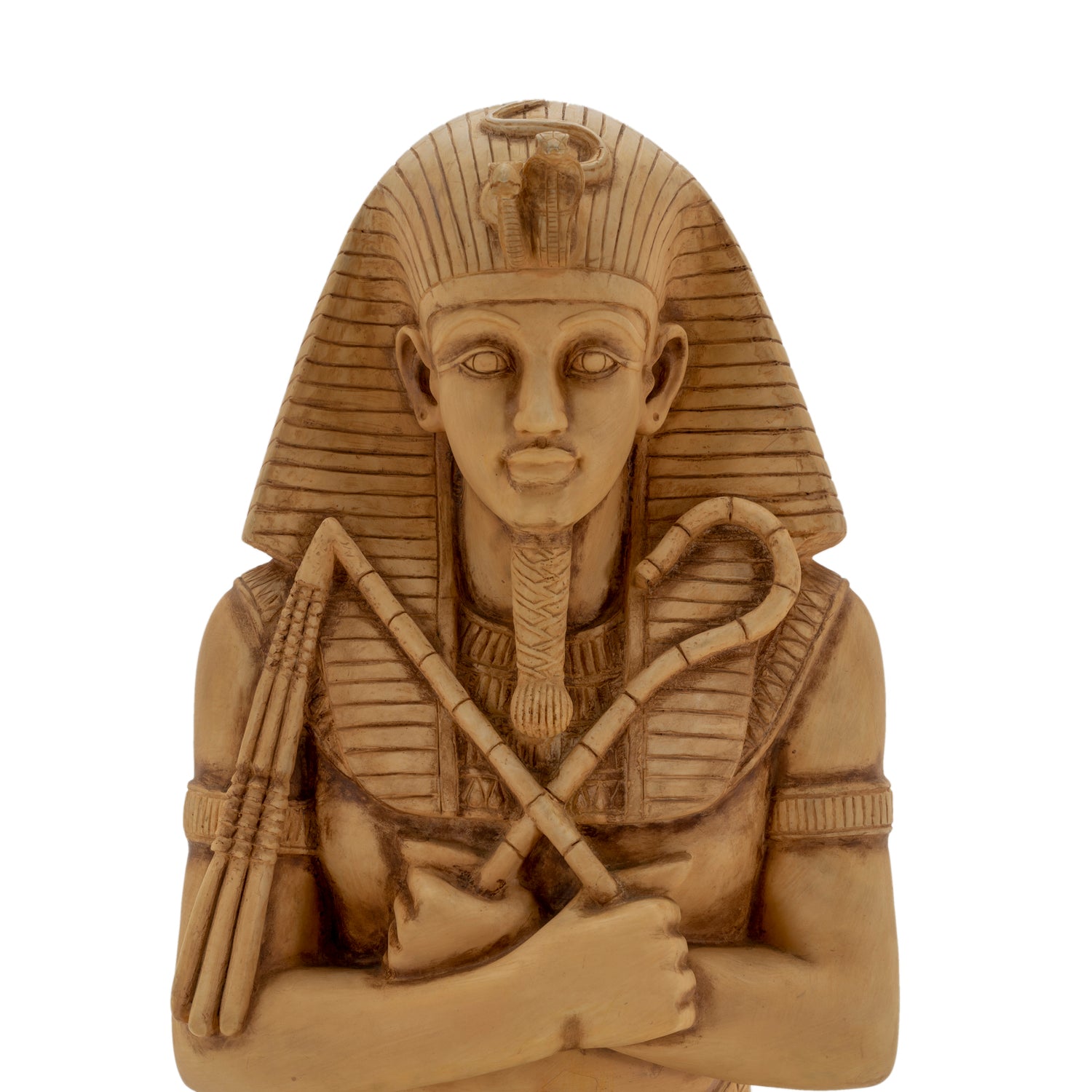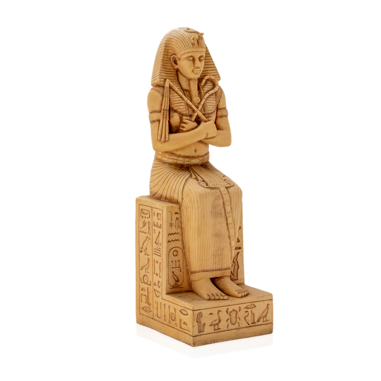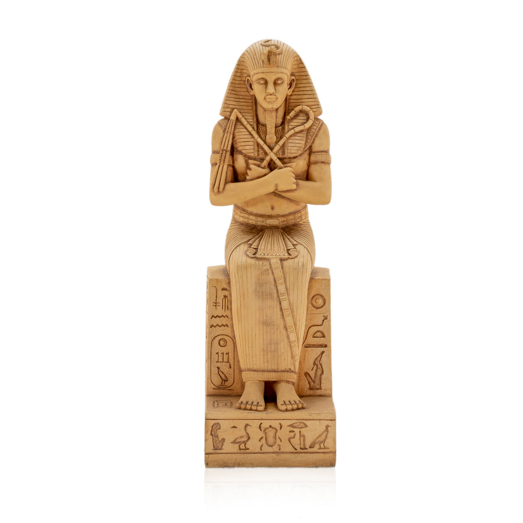 Details: Ceramic pharaoh statue in seated position with crossed arms on a block with hieroglyphs Dimensions: 48" H x 15" W x 18" D Quantity: 1