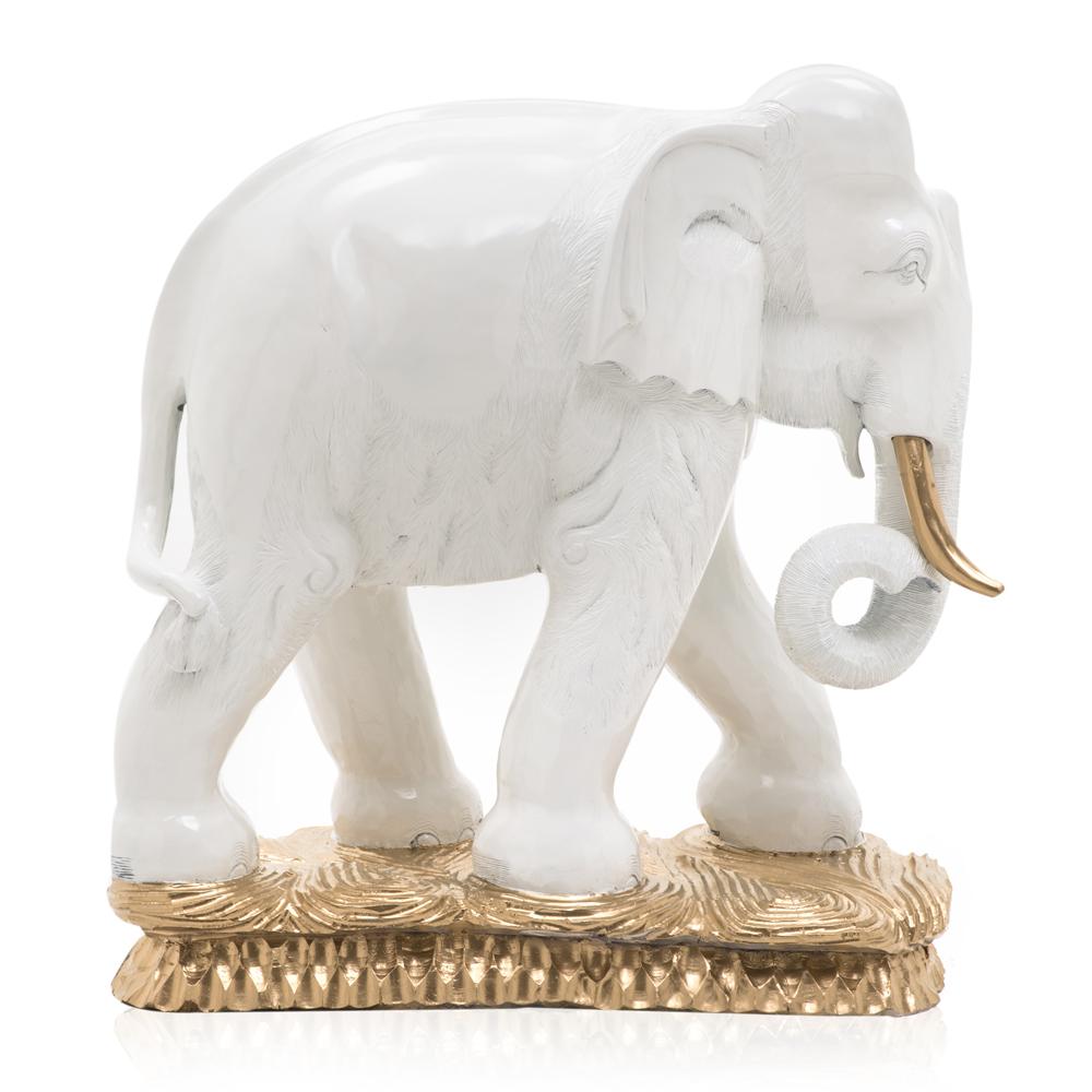 Details: White elephant sculpture with gold tusks and base. Dimensions: 43" H x 40" W x 22" D Quantity - 2
