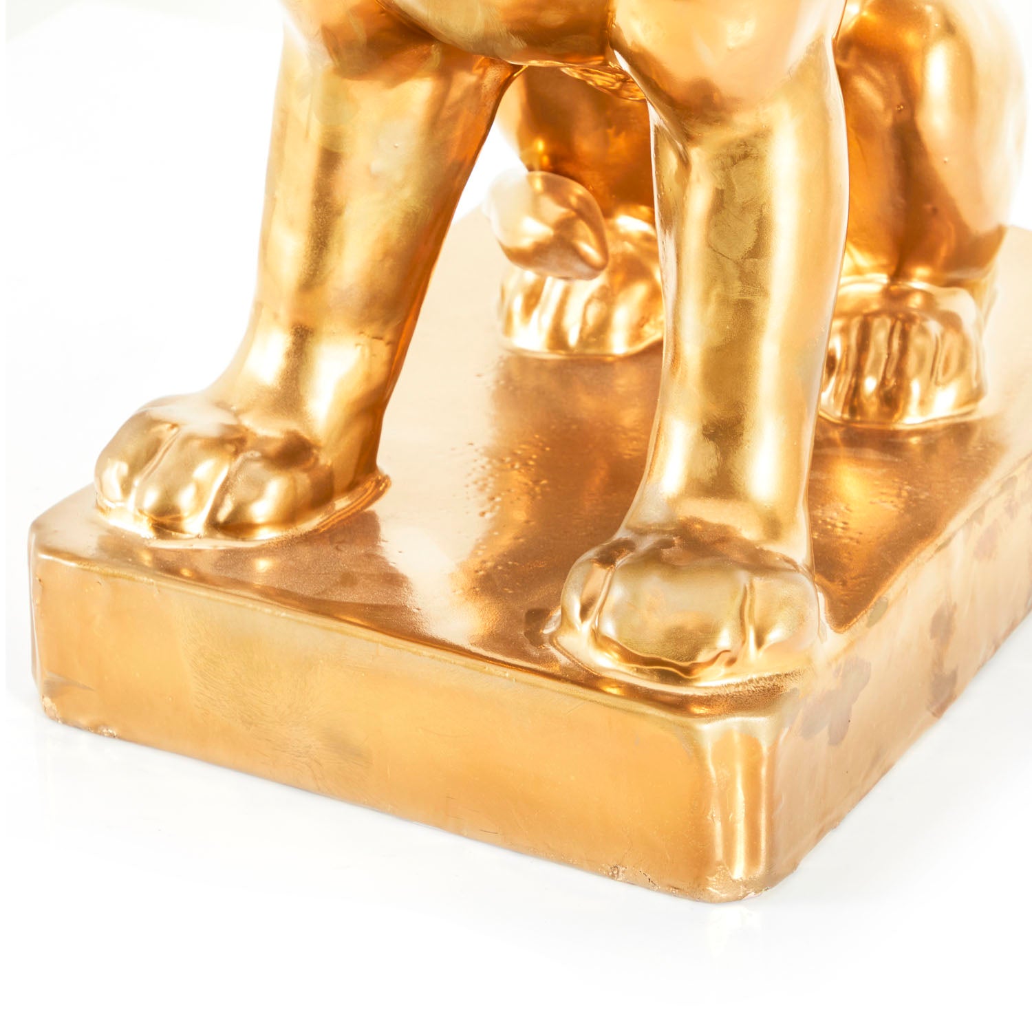 Details: Gold lion floor statue with red lips and green eyes Dimensions: 41" H x 81" W x 20" D