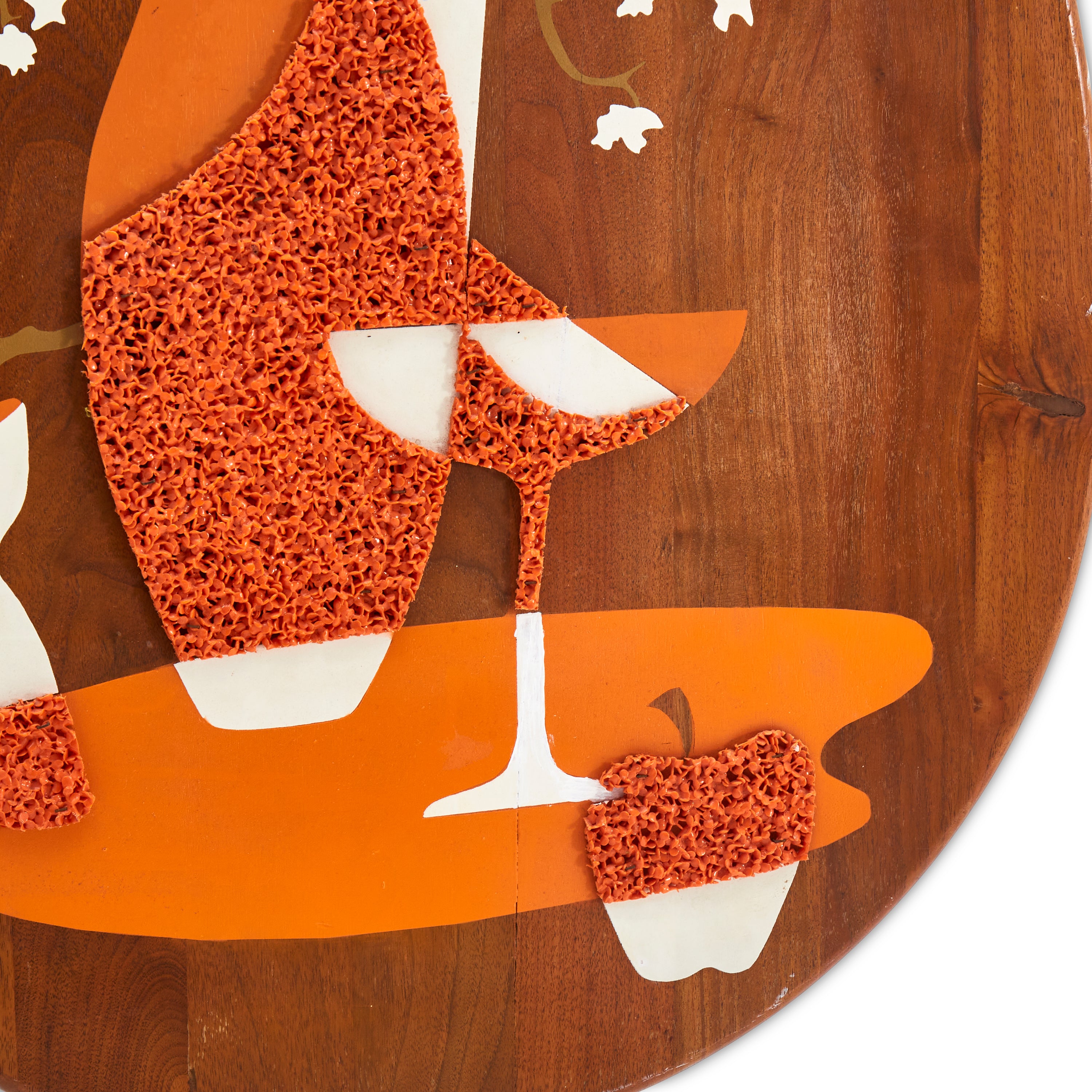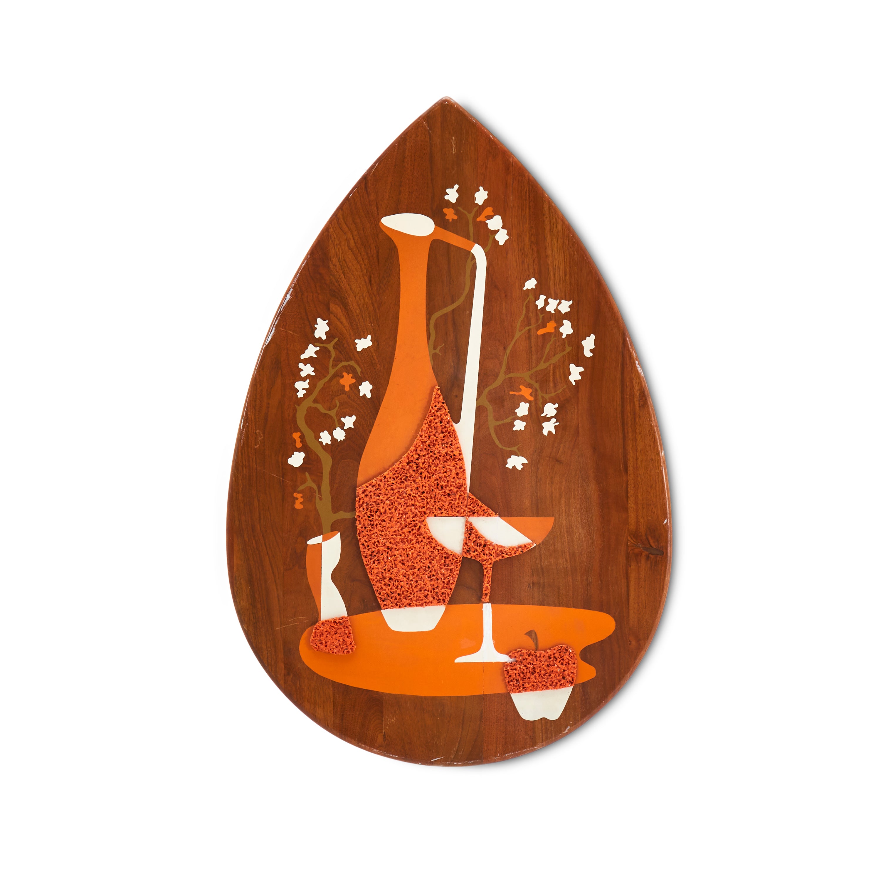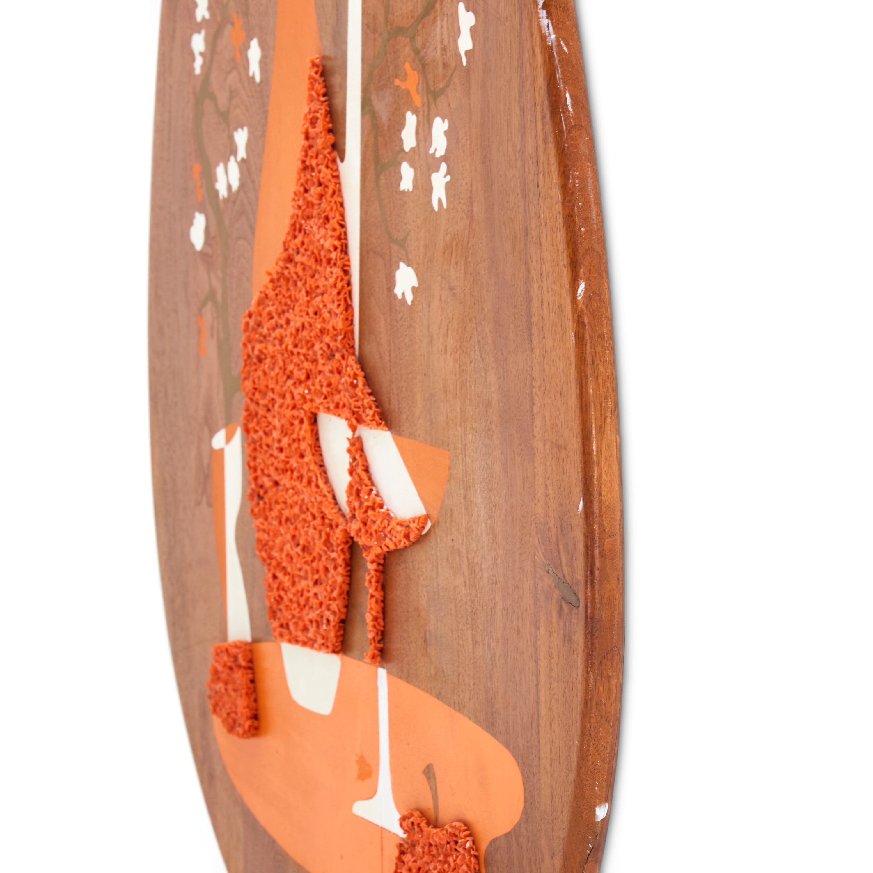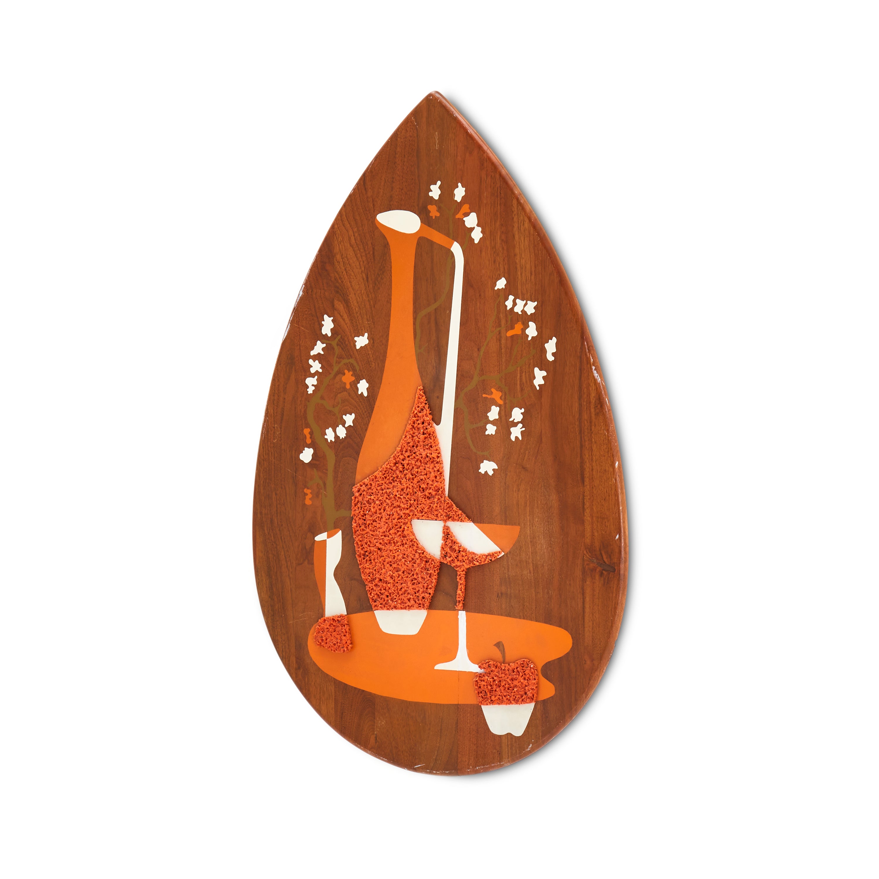 Details: Abstract wall sculpture of a wooden guitar with white and yellow checkered background, three spheres, and white and blue circular ornamentation Dimensions: 48" H x 12"...