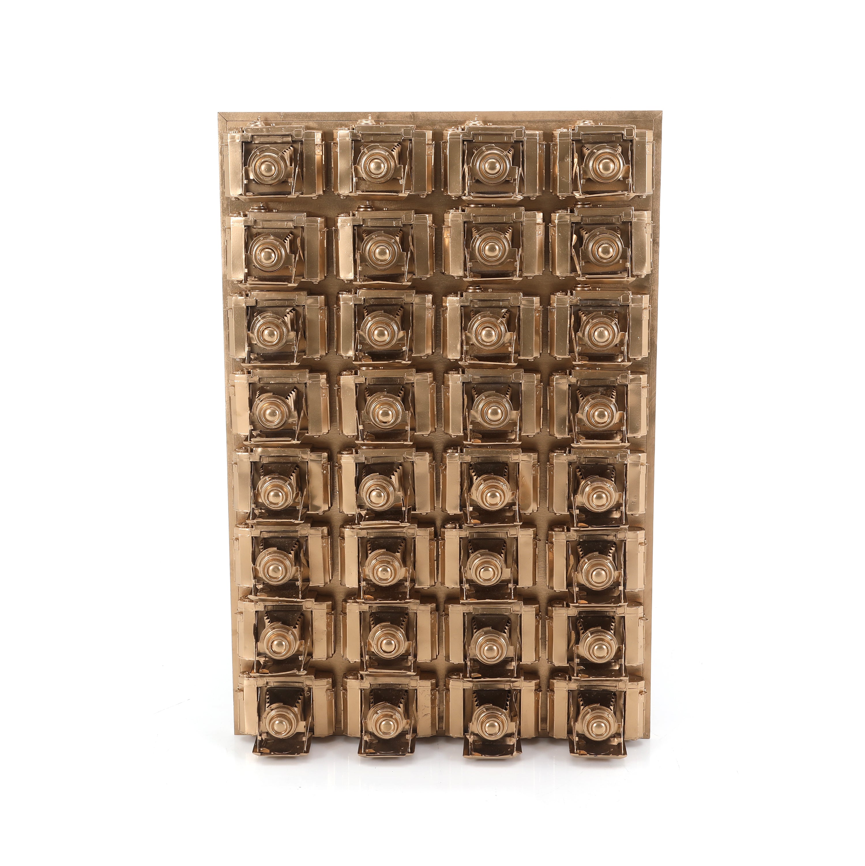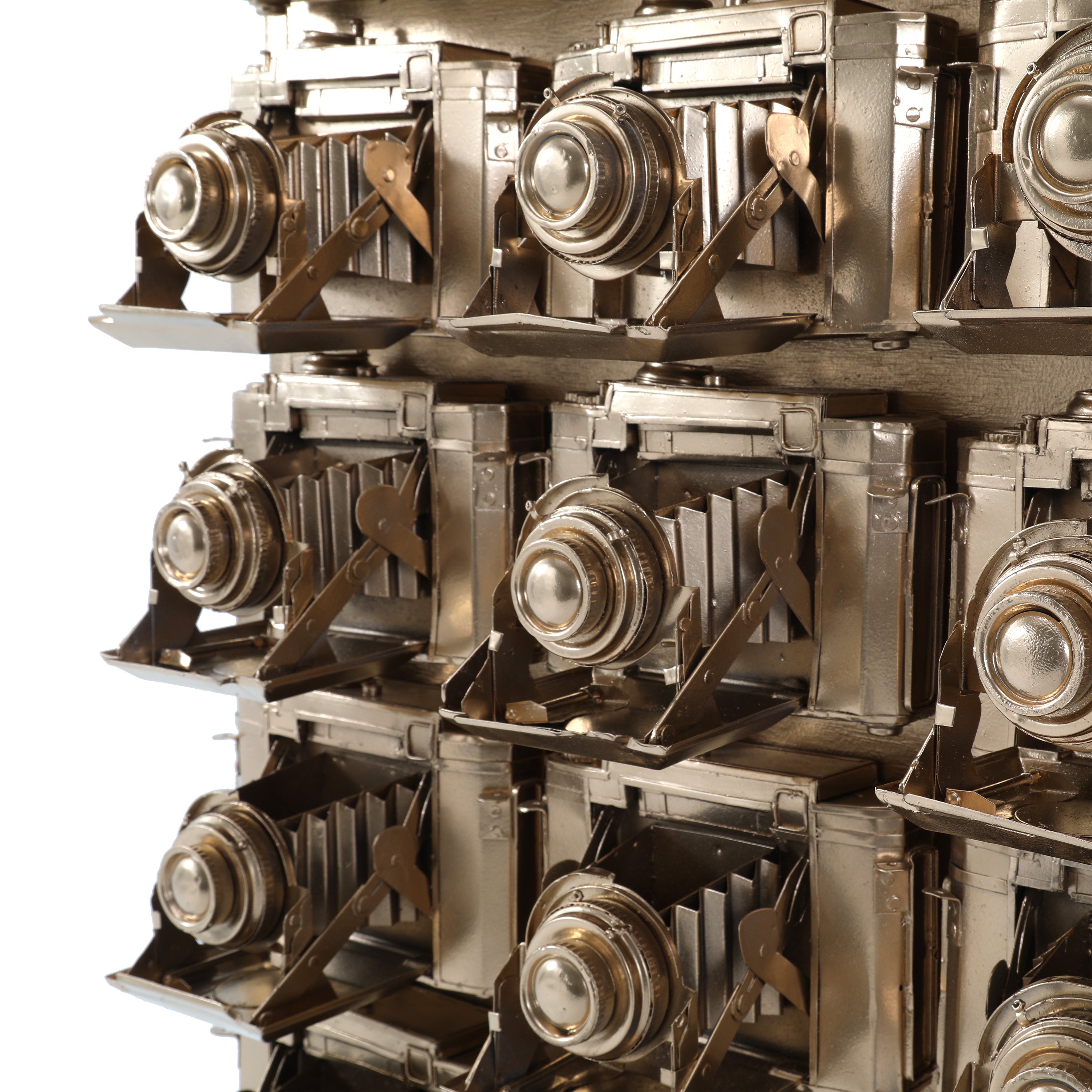 Details: Large gold wall art made from vintage cameras. Dimensions: 49.25" H x 33" W x 7" D