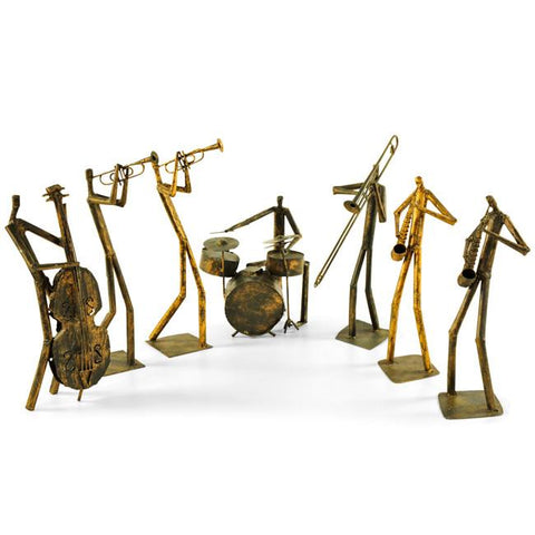 Details: Bronze Metal, Band Figures, Trumpet, Trombone, Drums, Base, SaxophoneDimensions:Trumpeters16" H X 5.5" W X 9" DSaxophone 16" H X 5" W X 6" D...