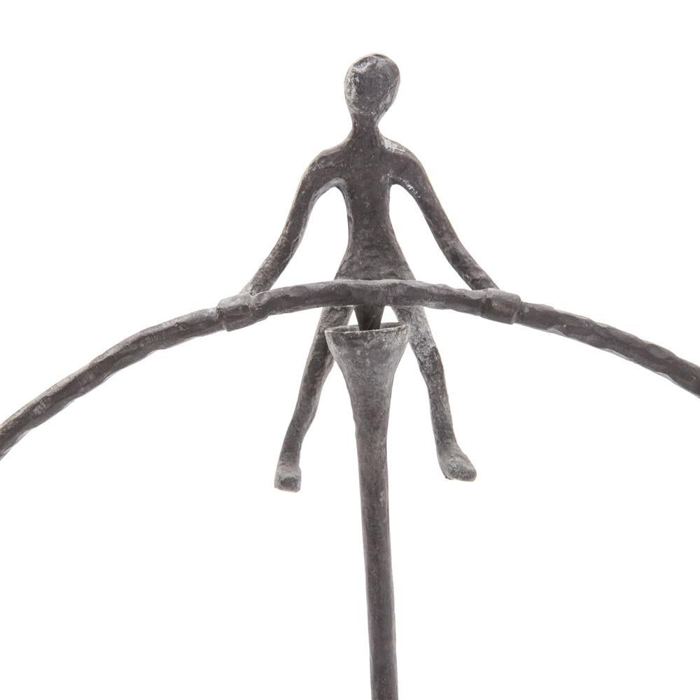 Details: Rustic metal sculpture of a person balancing on a rod. Dimensions: 10.5" H x 13.5" W x 5" D