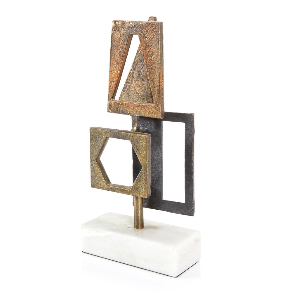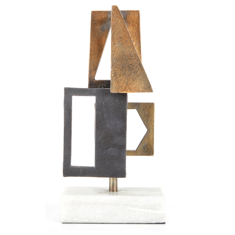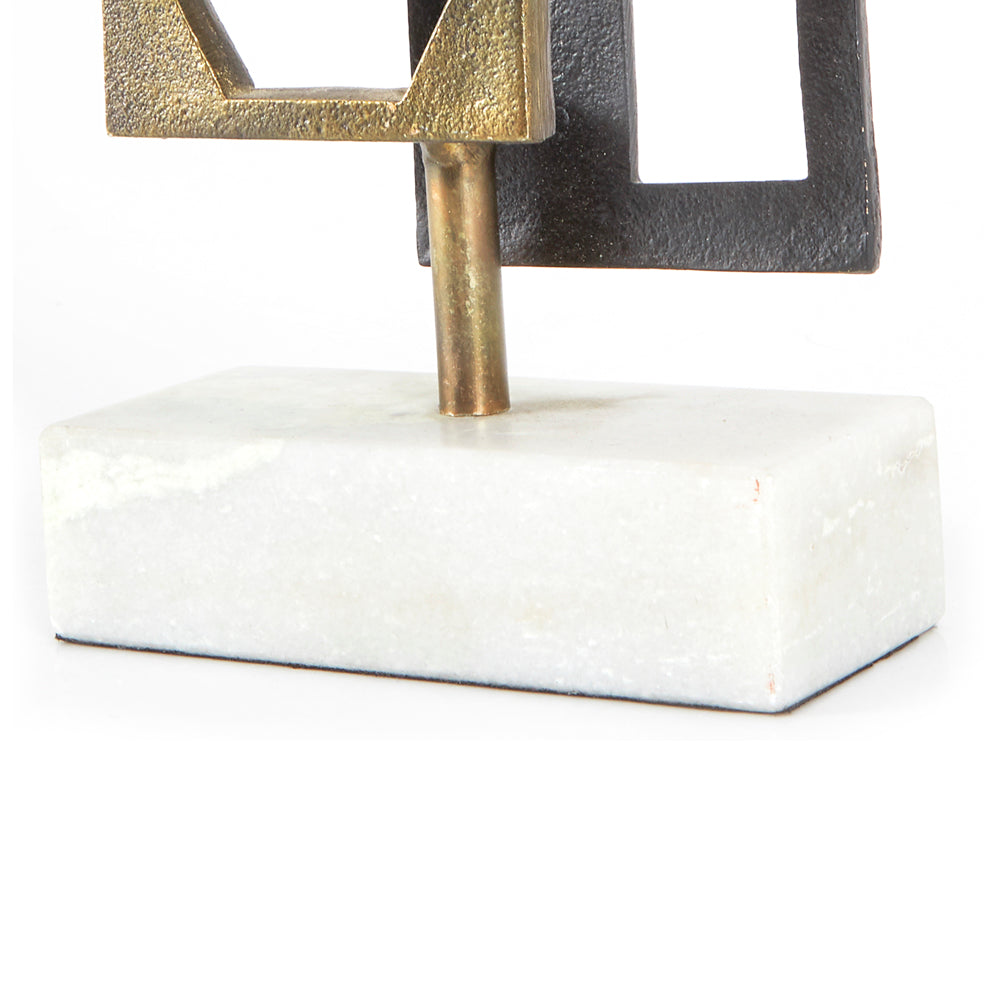 Details: Brass and black abstract metal table sculpture with marble base Dimensions: 12" H x 6" W x 3" D Quantity: 1