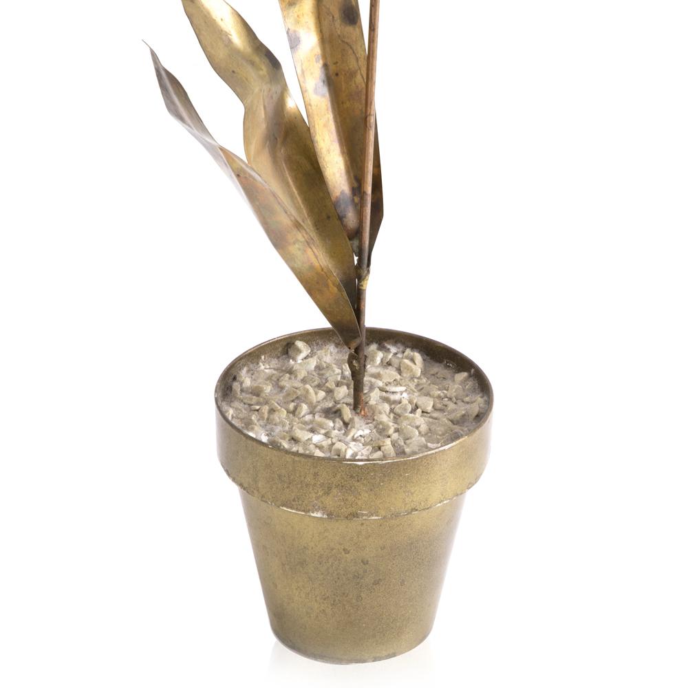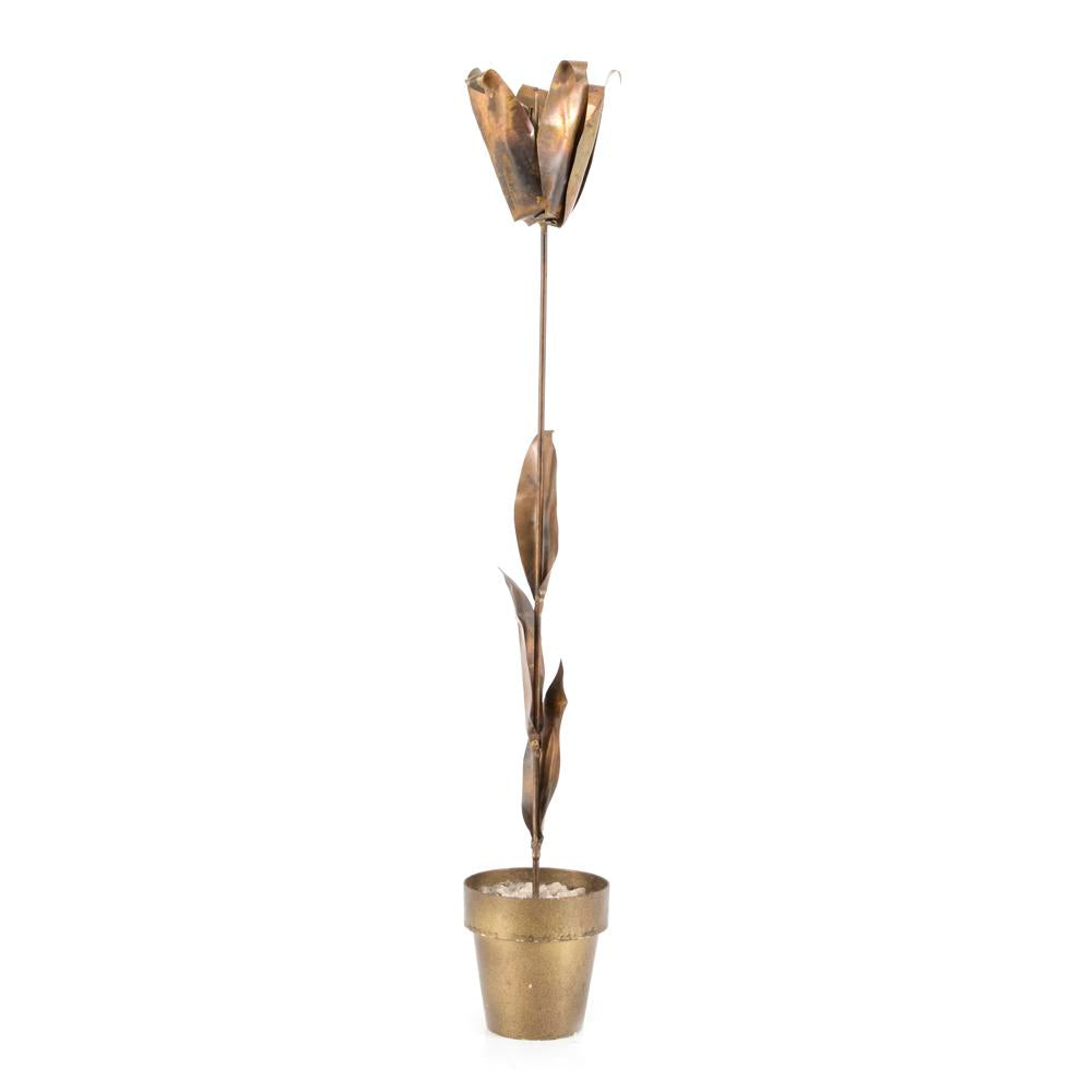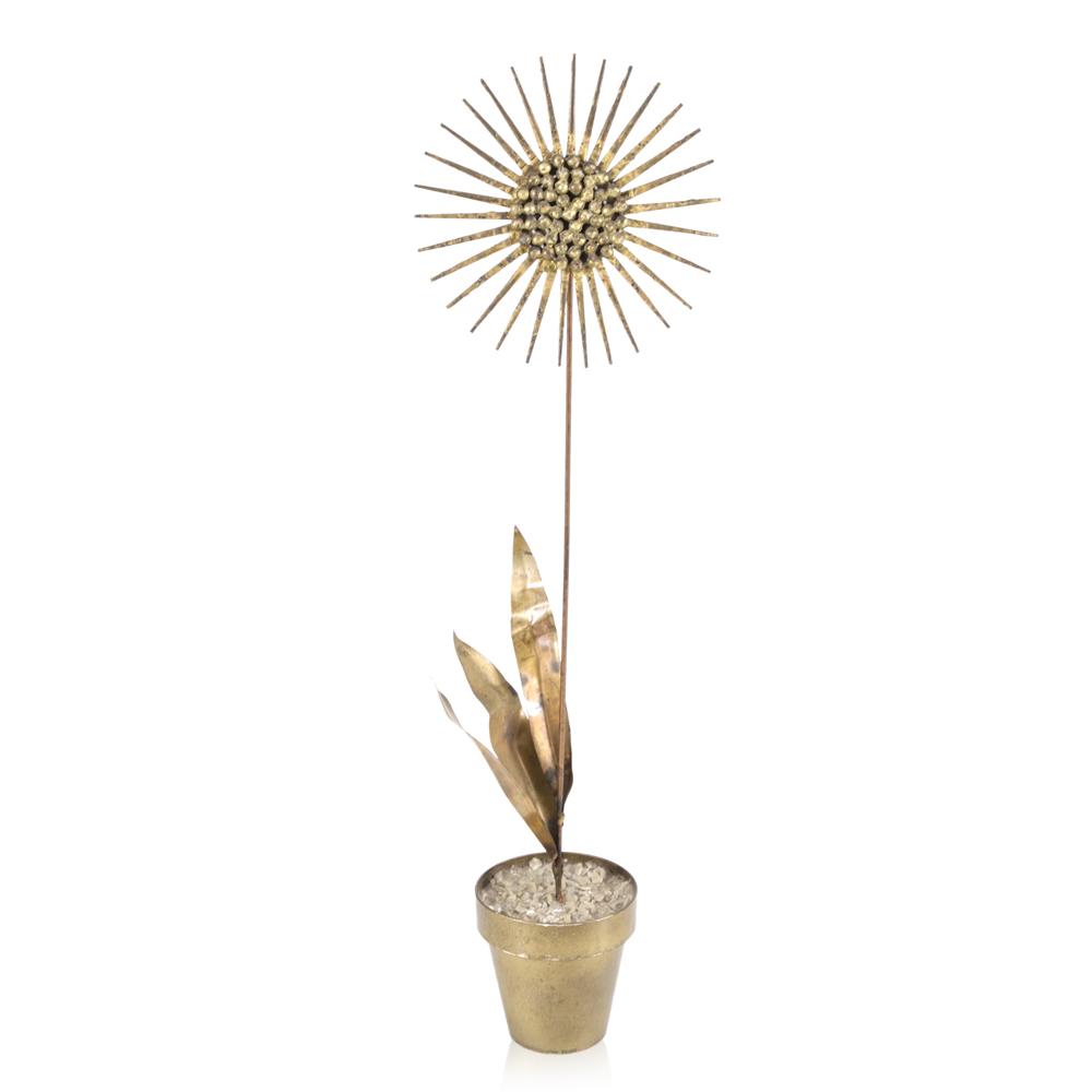 Details: Brass floor sculpture of a sunflower in a matching bronze pot Dimensions: 31.5" H x 9" W x 5" D Quantity: 1
