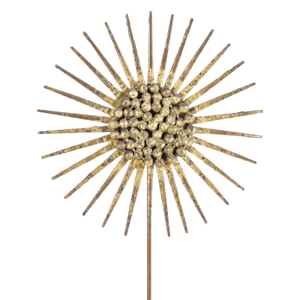 Details: Bronze, Metal, Yellow, Silver, Orange, Sun, Burst, Sculpture, Art, Wall, HangingDimensions: 50" Diameter