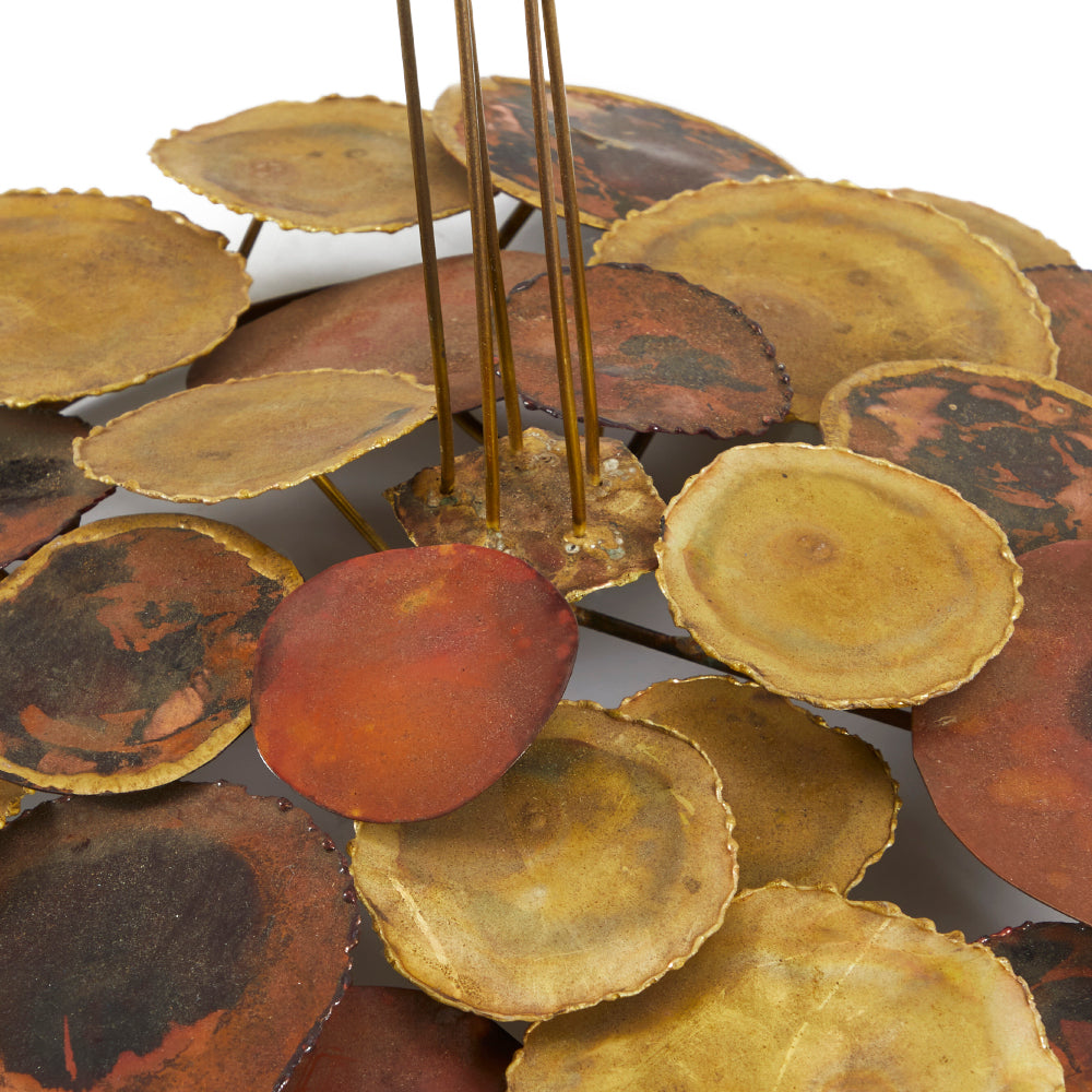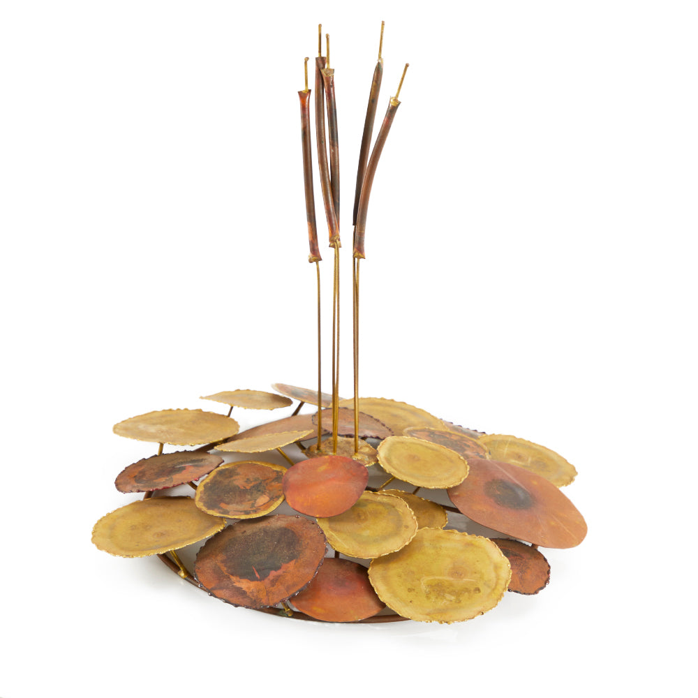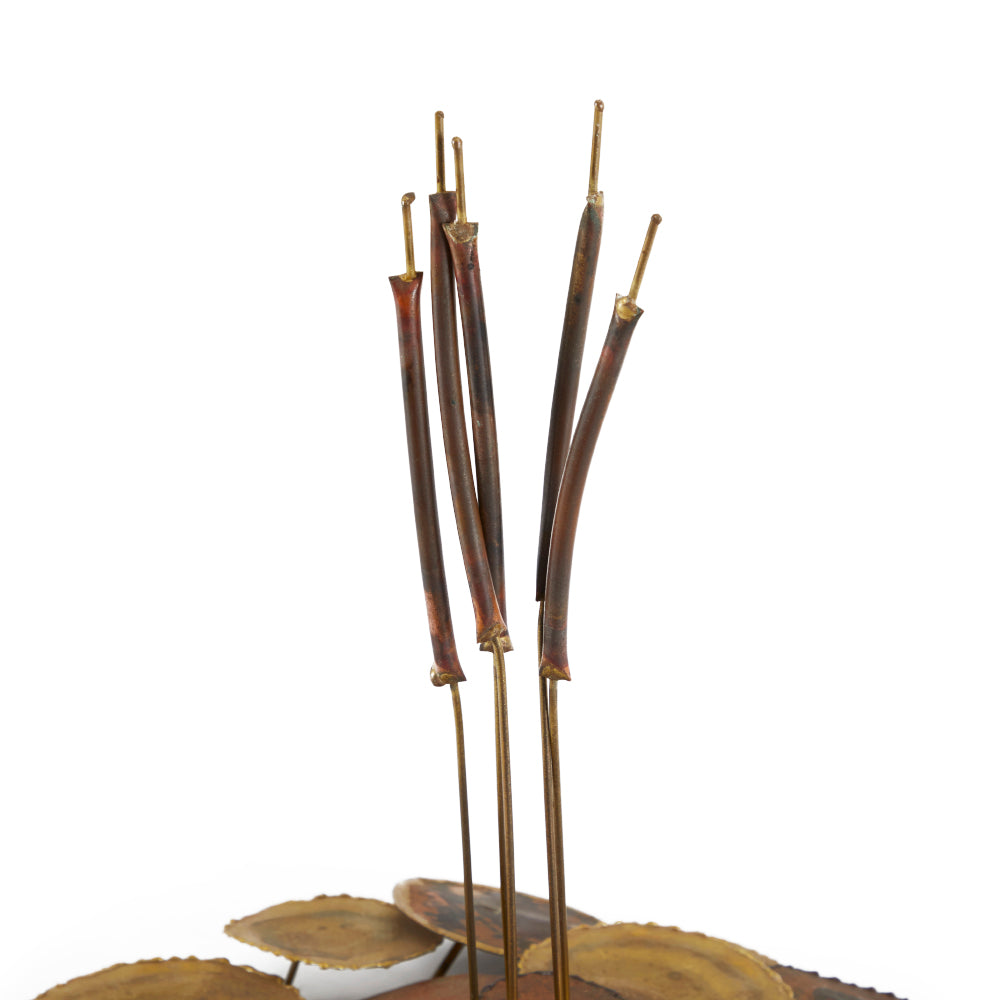 Details: Copper and brass sculpture depicting cattail reeds and water lily pads Dimensions: 14" H x 14" W x 14" D Quantity: 1