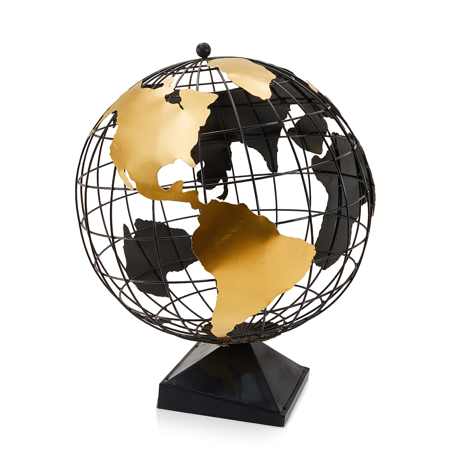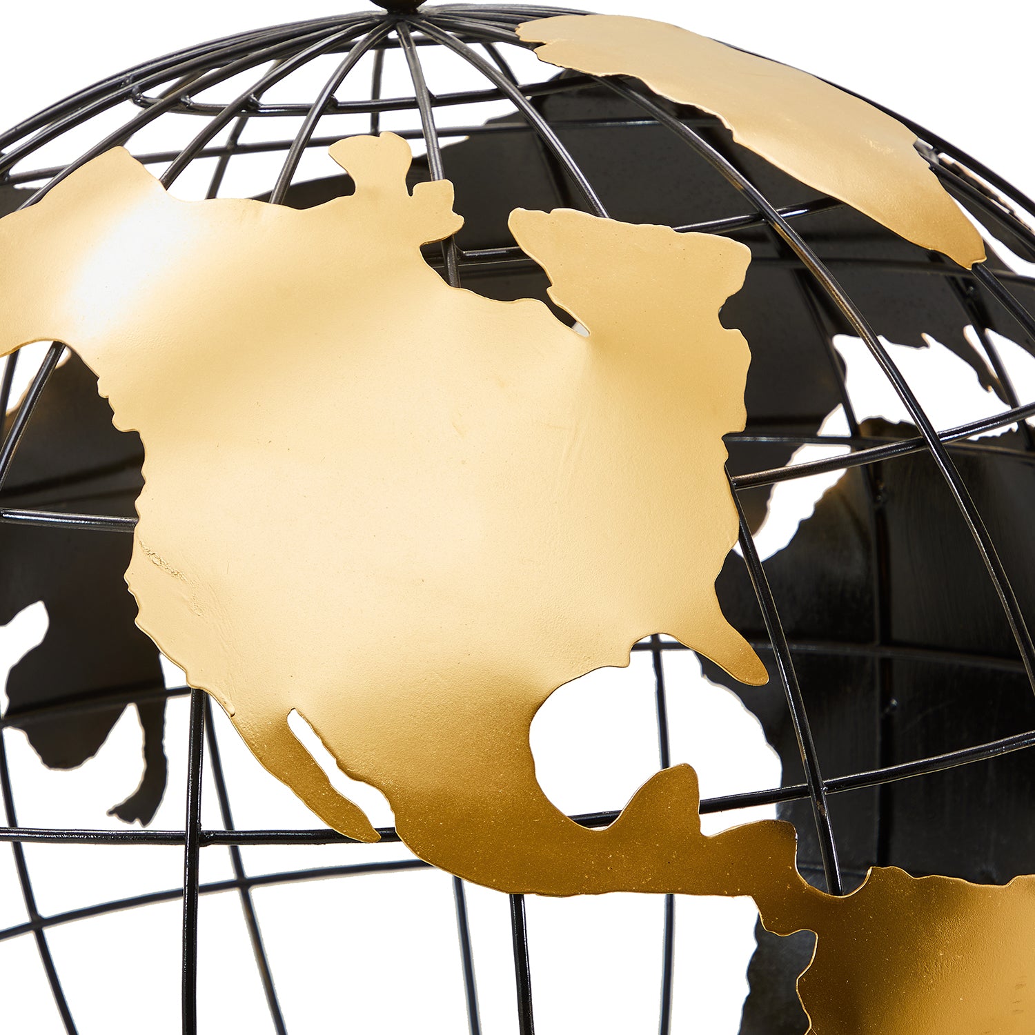 Details: Black metal wire globe with gold continents and triangular base Dimensions: 44" H x 35" W x 35" D