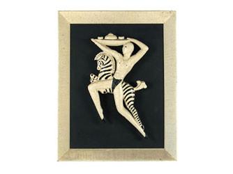 Details: Relief artwork of a prancing shirtless man carrying a platter and a jumping zebra