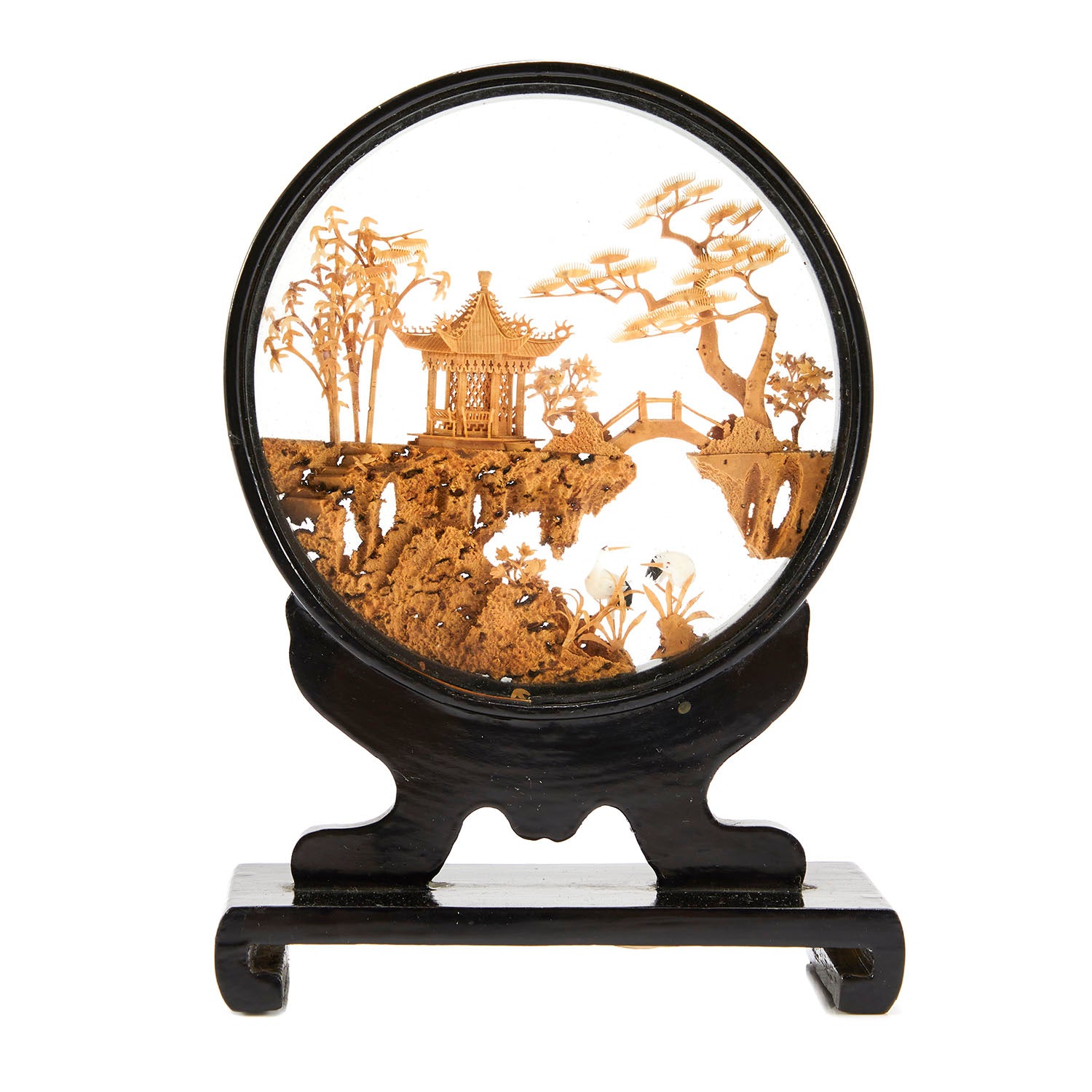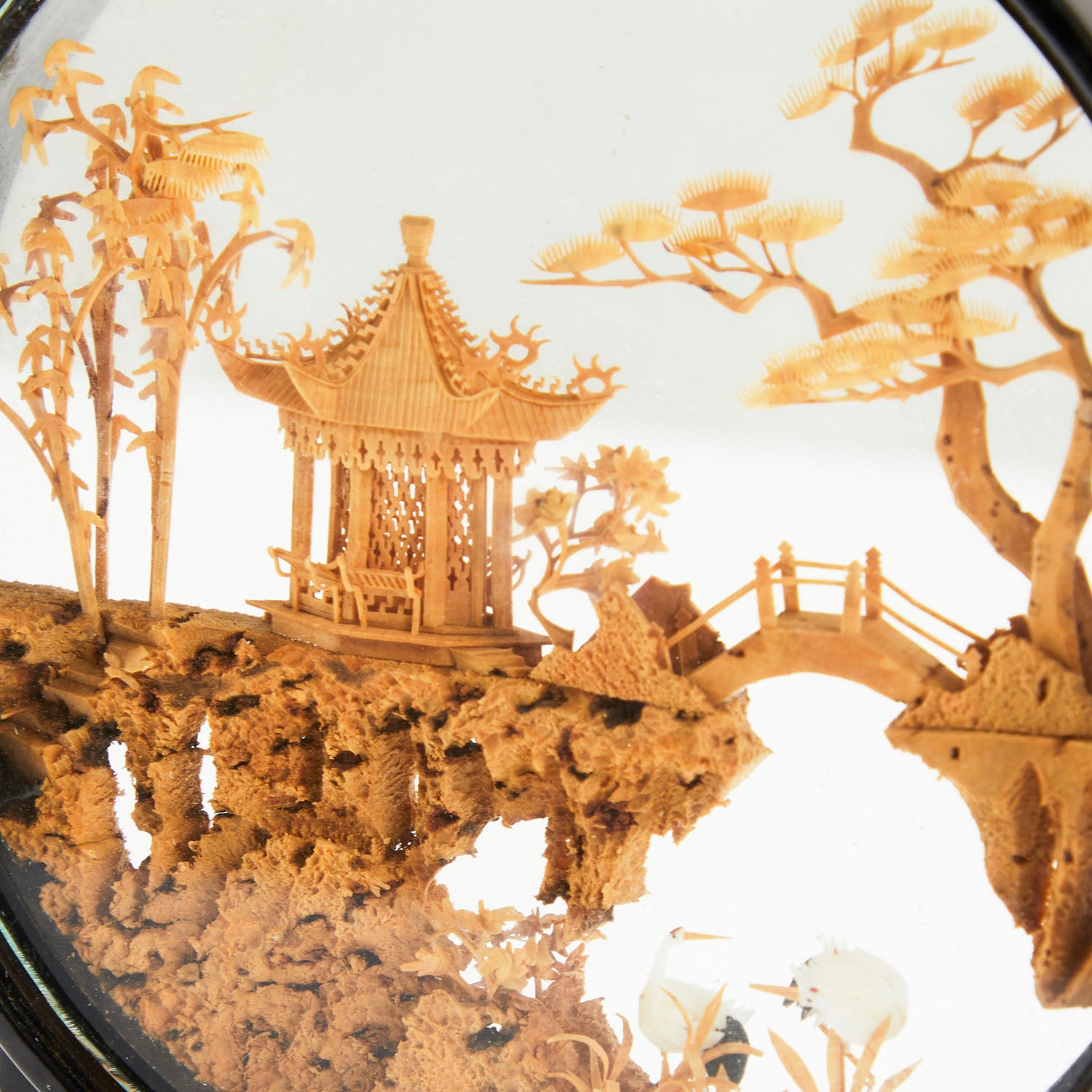 Details: Japanese hillside natural scene of a house and bridge amongst trees carved of wood, encased in clear resin and in a black frame and stand