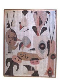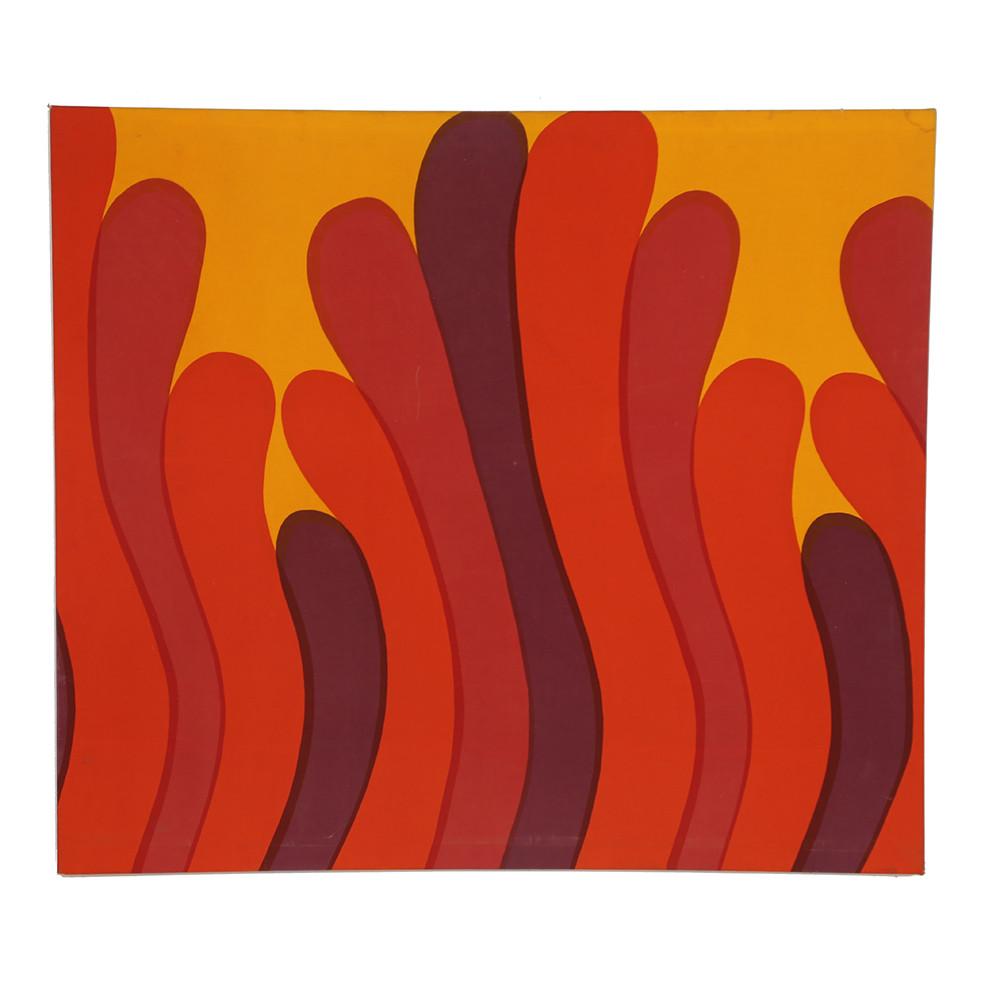 Details: Abstract stretched fabric artwork reminiscent of red and orange seaweed on a mustard yellow background Dimensions: 42" H x 48" W