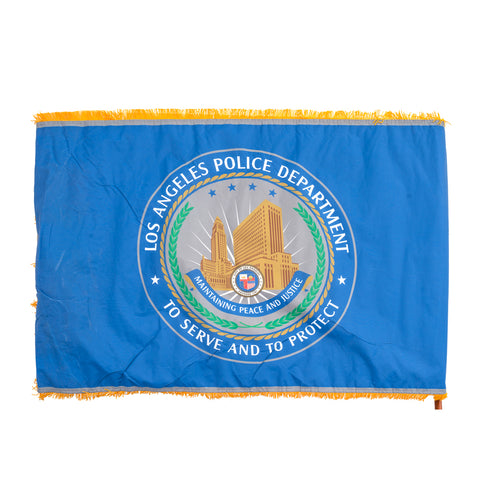 Details: Los Angeles police department blue flag with yellow fringe edges. Dimensions: