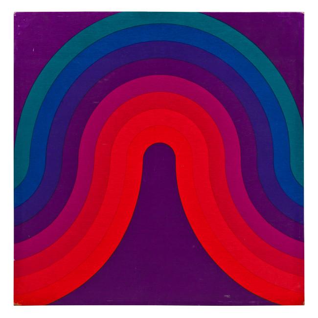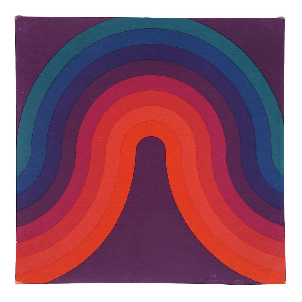 Details: Vintage fabric artwork of a red purple and blue rainbow on a purple background Dimensions: 45" H x 45" W Quantity: 2