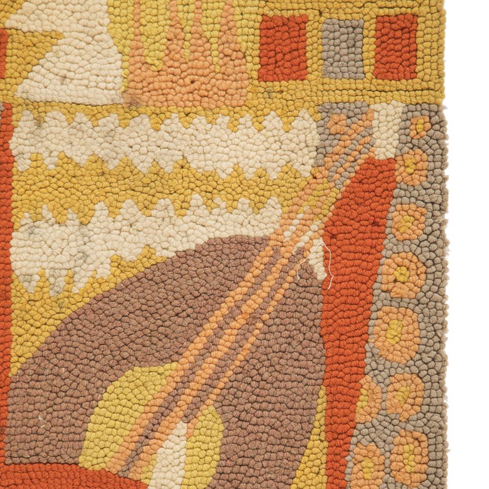 Details: Tufted art rug featuring a king riding a horse in orange tones Dimensions: 44" W x 43" L