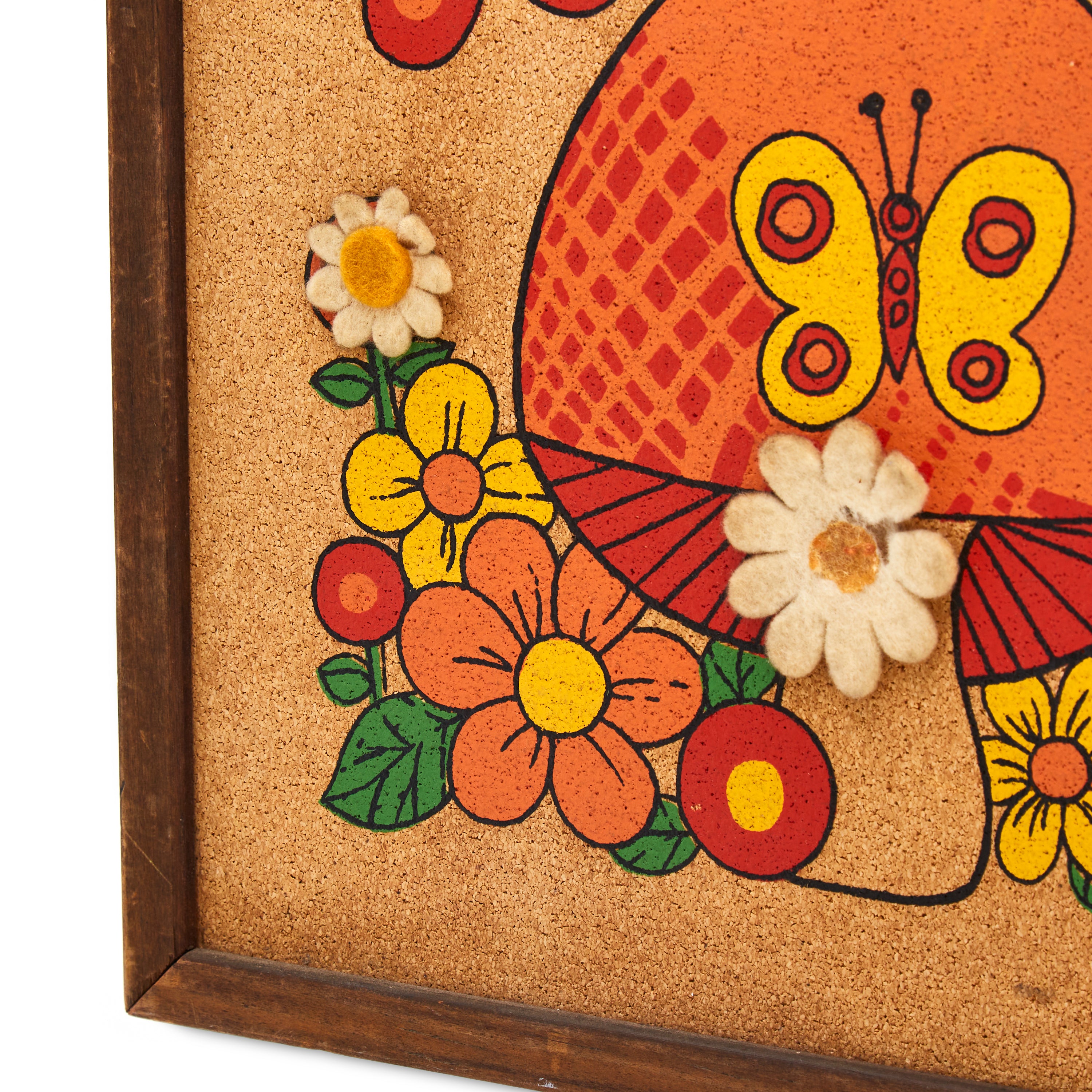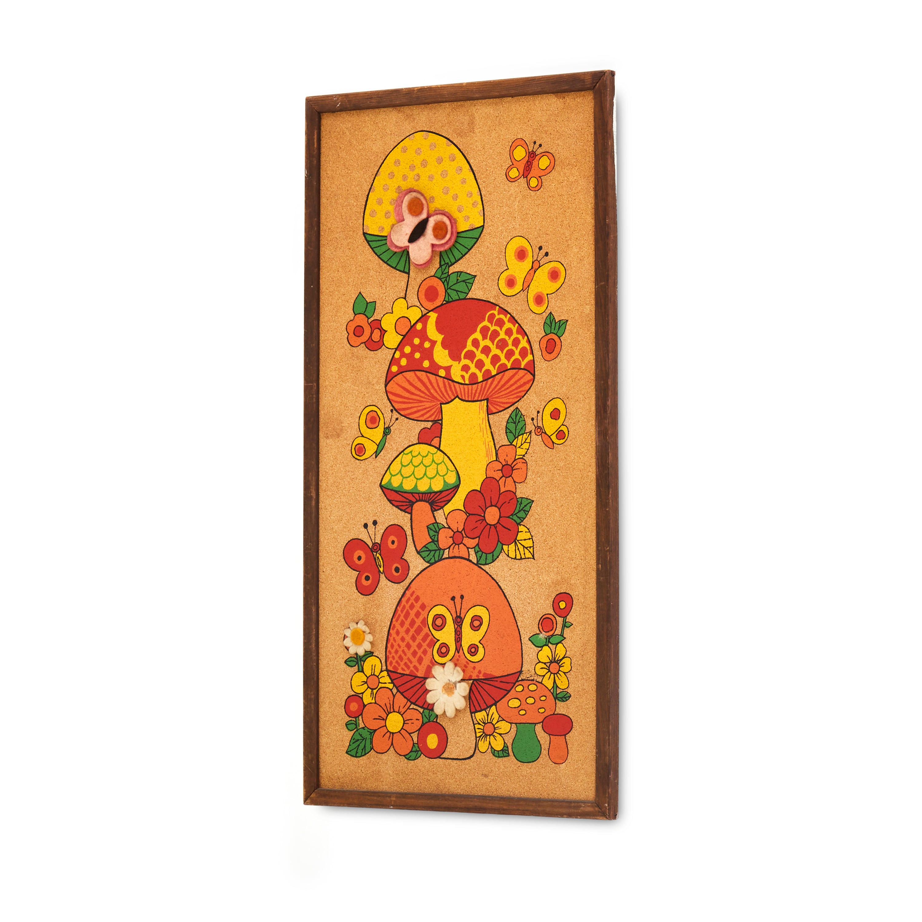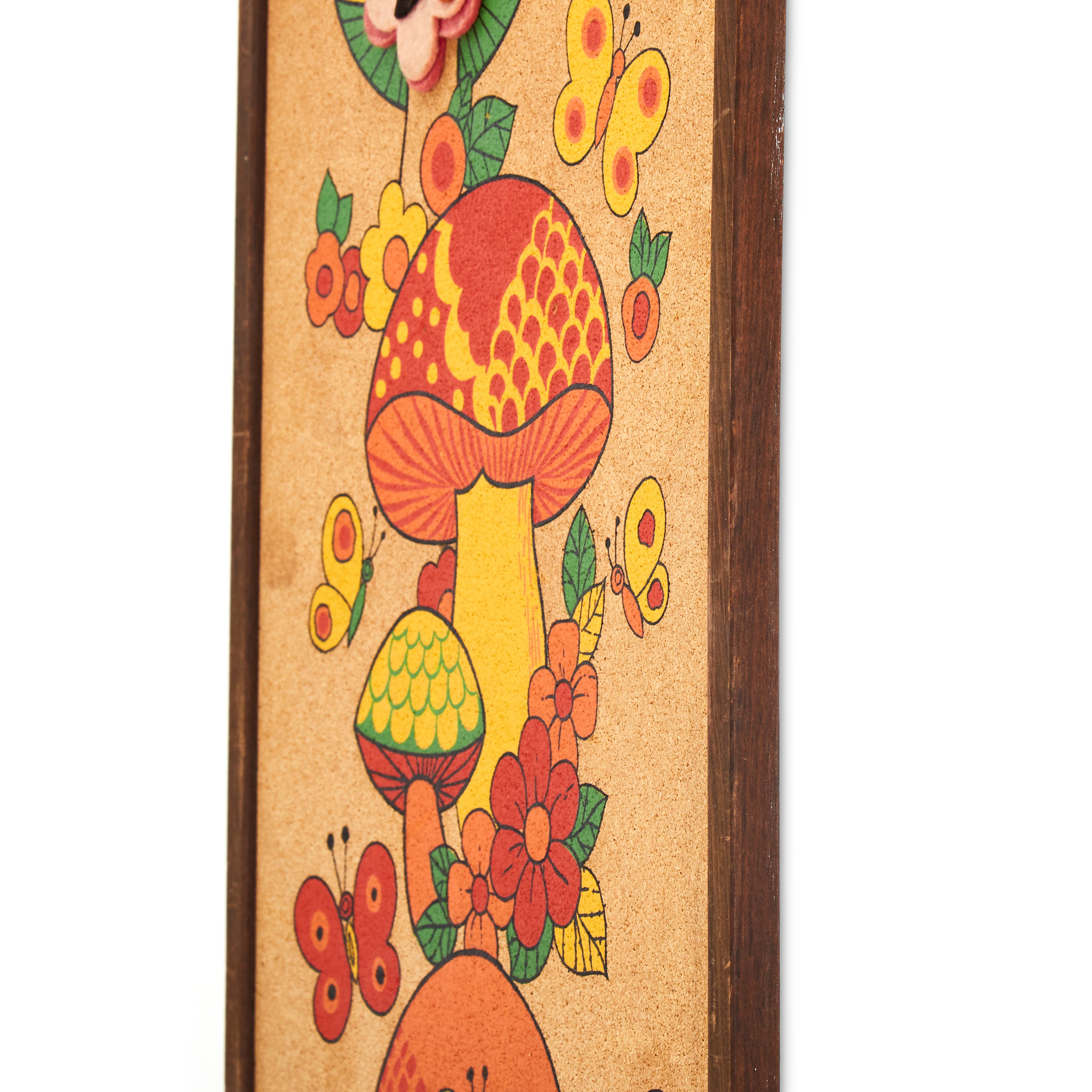 Details: Vintage pinboard with mushrooms and butterflies. Dimensions: 25" H x 13" W