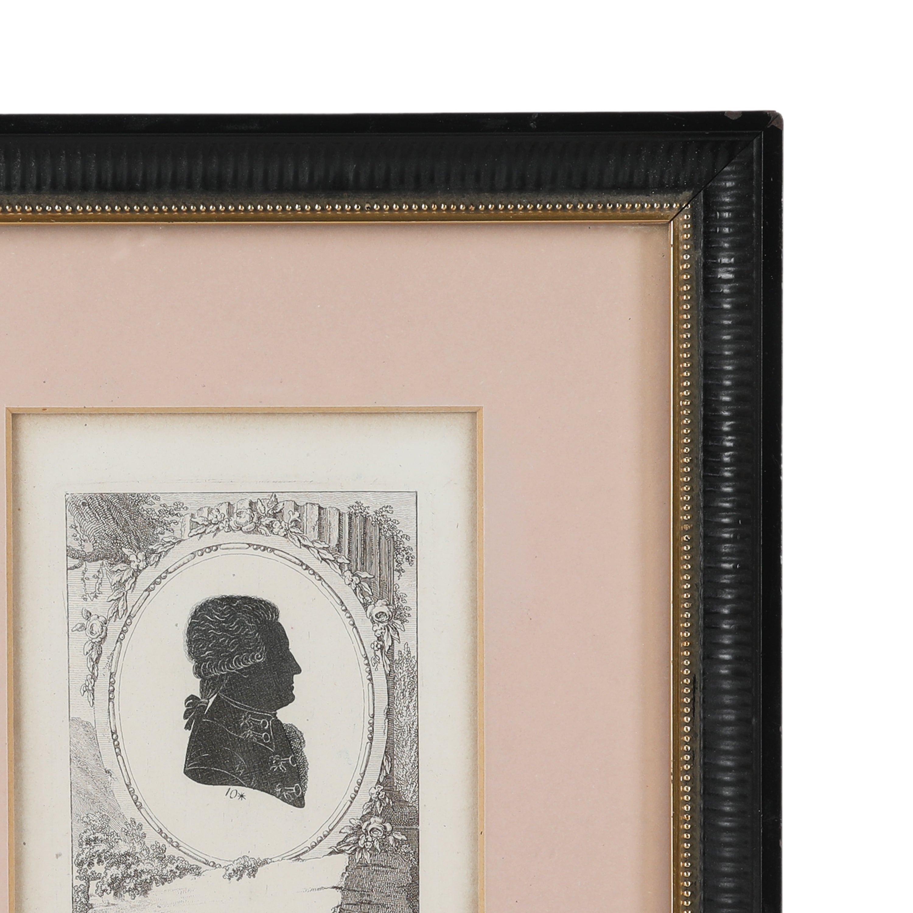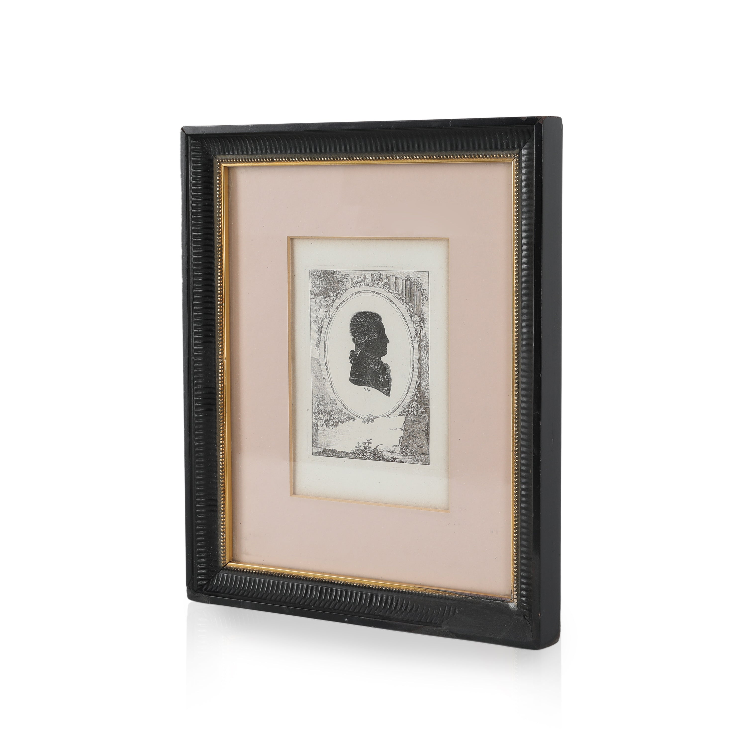 Details: Ink-drawn silhouette with pink mounting and black frame.