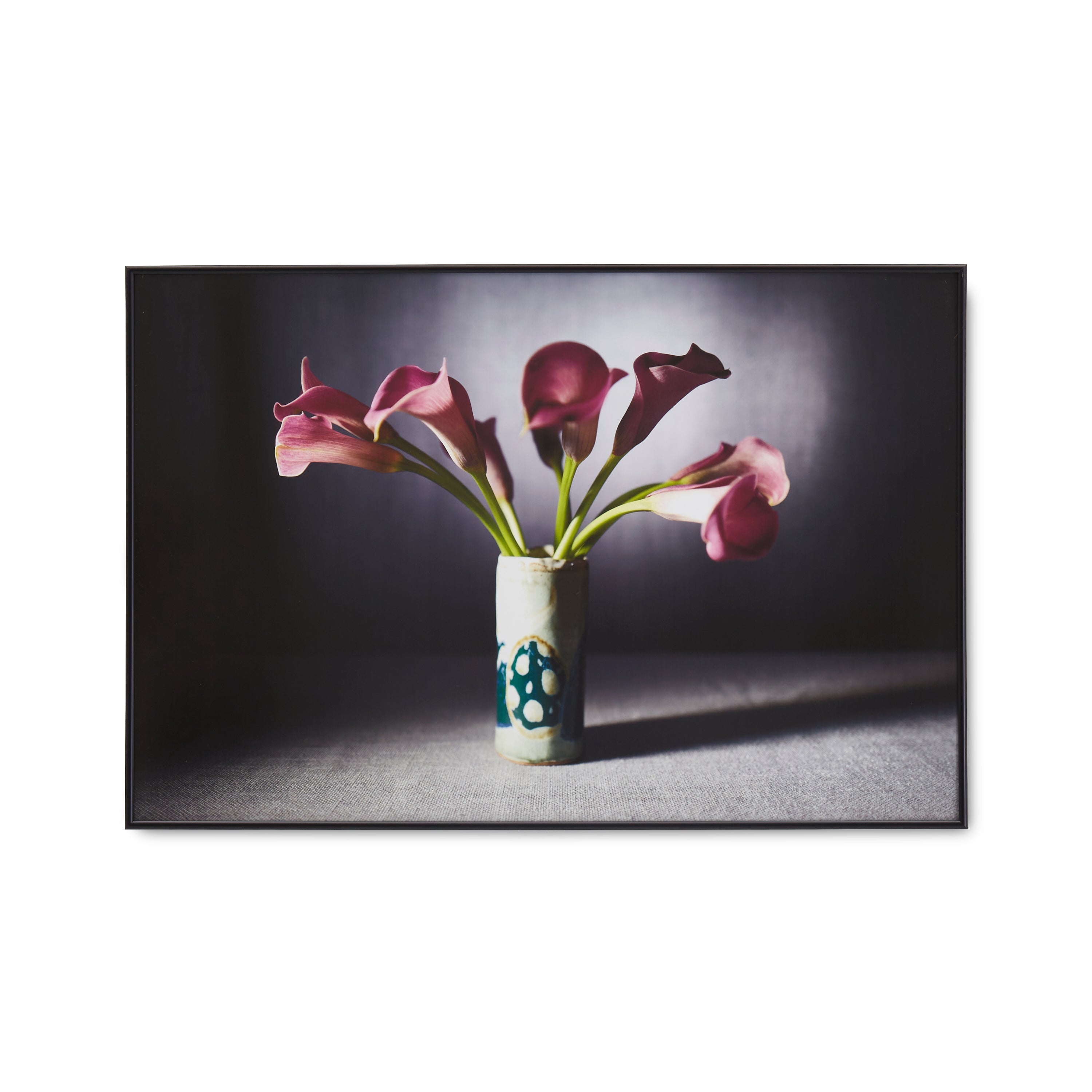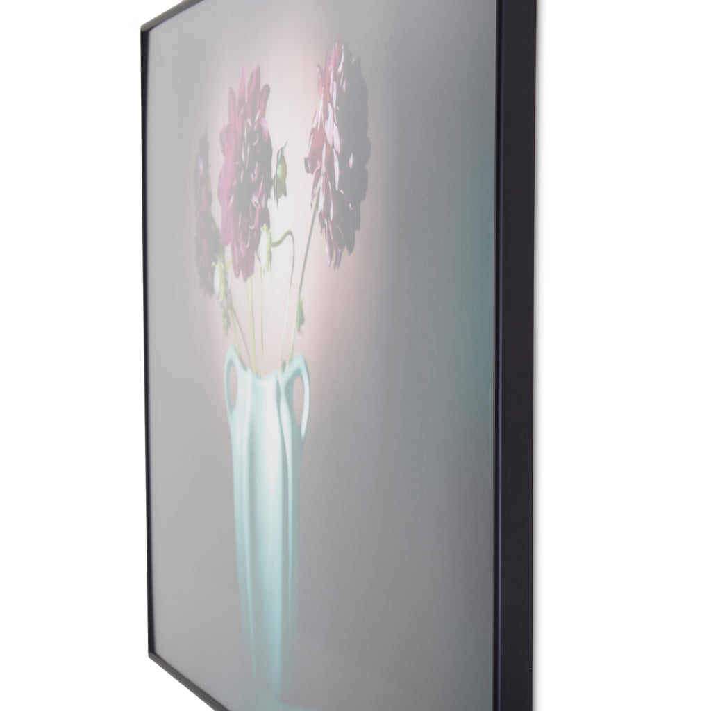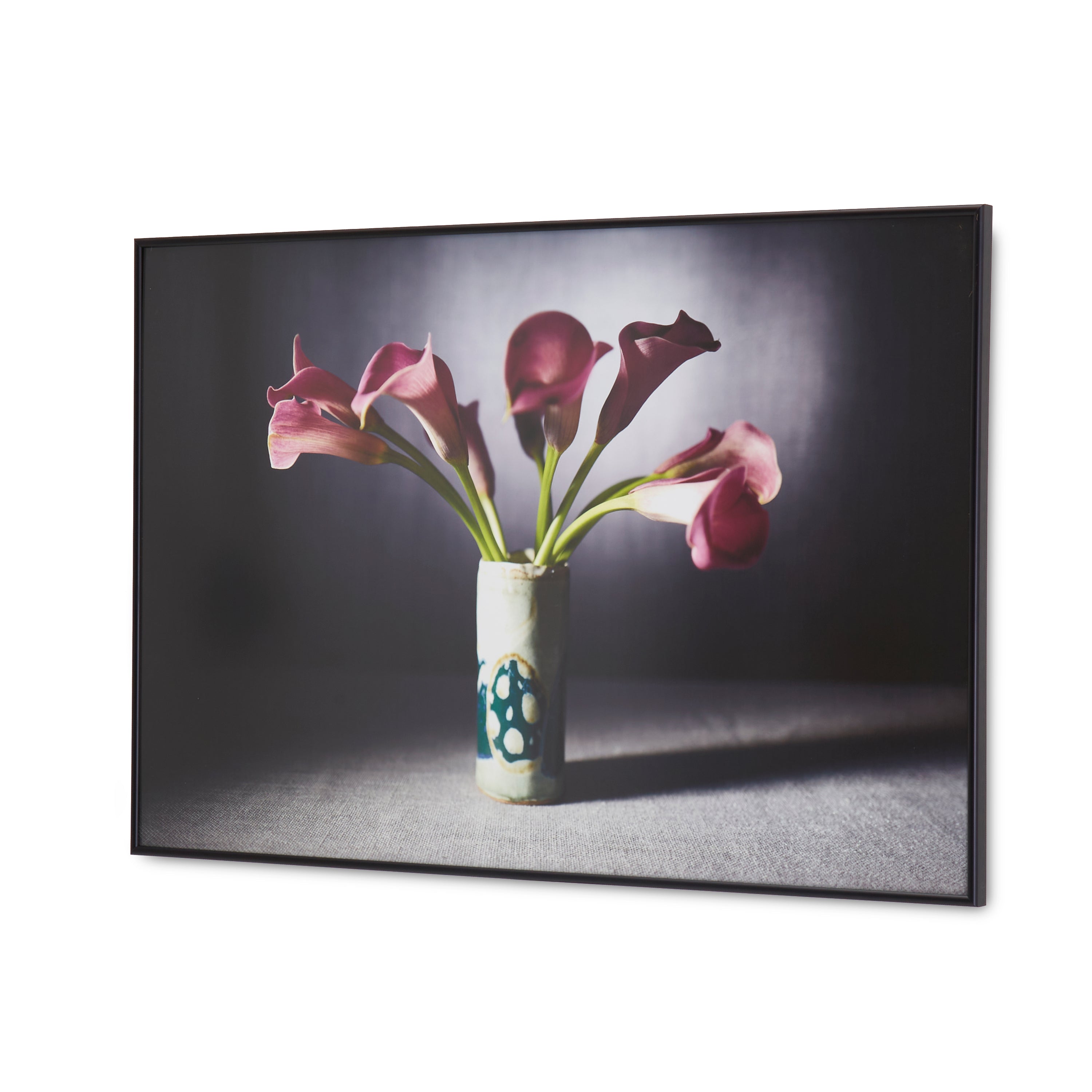 Details: Gold framed abstract photo of two pink flowers in a light blue vase. Dimensions: 36" H x 24.25" W x 1" D