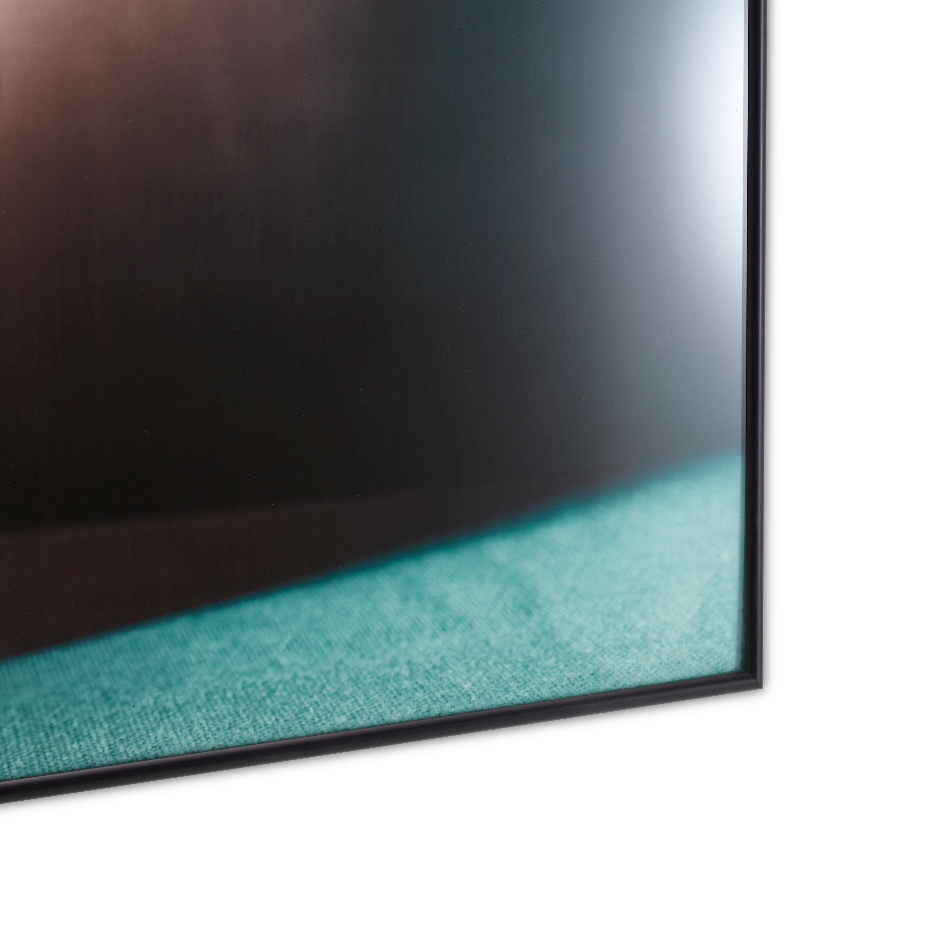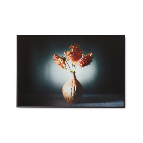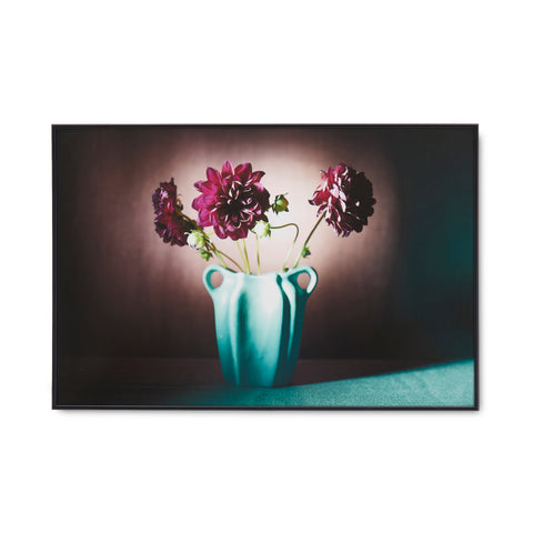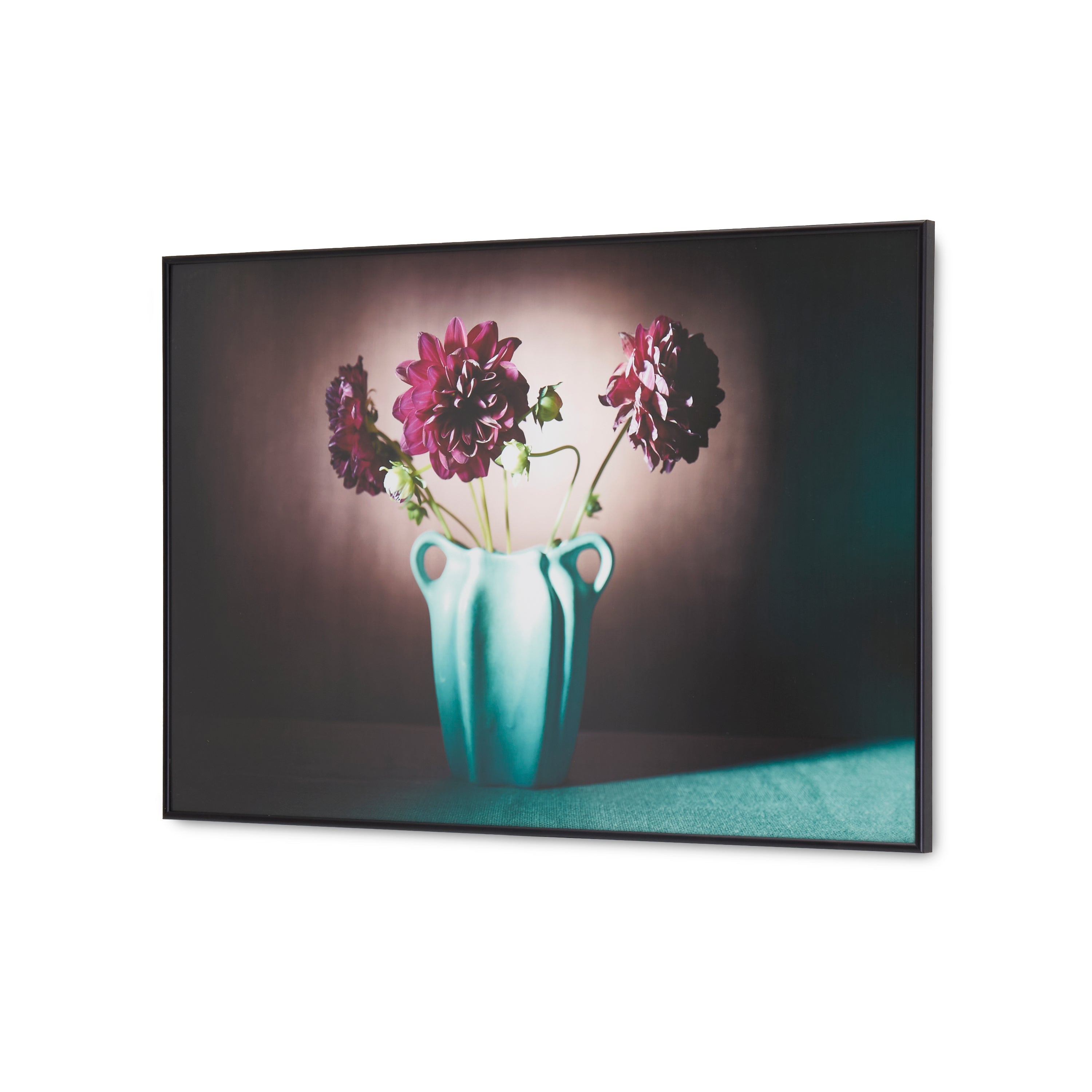 Details: Gold framed abstract photo of two pink flowers in a light blue vase. Dimensions: 36" H x 24.25" W x 1" D