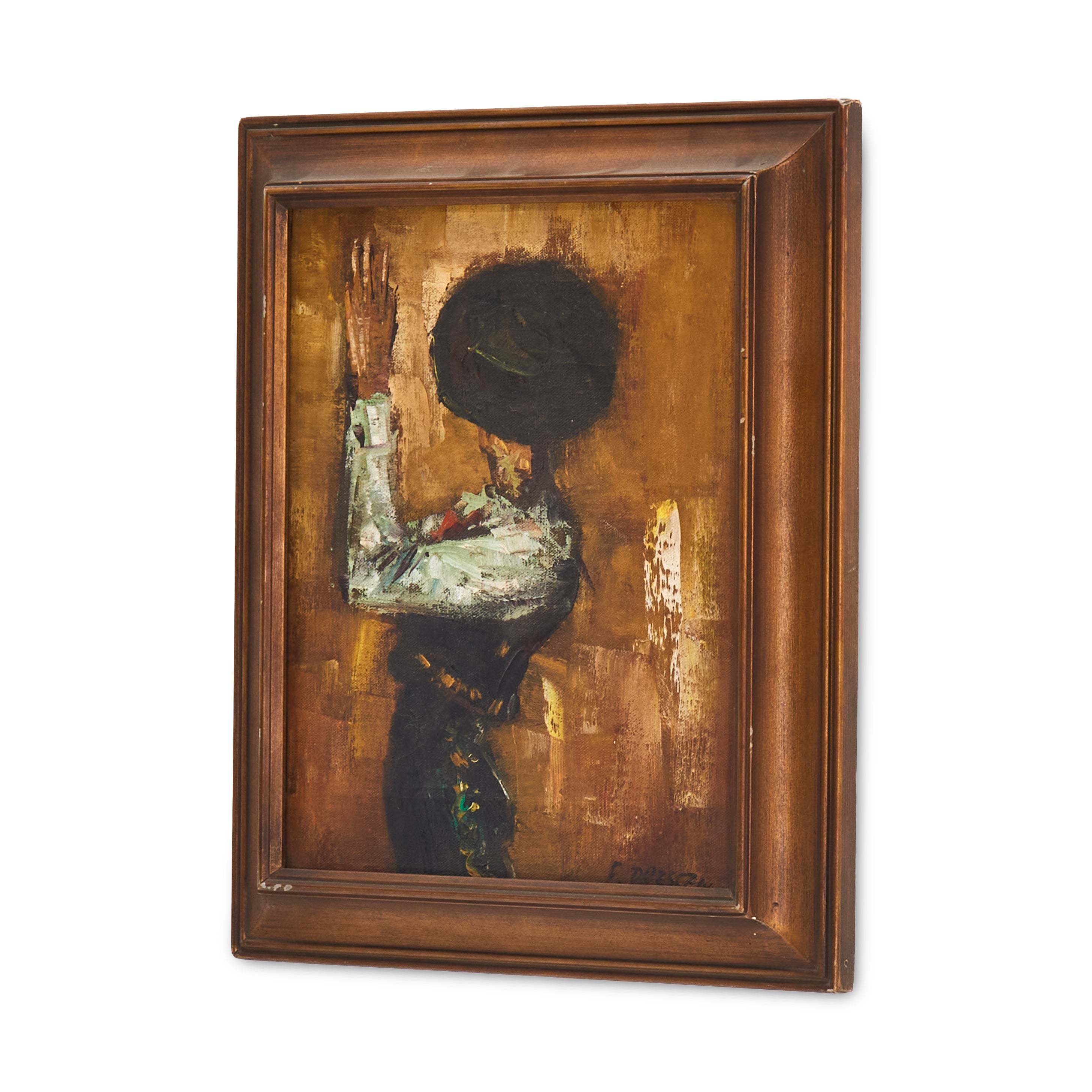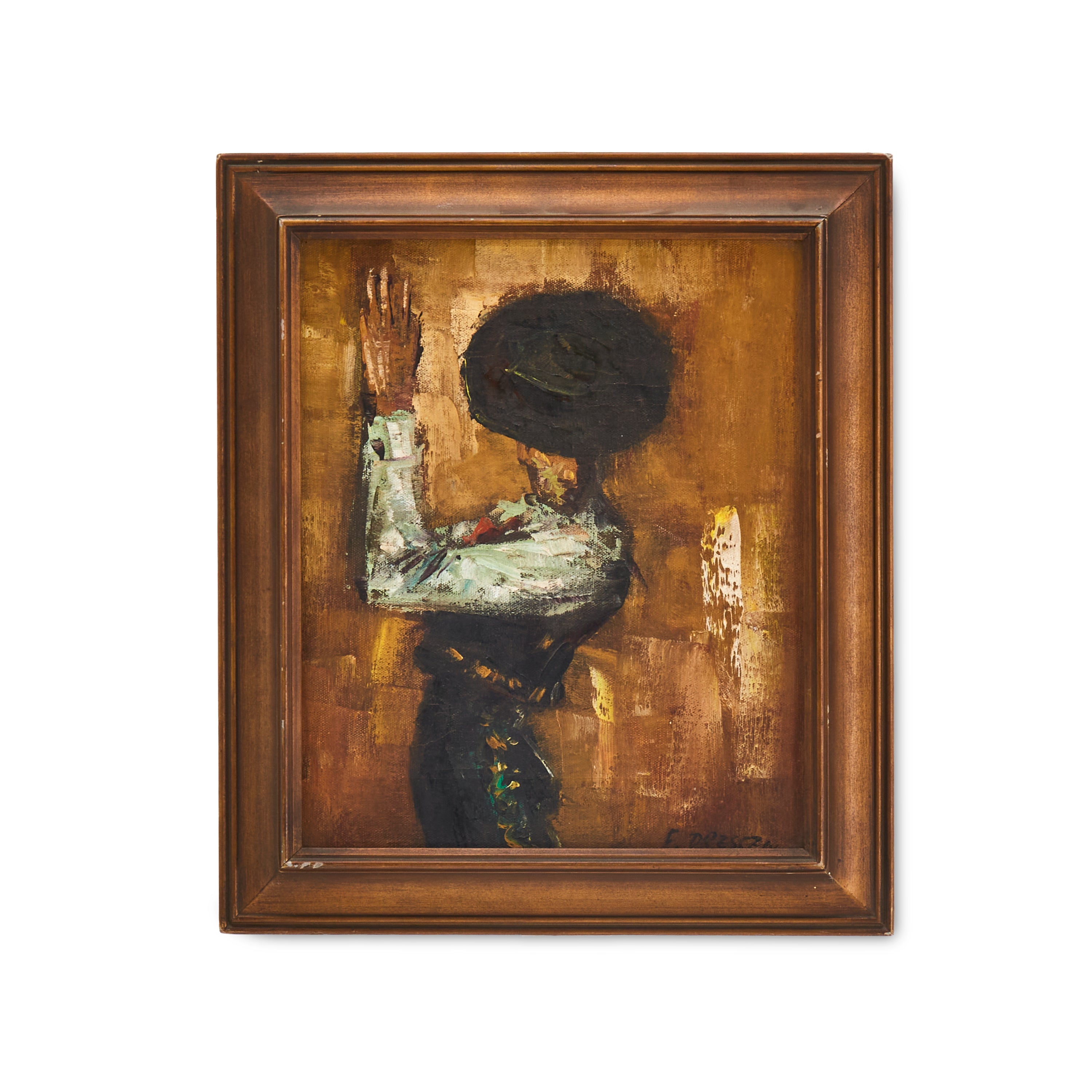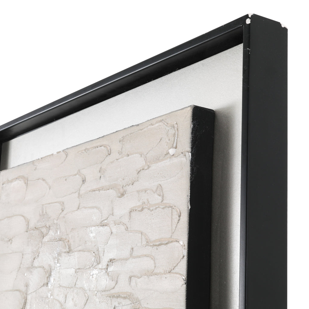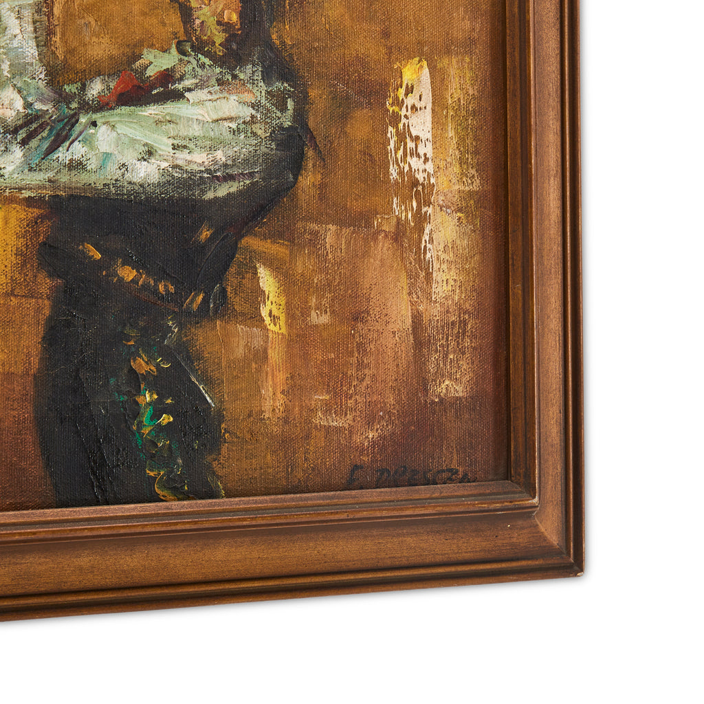 Details: Blue Cadillac-style car driving through an oil-painted California street. Black Wood Frame. Dimensions: 15" H x 15" W Pairs with: 1384 (A+D) Colorful Auto Red (rented...