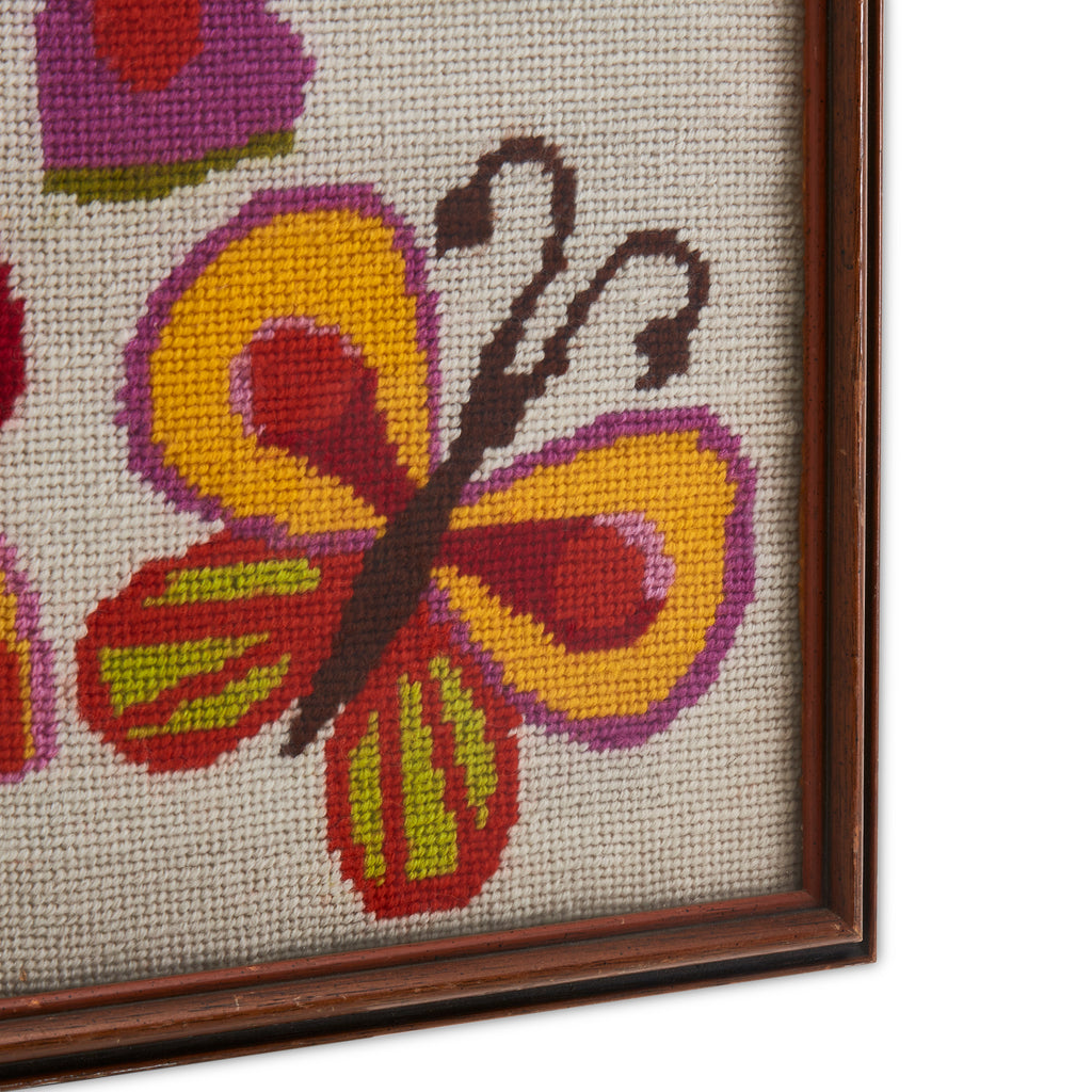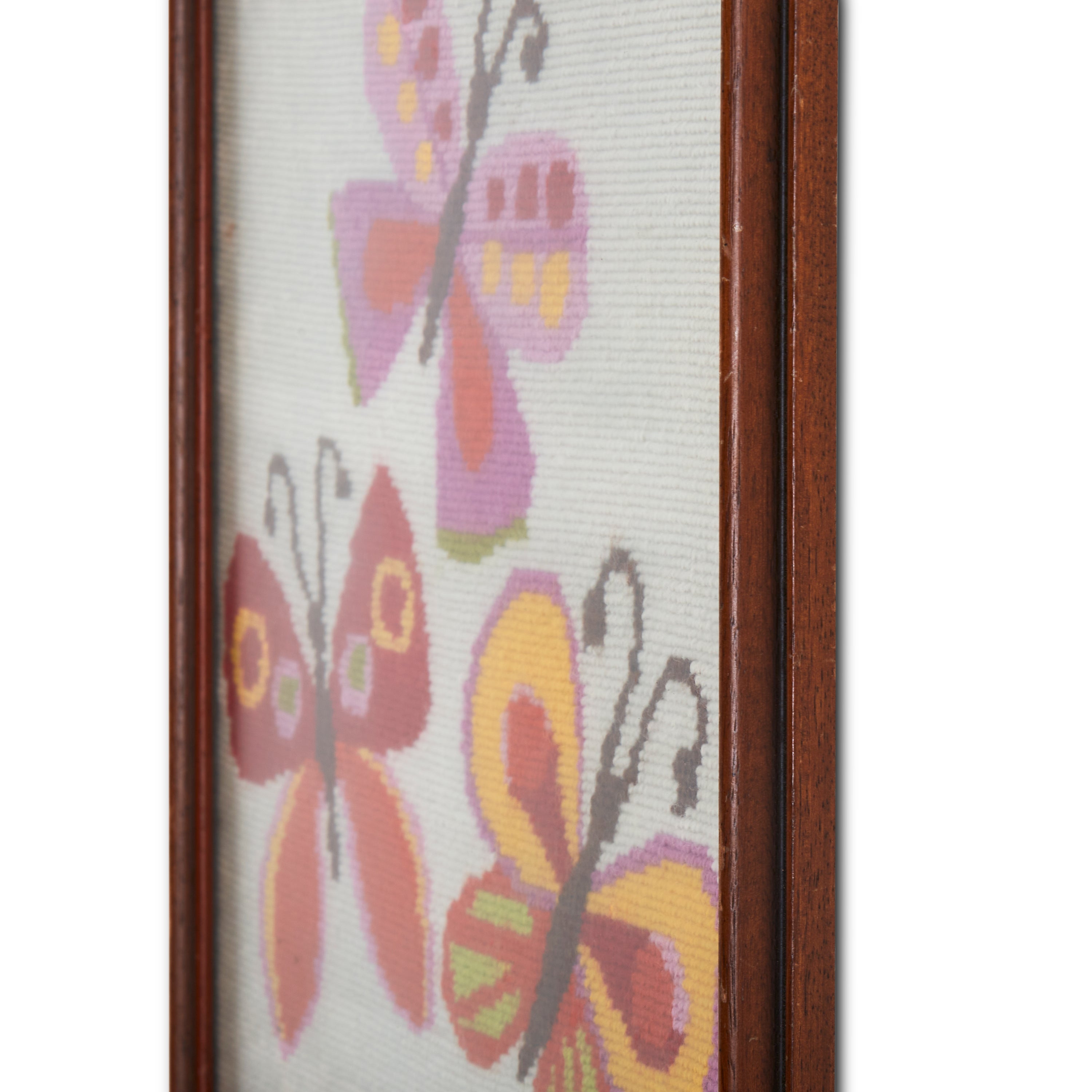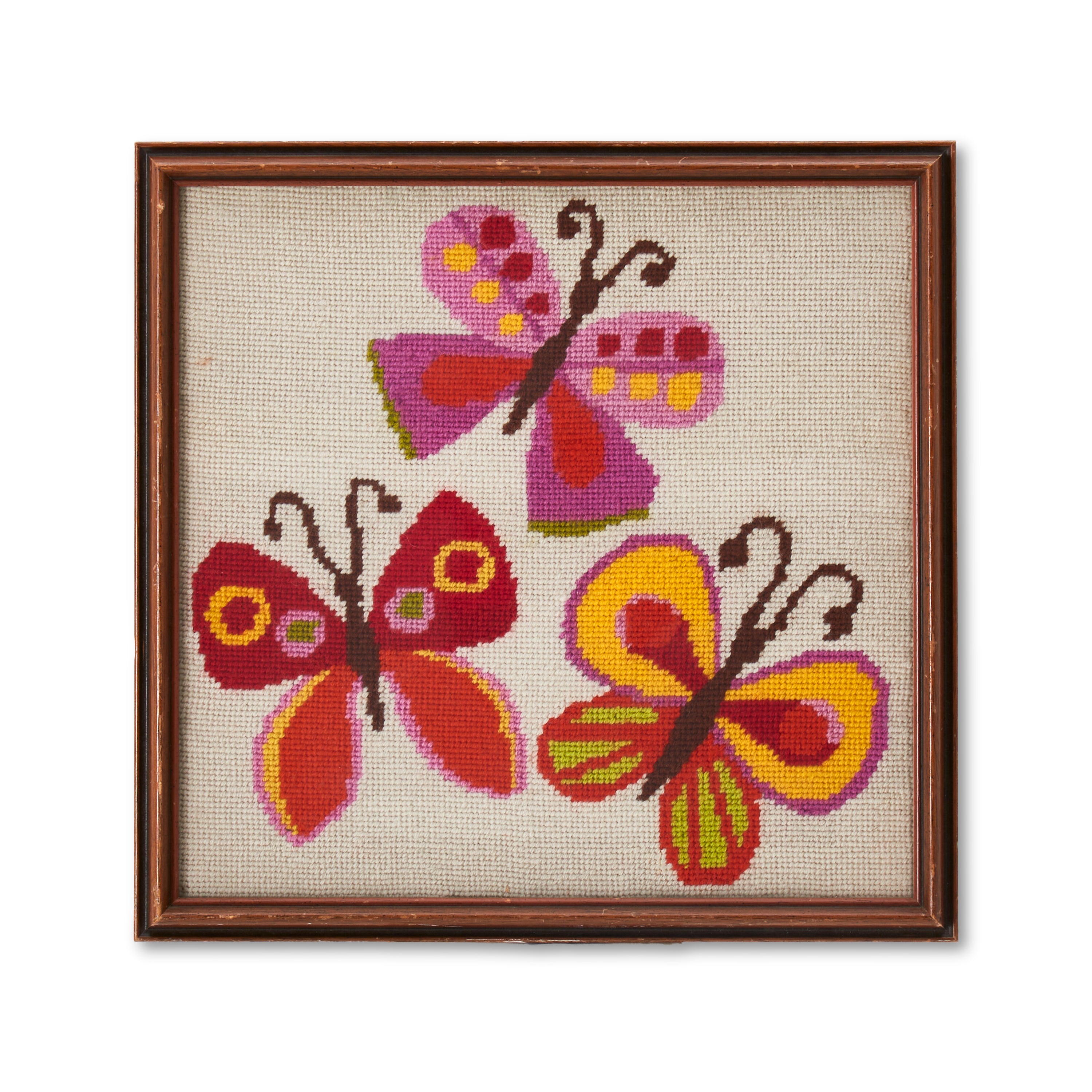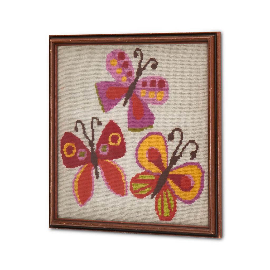Details: Needlepoint artwork of three butterflies in a dark wood frame