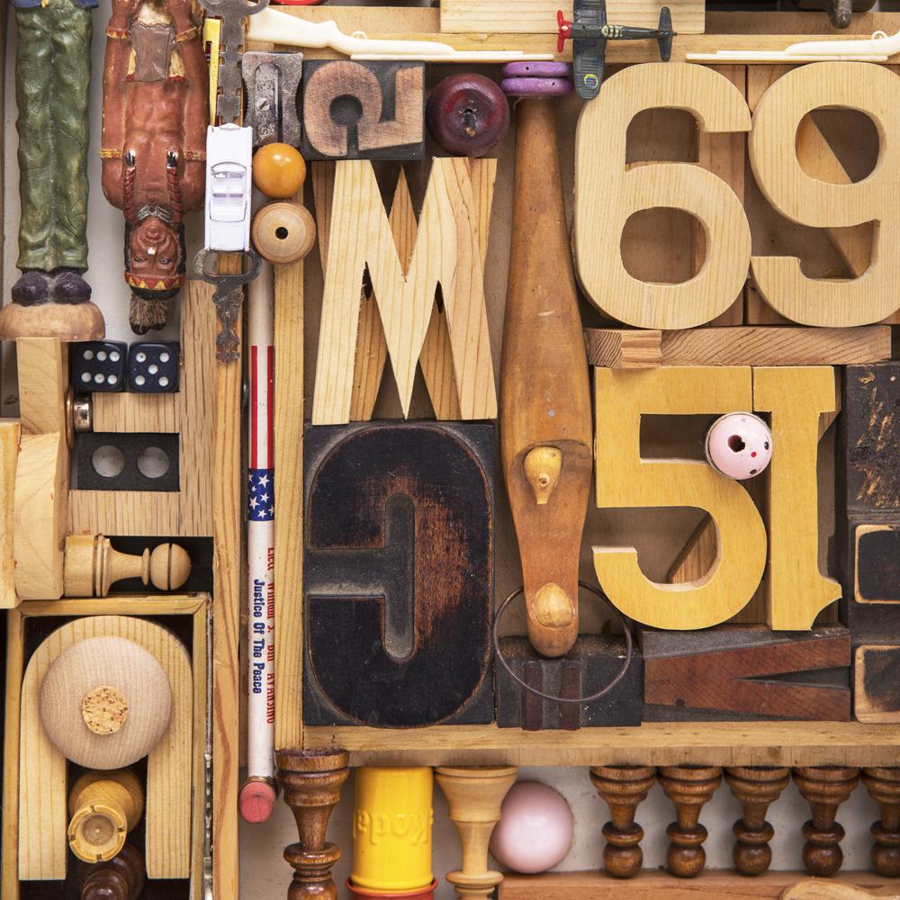 Details: Shadowbox collage in light wood box. Dimensions: 12" W x 20" H