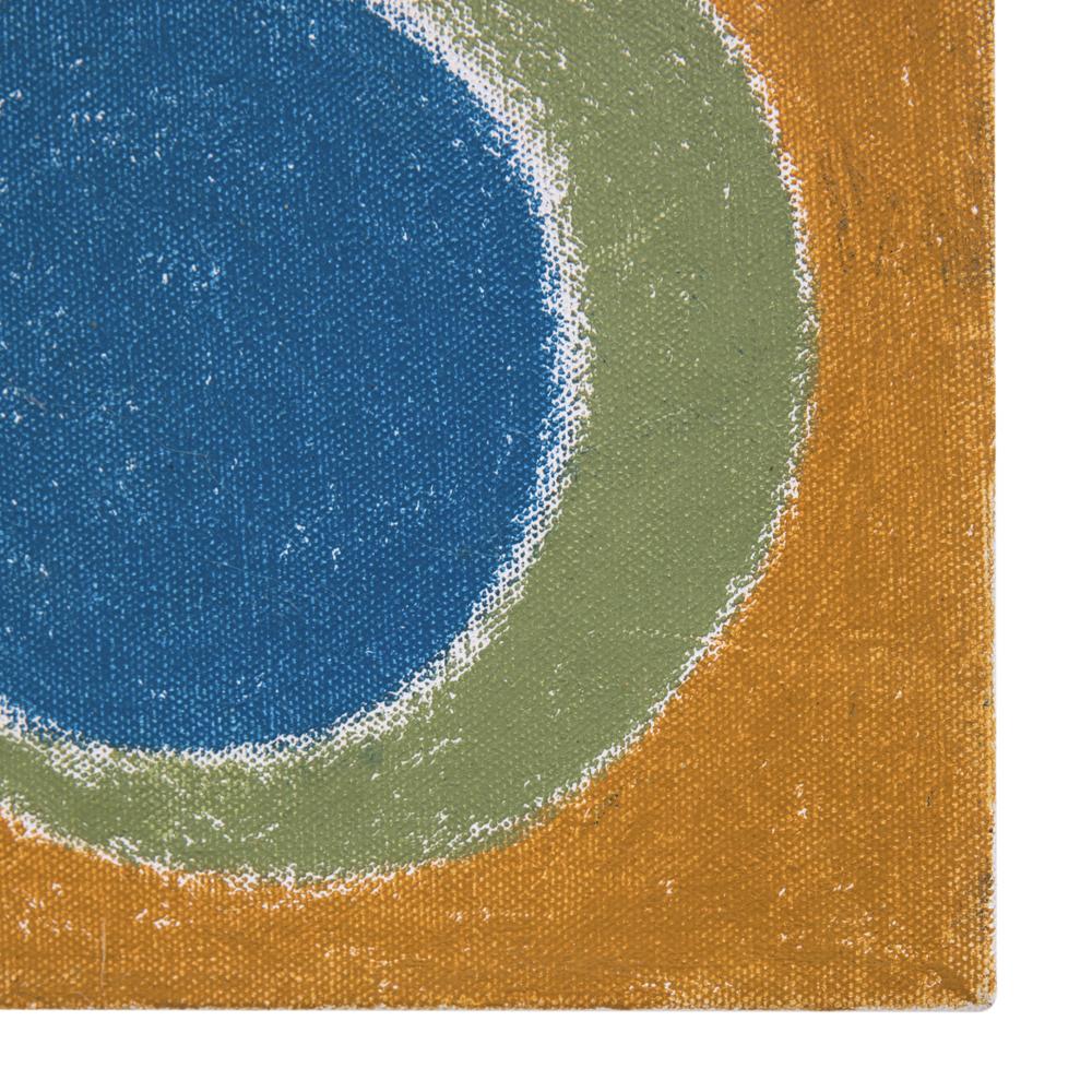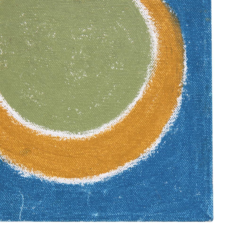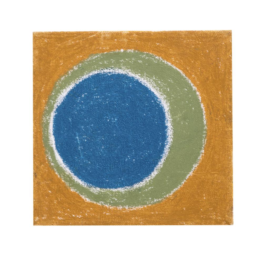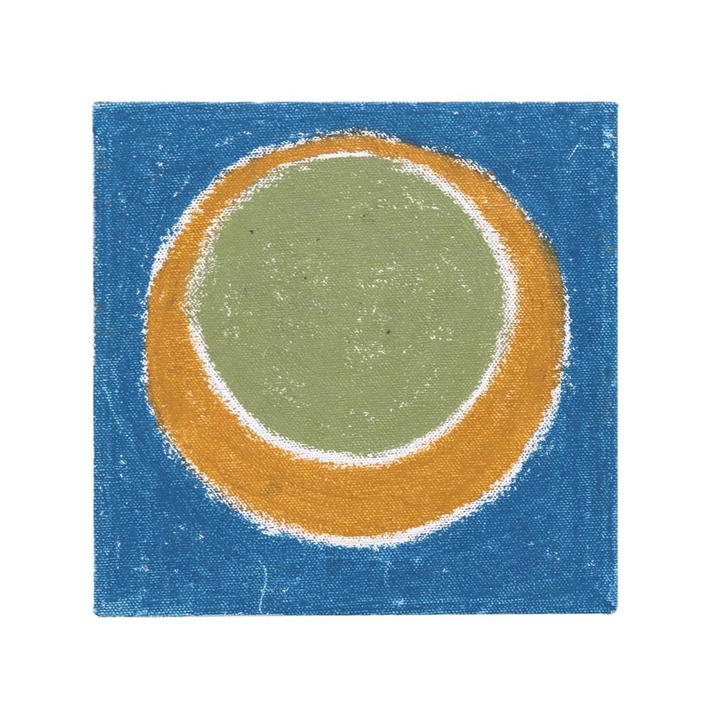 Details: Abstract painting of a yellow and green circle on blue background. Dimensions: 8" x 8"
