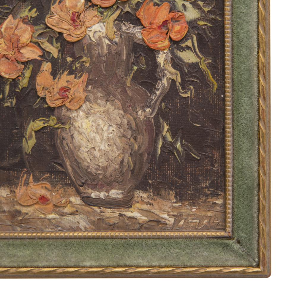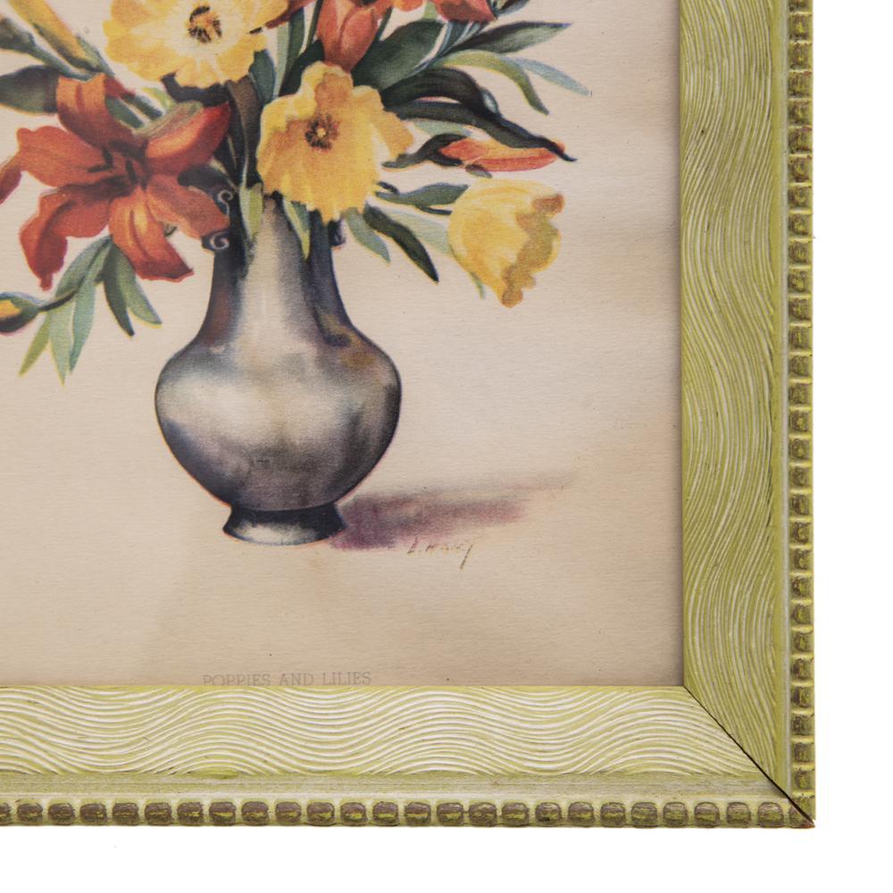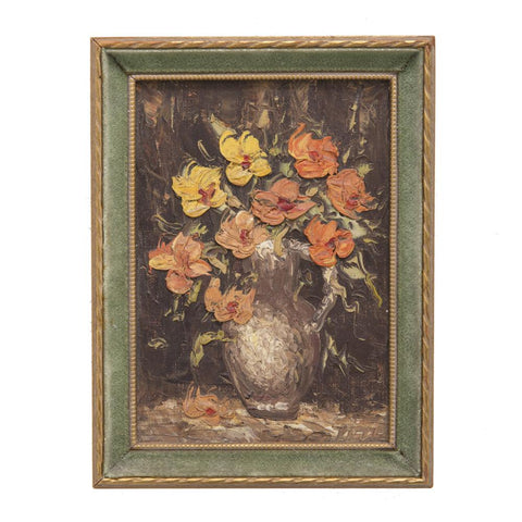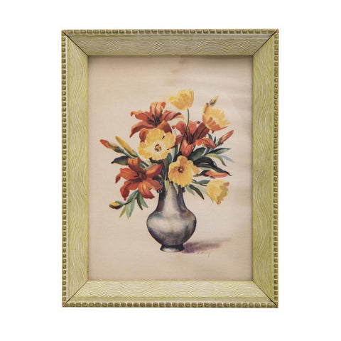 Details: Antique picture of flower with vase in antique green frame. Dimensions:7.5” x 9.5”