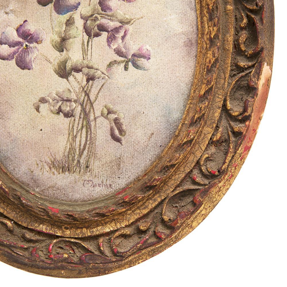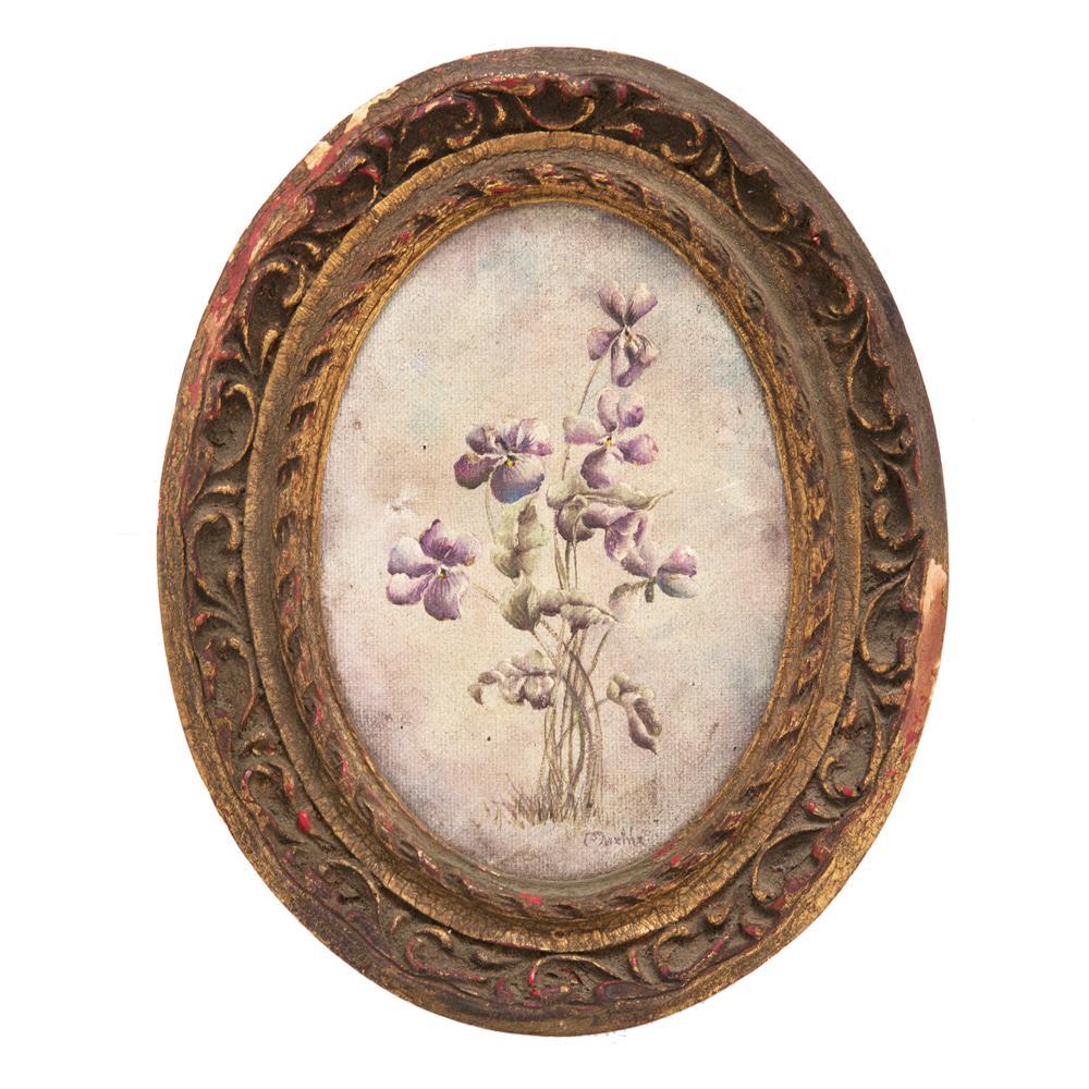 Details: Antique oval picture frame with purple fliers. Dimensions:7.5” x 9.5”