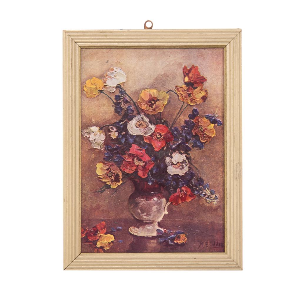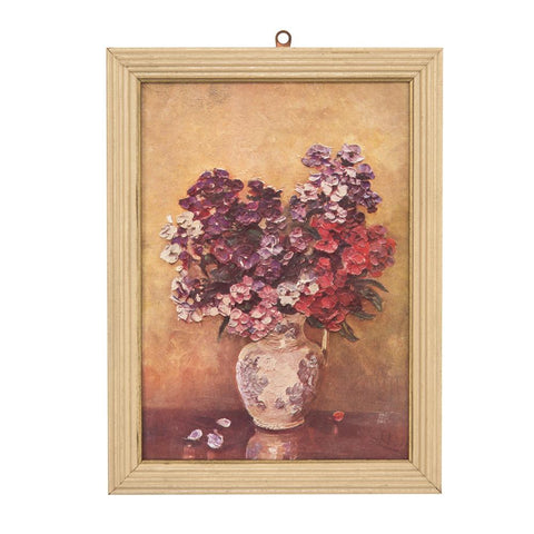 Details: Antique picture frame with peach flowers in vase. Dimensions: 6” x 8”