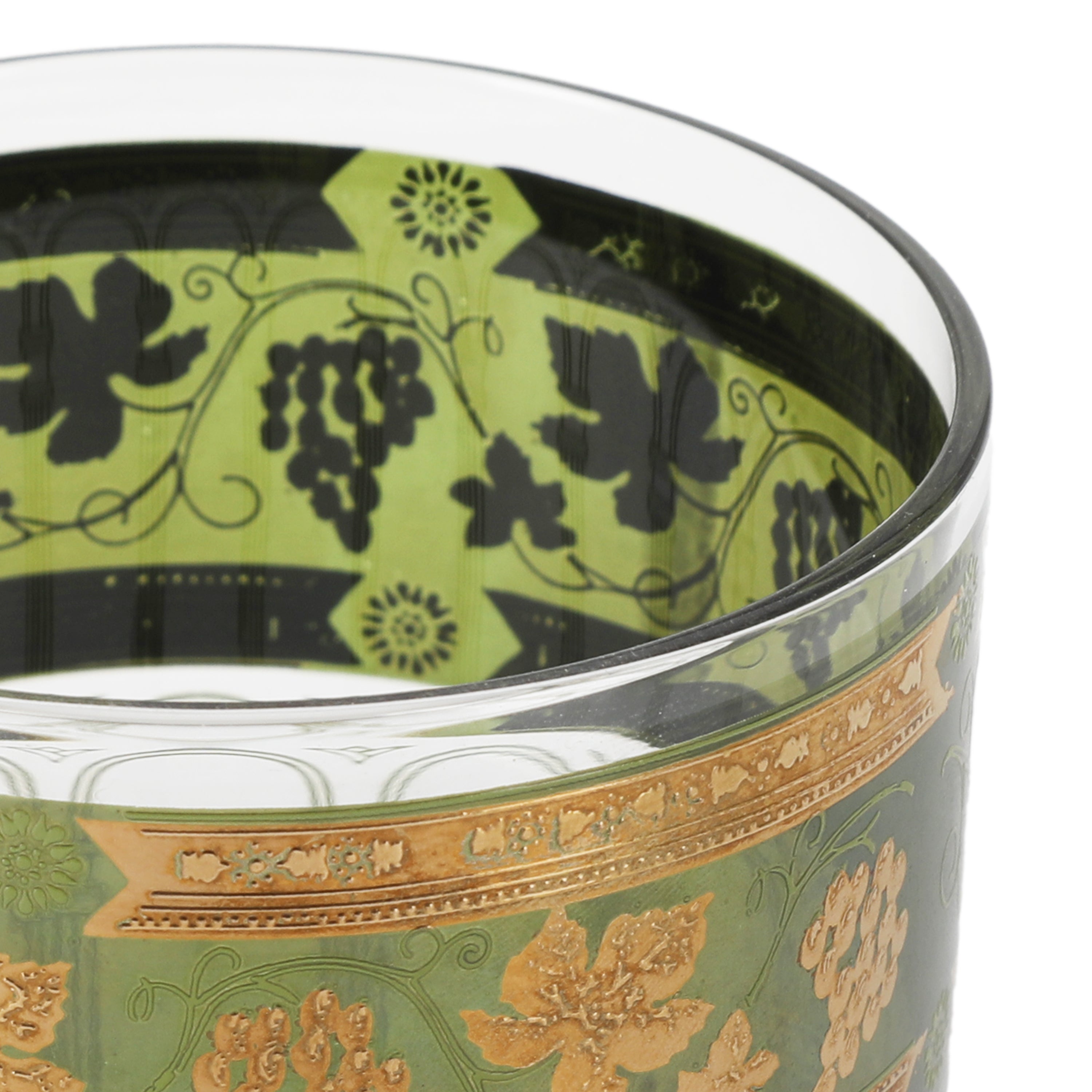 Details: Green cocktail glass / drink ware with golden grapes and leaves on the sides. Dimensions: 3.5" H x 3" D Quantity: 7
