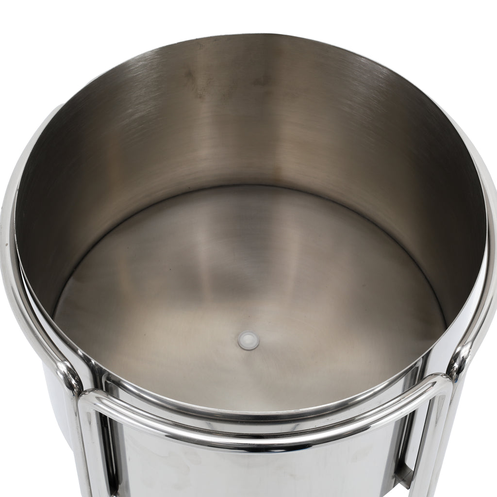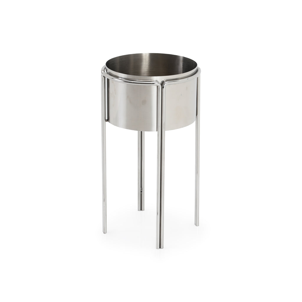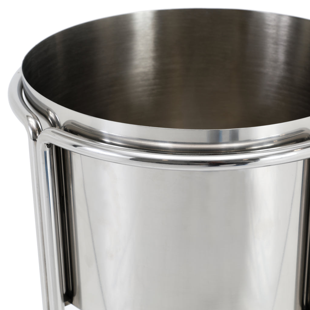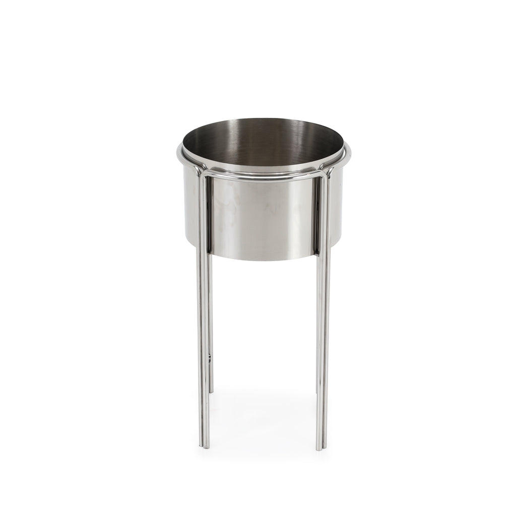 Details: Stainless ice bucket with brushed metal exterior and tube legs. Dimensions: 23" H x 12" D