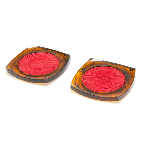 Details: Pair of coasters made of brown stained glass and red fabric swirlDimensions: .25" H X 4" W X 4" D Quantity: 2