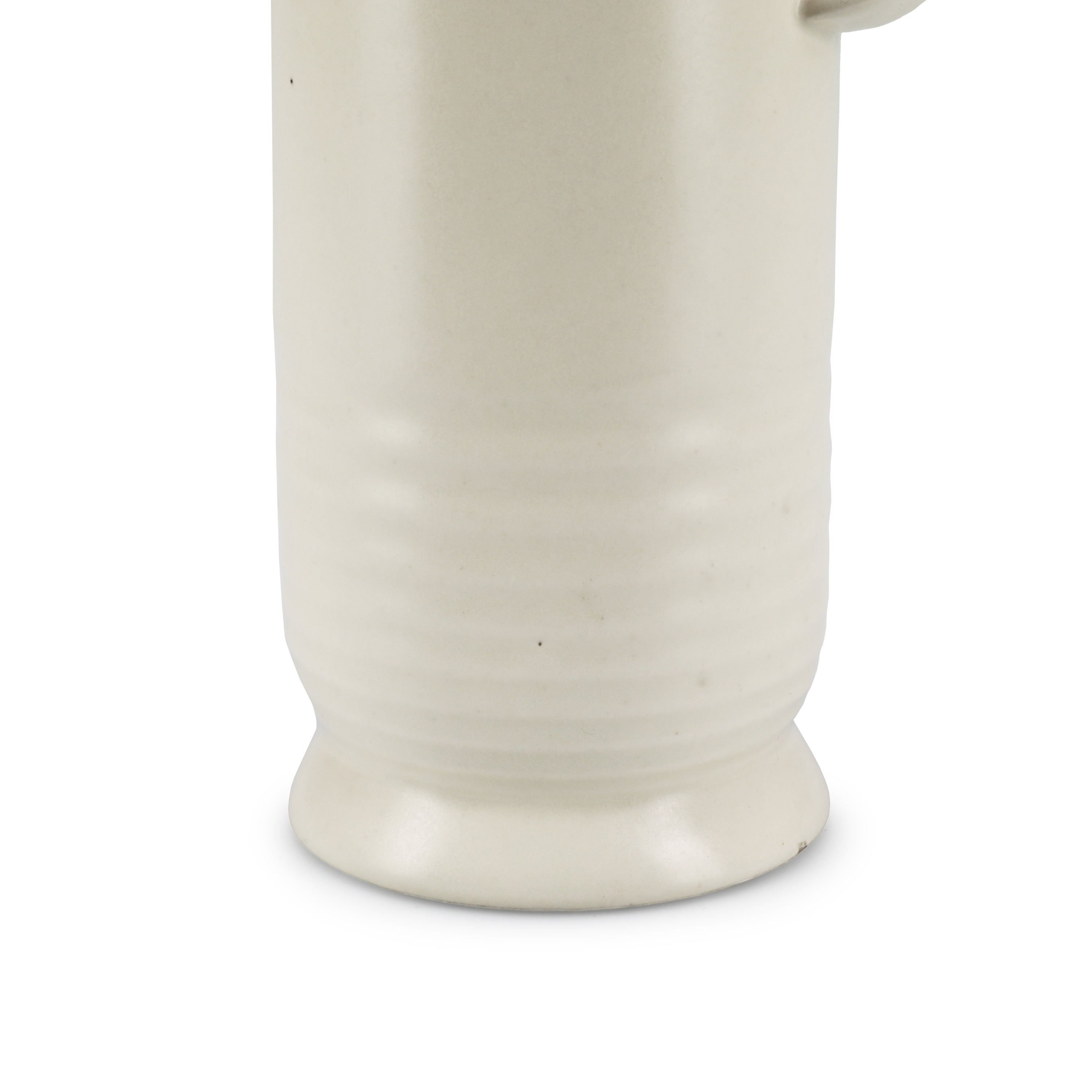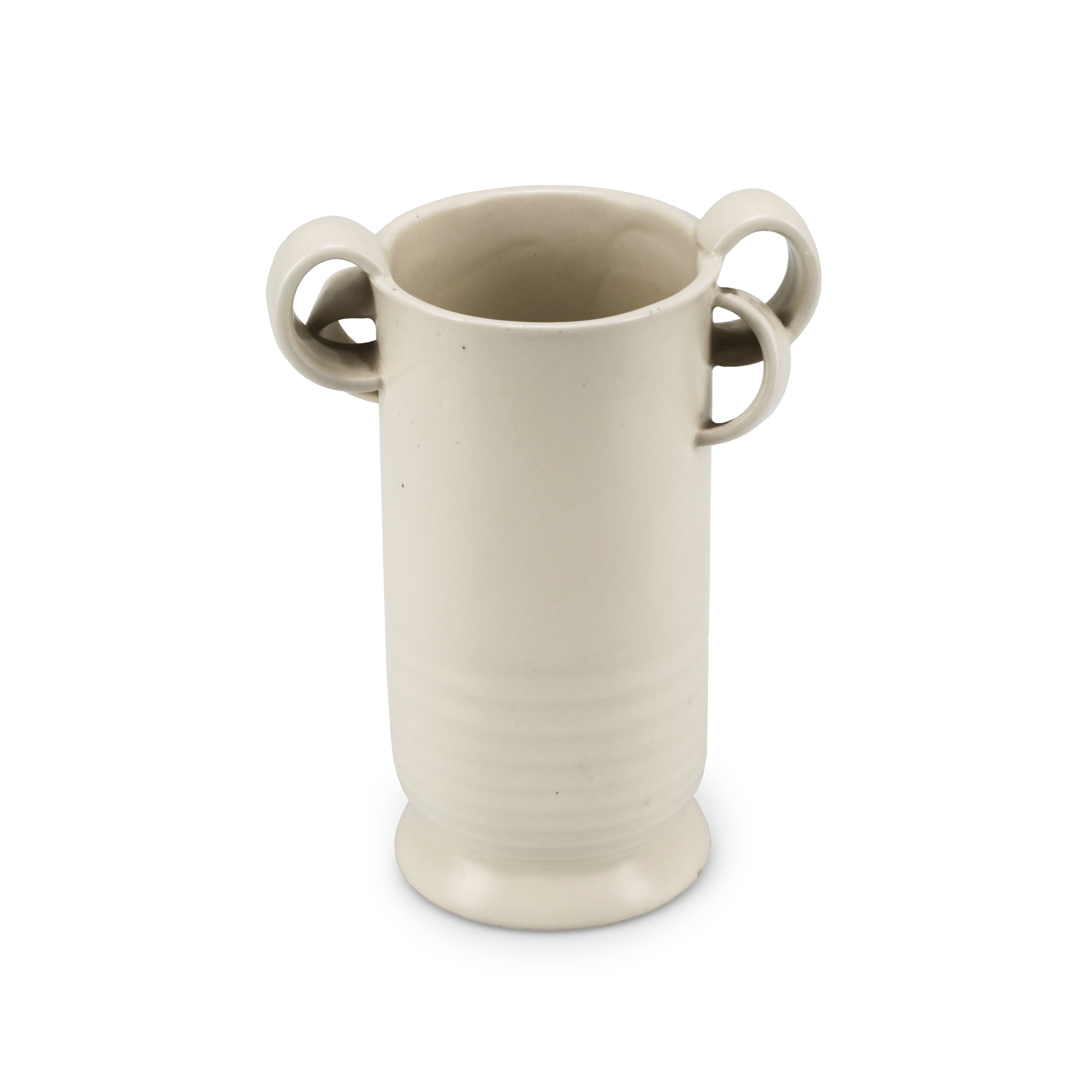 Details: Ceramic vase with various hoop handles on top. Dimensions: 7" H x 6" Diameter
