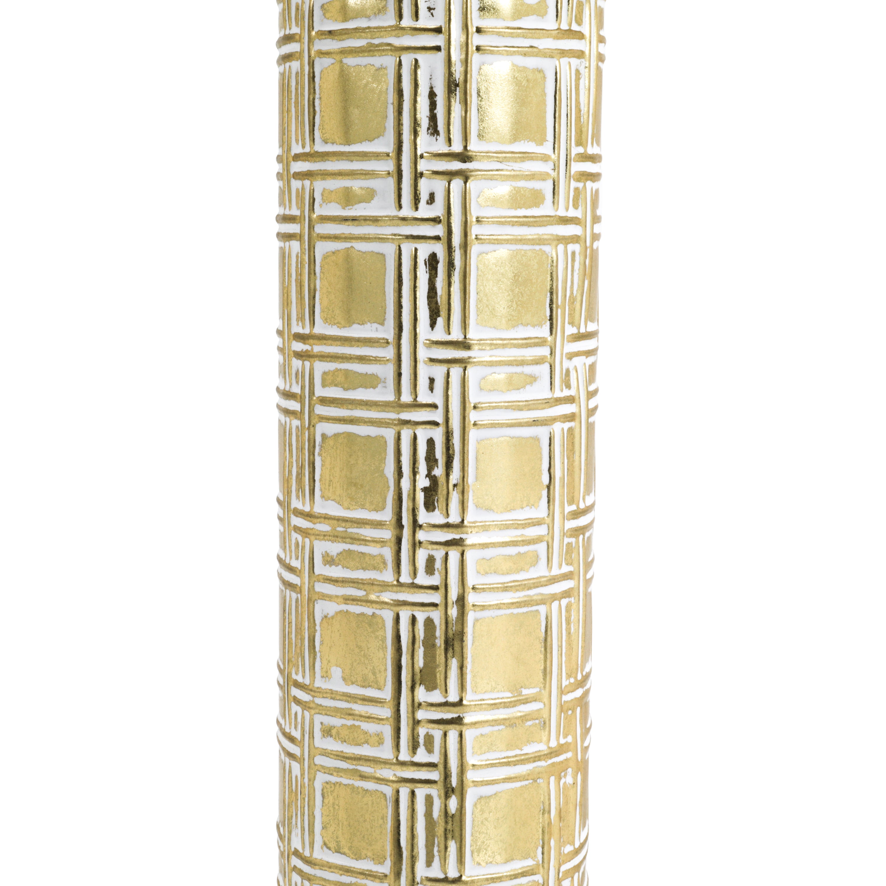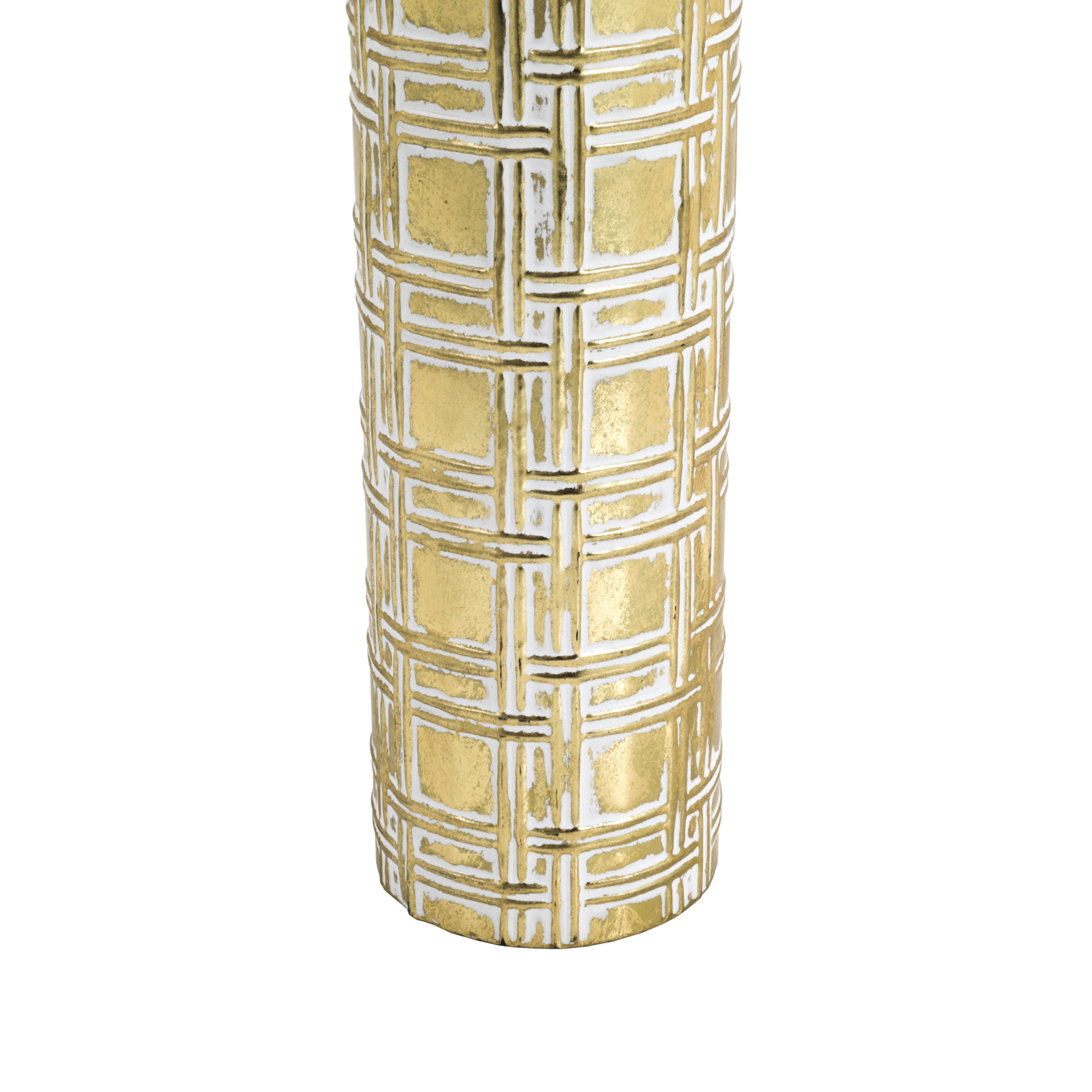 Details: Gold vase with white square pattern on exterior. Dimensions: 35.5" H x 6" D