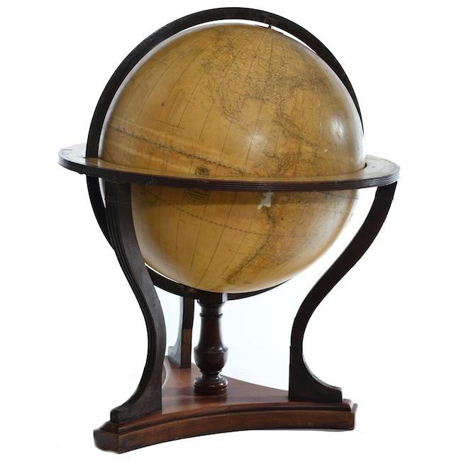 Details: Table top tan globe vintage glove in curved wooden triangular base