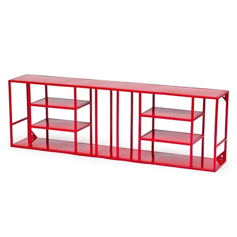 Details: Red Wall Shelving Unit, Metal, Rectangular, Horizontal and Vertical Shelves, Bright, ShelfDimensions: 17" H x 53" W x 9" D