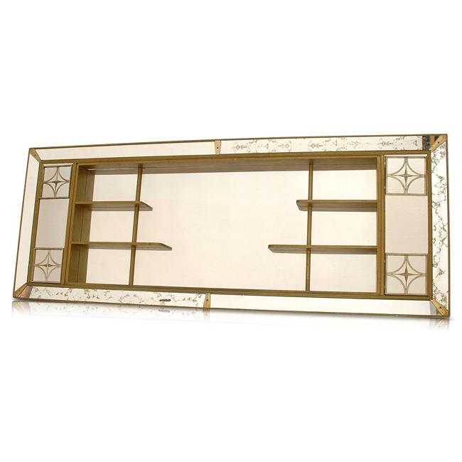 Details: Mirrored hanging shelf with brass and wood frame and shelving components with inlaid textured mirrors and star designs Dimensions: N/A