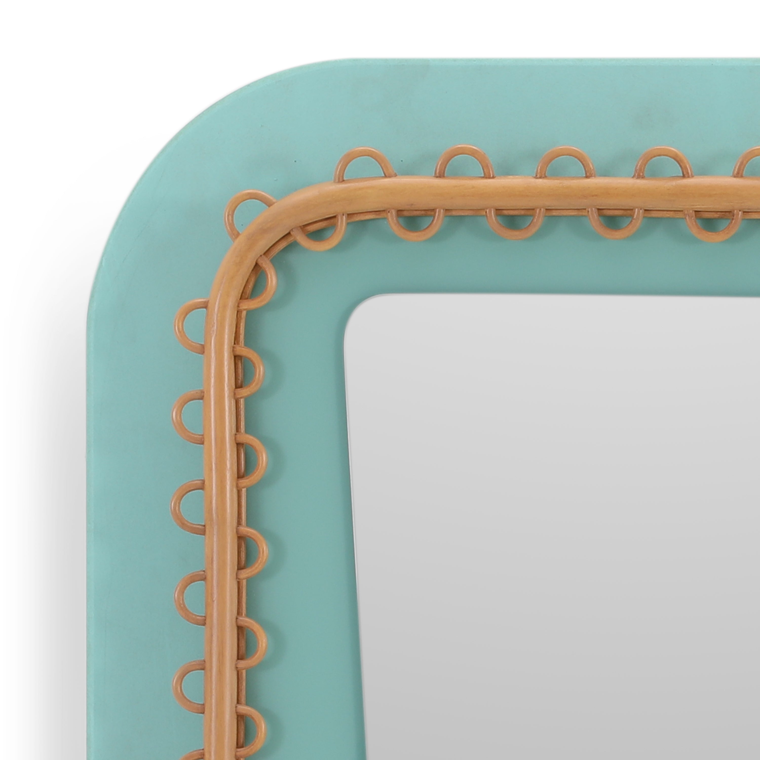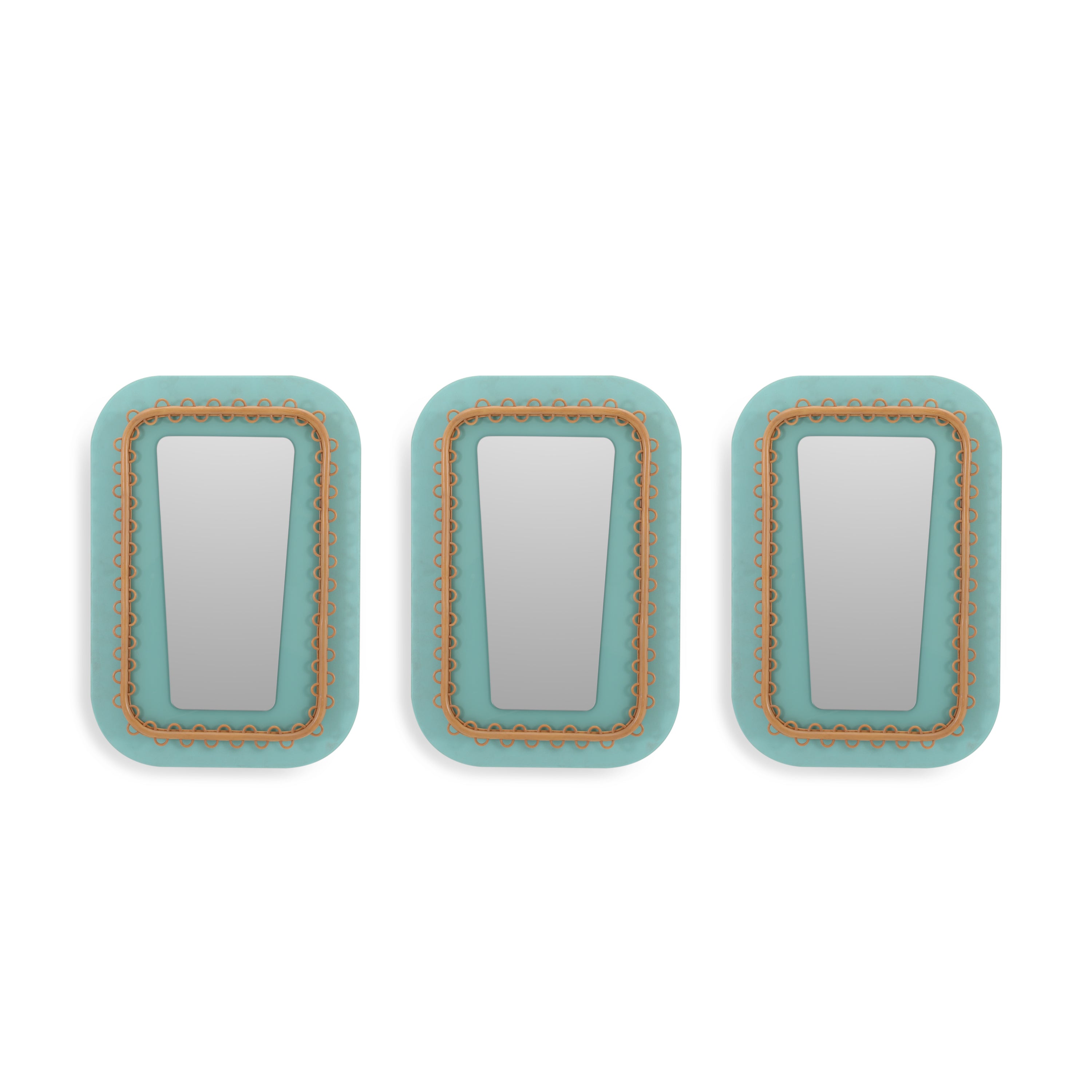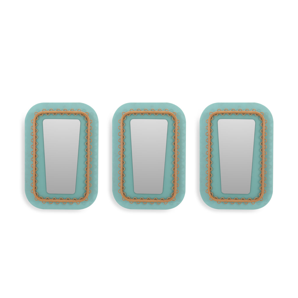 Details: Teal wall mirrors with wooden frames. Quantity: 3